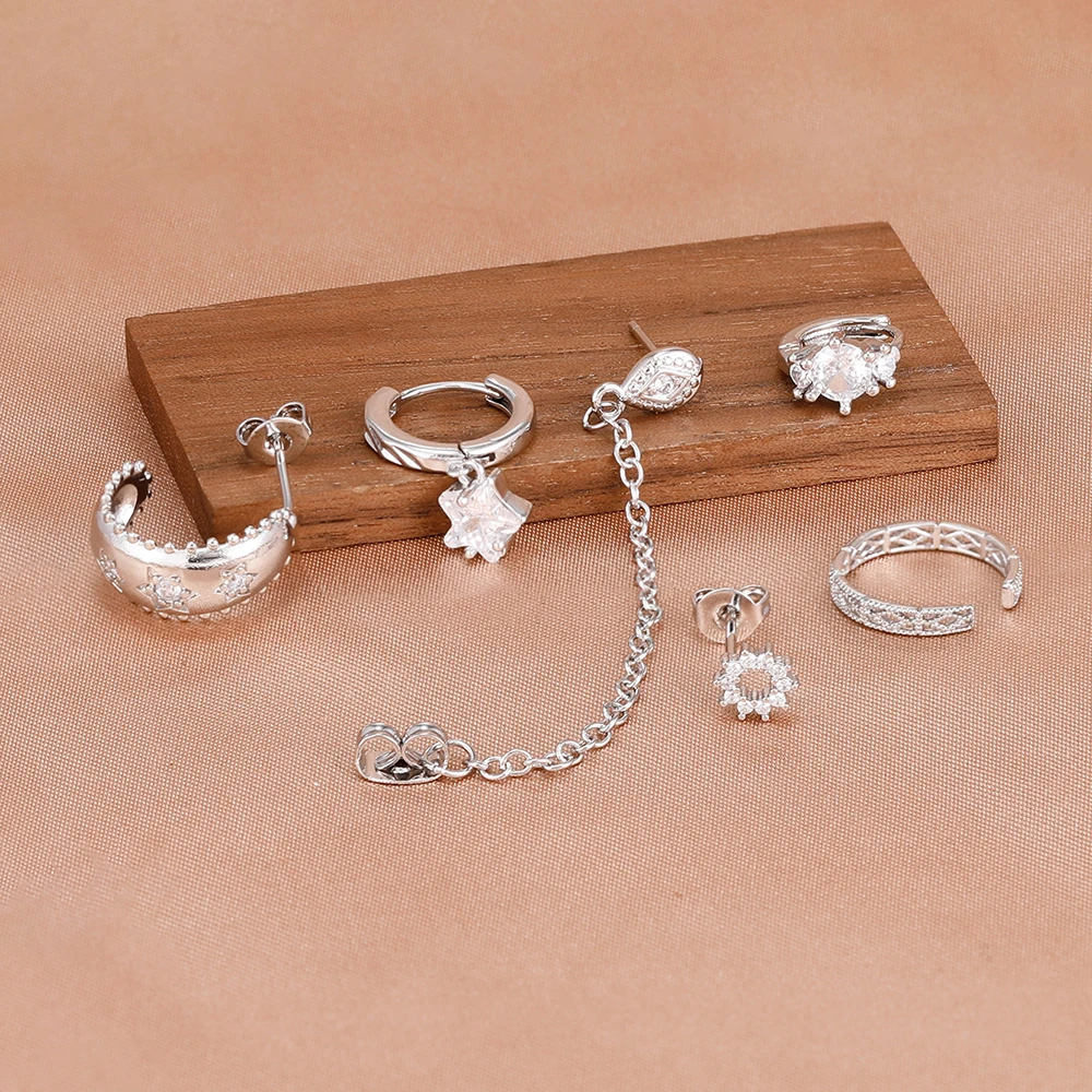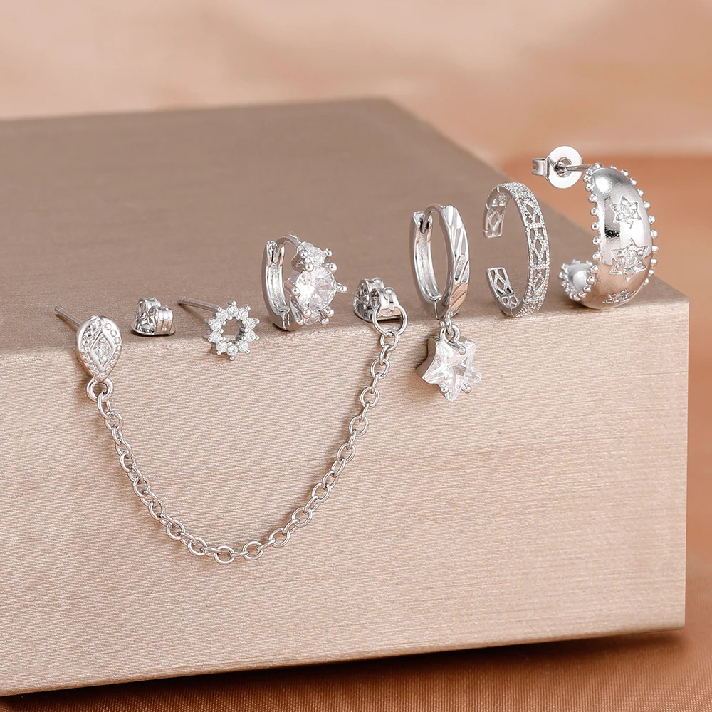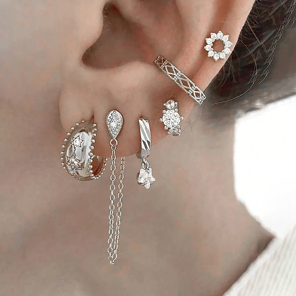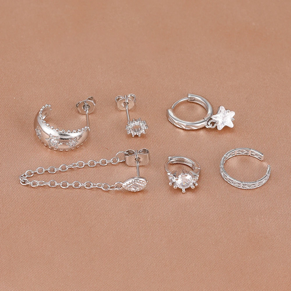 6PCS Stainless Steel 14K Gold Plated Hoop Earrings Set for Women Retro Ear Cuffs Clip Stud Zircon Star Dangle Piercing Jewelry