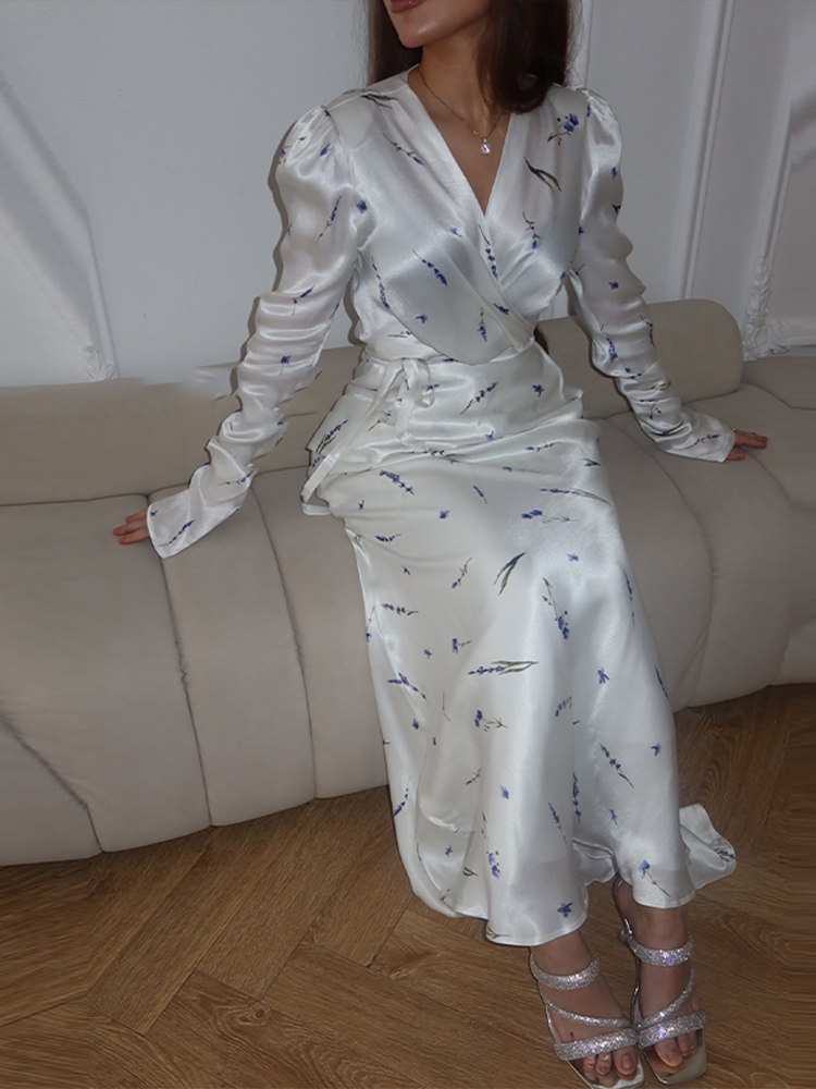 2025 Elegant Women’s White Satin Wrap Dress V-Neck Flared Sleeves Belted Summer Floral Print Mermaid Hem Evening Formal Outfit