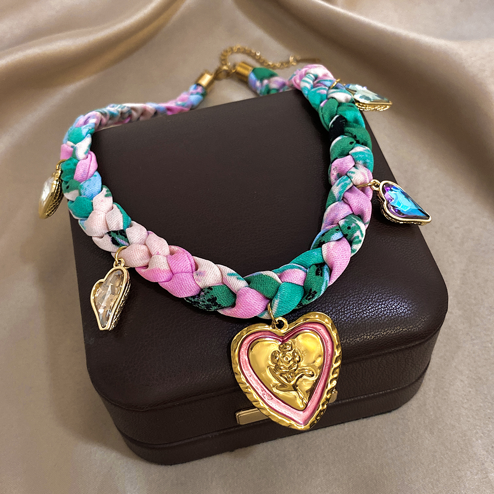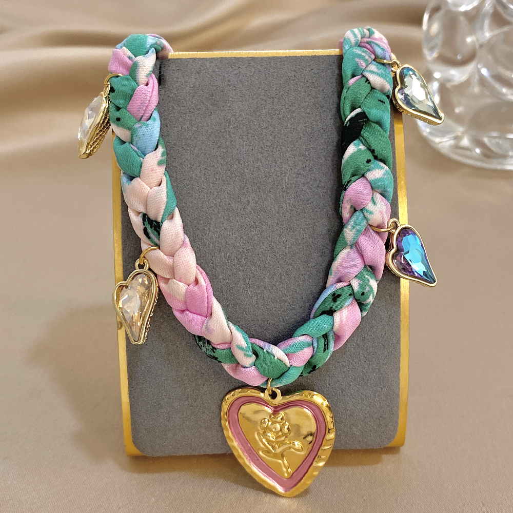 Greatera Rose Heart Pendant Fabric Rope Necklace Summer Colorful Cubic Zircon Filled Decoration Stainless Steel Women’s Jewelry