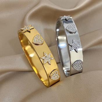 Exquisite Rhinestone Heart Star Wide Bracelet Glossy Gold Silver Color Stainless Steel Cuff Bangle Bracelets Waterproof Jewelry
