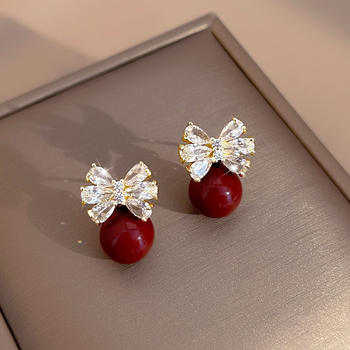 Fashion Crystal Zircon Bow Knot Stud Earrings For Women Elegant Flower Pearl Rhinestone Red Earring Party Christmas Jewelry Gift
