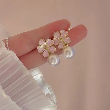 Sweet Pink Enamel Flower Drop Earrings For Women Korean Elegant Imitation Pearl Flowers Dangle Earring Party Christmas Gift