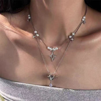 Romantic Bilayer Asterism Pendant Necklace for Women Sparkling Rhinestones Star Heart Bead Choker Y2K Accessories Fine Jewelry