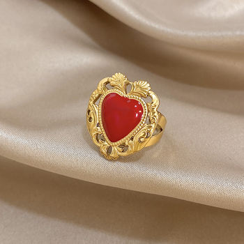 Greatera Retro Heart-shaped Red Oil-dripping Ring Classic Personality Geometry Hollow Creative Design Women’s Jewelry Party New