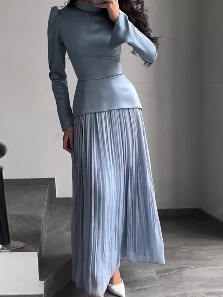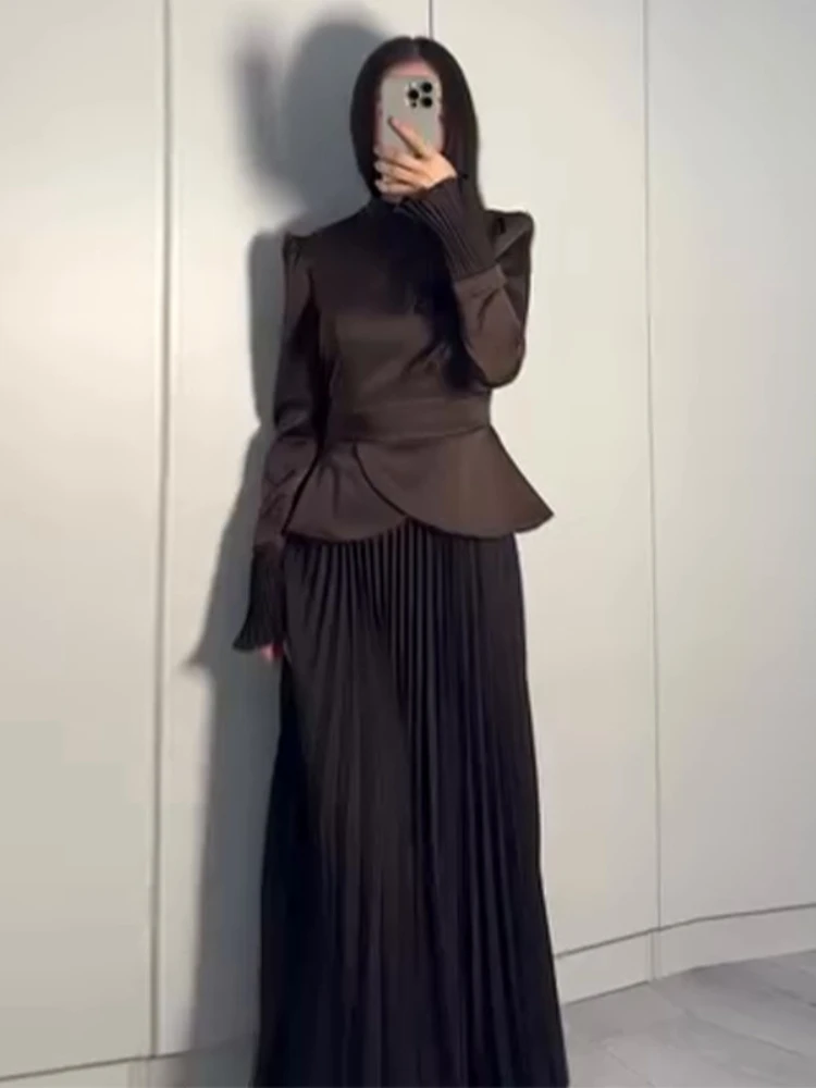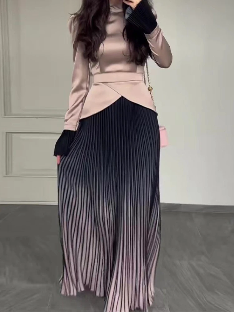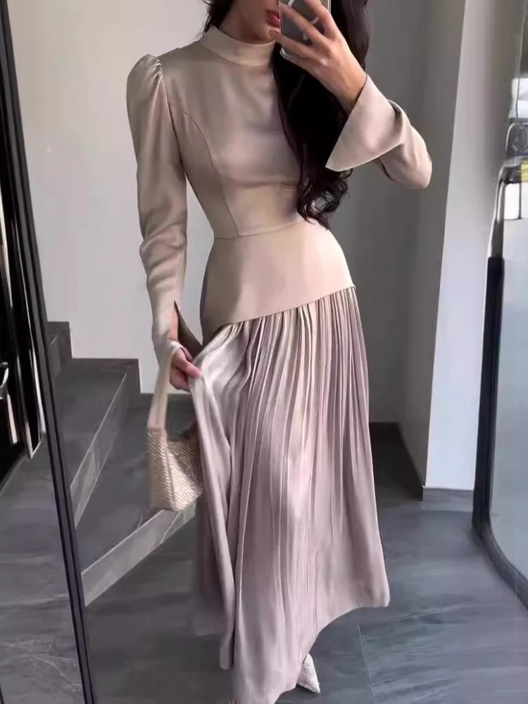 Autumn New Patchwork Women’s Dress Elegant Fake Two Piece Pleated Dresses Contrast Fashion Clothing Long Sleeves Female Wear