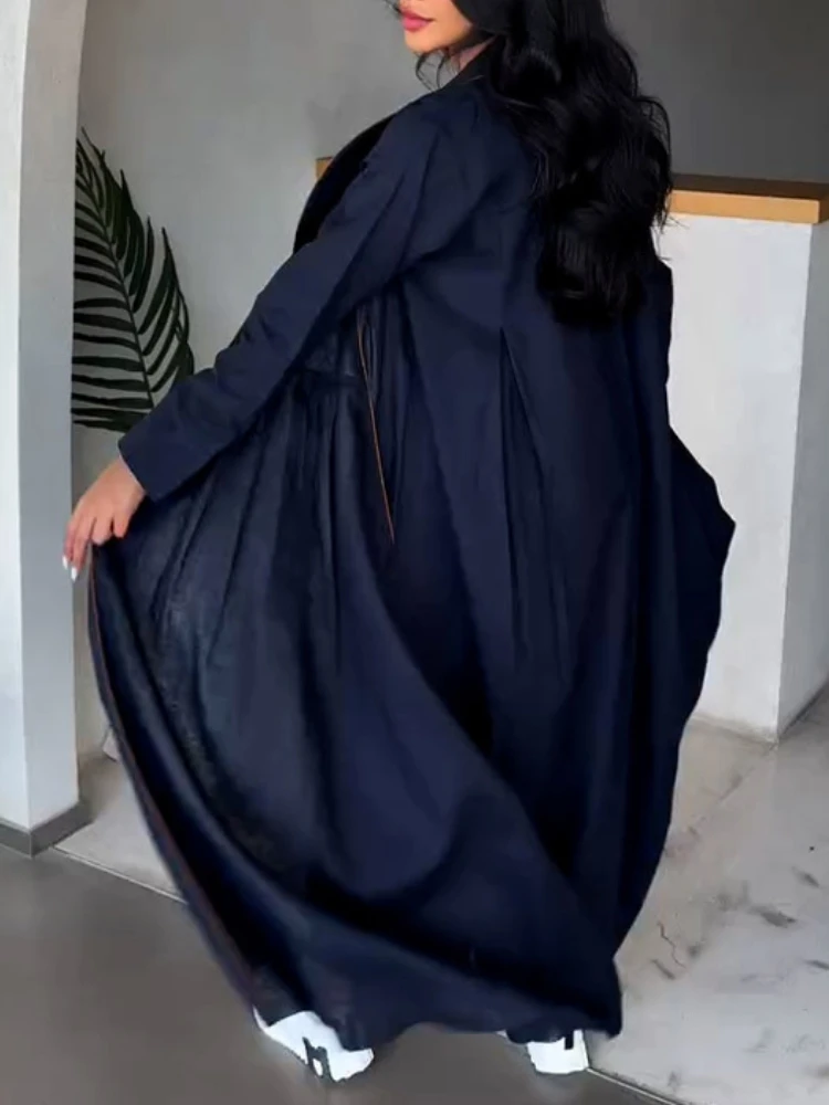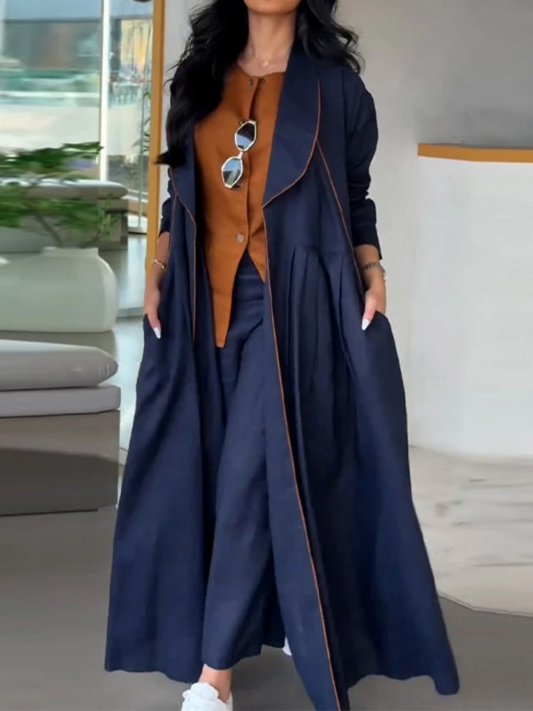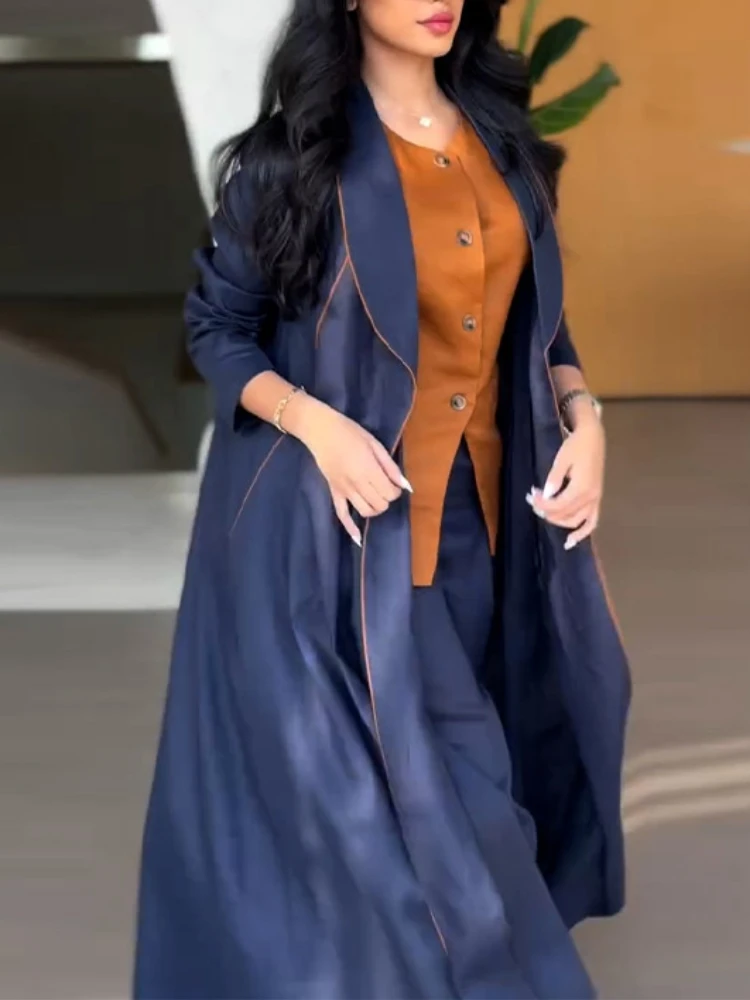 Autumn New Windbreaker Coat Women Fashion Contrast Trim Open Front Cardigan Loose Fit Pockets Pleated Long Trench Coats Clothing