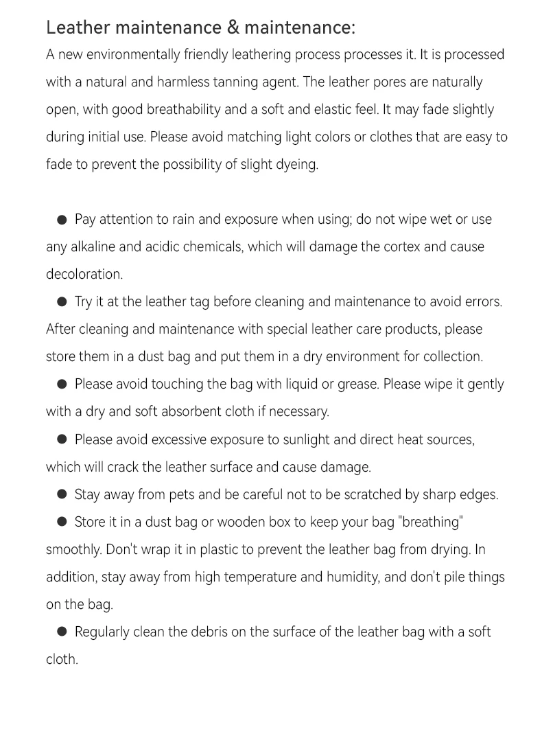 This bag is made of high-quality cowhide, the cowhide coating used is light and thin, the leather surface is entirely different from the artificial leather artificial processing properties, fully retains the original characteristics of leather, it doesn’t defect, you can choose not to buy it if you mind the natural marks; at the same time, the natural cowhide’s features make the leather have highly valued. Natural cowhide has better breathability, tactile toughness, and plasticity; they are used in the environmental craft; the products from this craft process are durable and have a specific collection value.