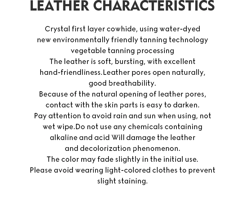 This bag is made of high-quality cowhide, the cowhide coating used is light and thin, the leather surface is entirely different from the artificial leather artificial processing properties, fully retains the original characteristics of leather, it doesn’t defect, you can choose not to buy it if you mind the natural marks; at the same time, the natural cowhide’s features make the leather have highly valued. Natural cowhide has better breathability, tactile toughness, and plasticity; they are used in the environmental craft; the products from this craft process are durable and have a specific collection value.