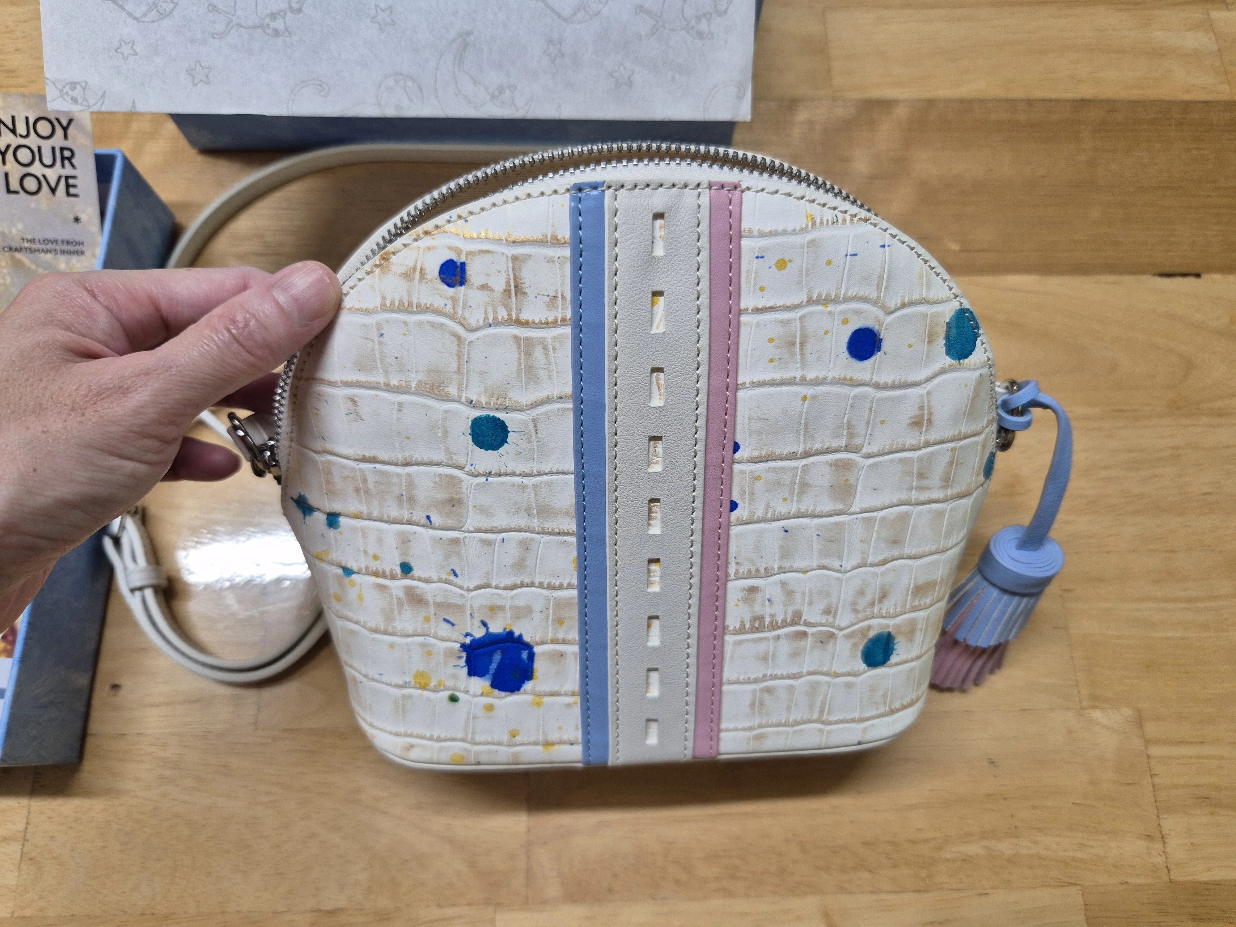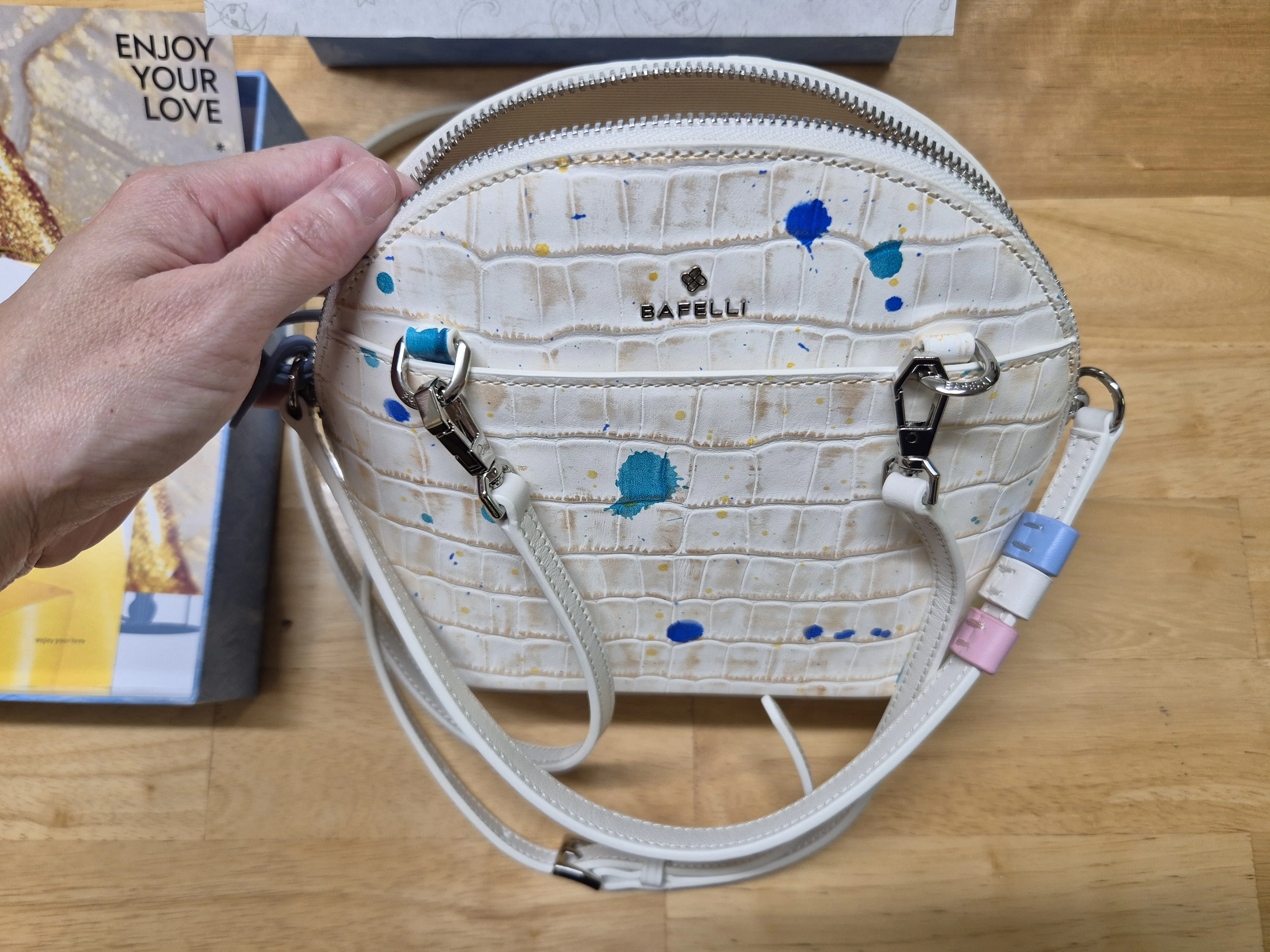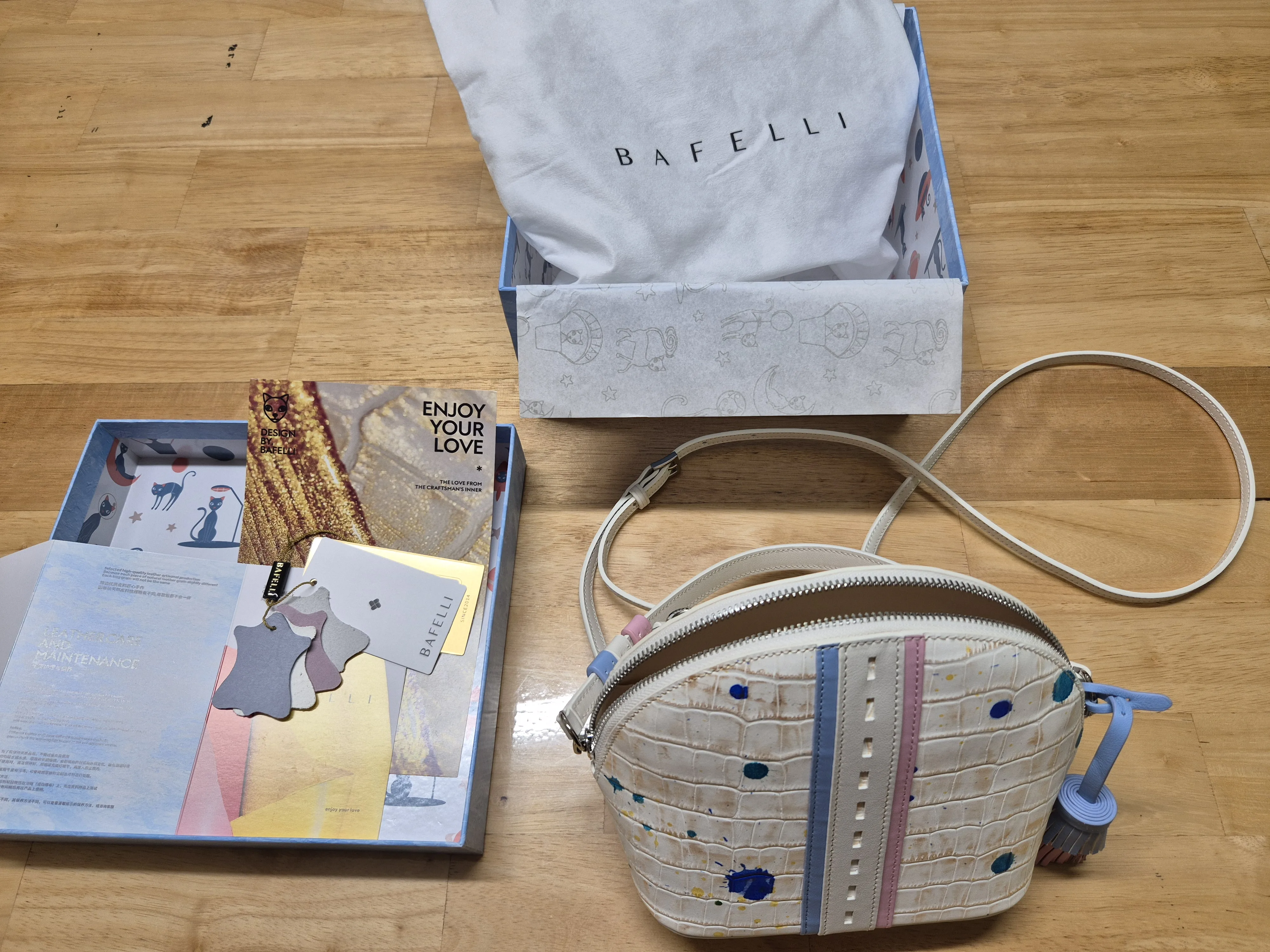 Oh. My. God. This cute little bag is uttterly gorgeous! The craftsmanship is exquisite. Absolutely love the original design! It was so well-packaged. Air cushion on the outside to prevent the box from being crushed during transit, then a thin cardboard box, then the high-end hard blue bafelli box the bag comes in and then it's own little dust-protective drawstring cloth bag. Wow. Inside the bafelli box are the care instructions and leather samples used to make the bag. So high-end. Just the unboxing alone deserves its own unboxing tik tok video by some influencer or something. My only gripe is that the zip is not as smooth as shown in the video. If i can afford it, i definitely won't hesitate in buying anything else i like from this brand.