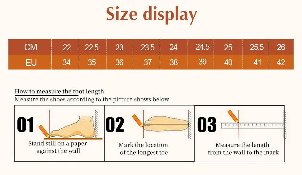 Size Tip:Please Measure your feet length before place the order, then refer to the size chart to choose the size according to your feet length.