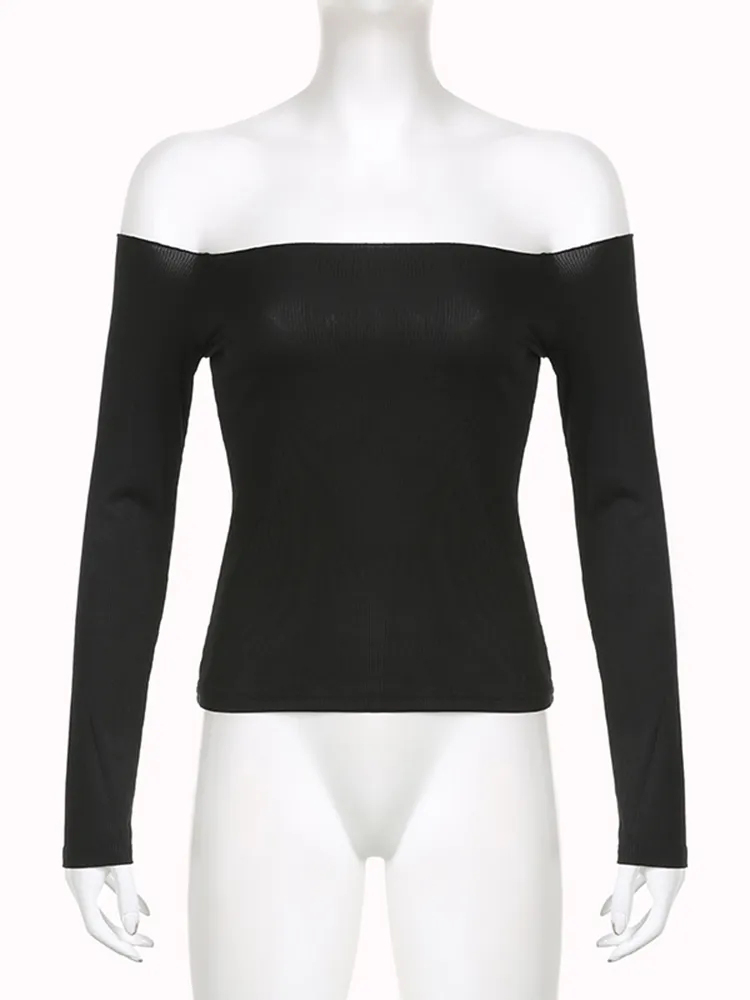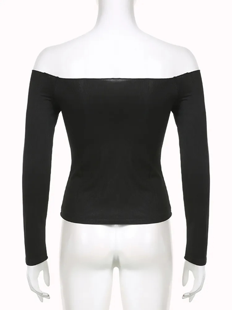 Black Solid Slash Neck Elegant Long Sleeve Tops Korean Fashion Slim Sexy Cropped T Shirt Women Fall Clothing