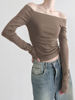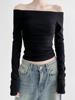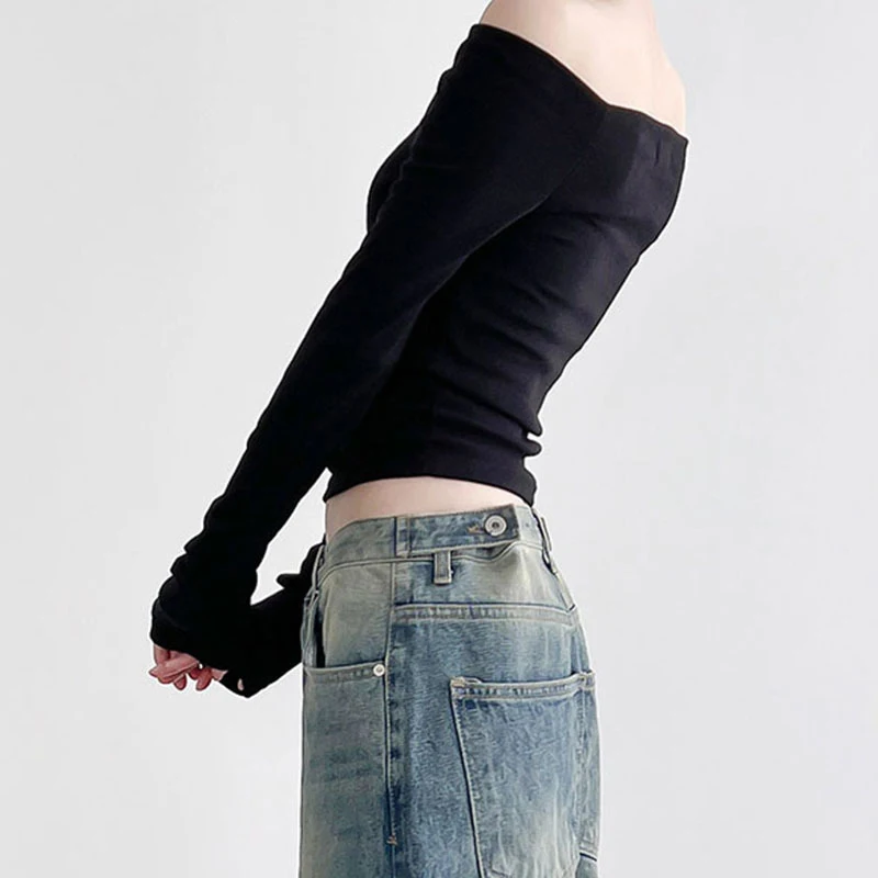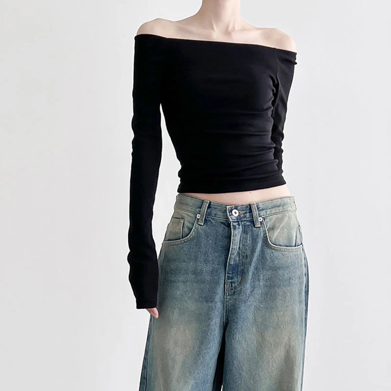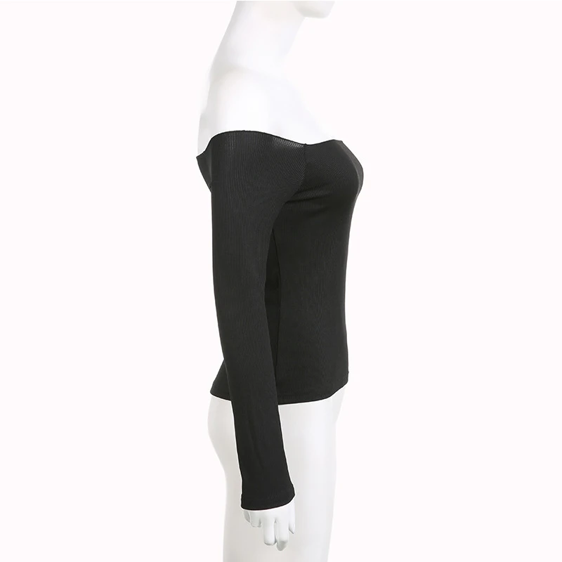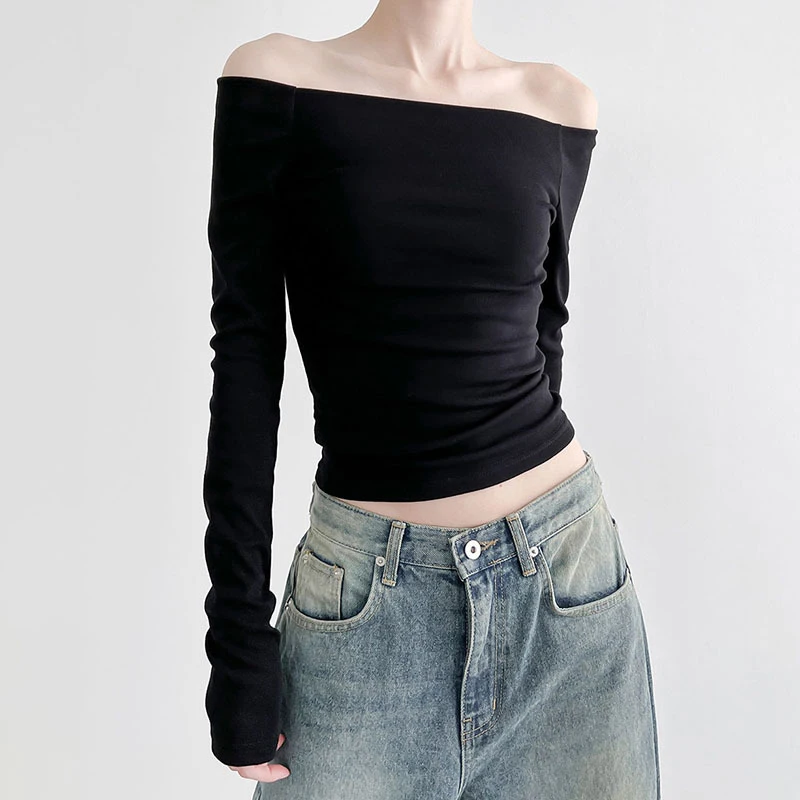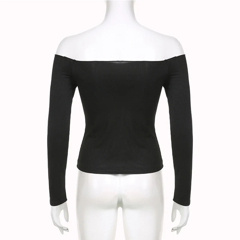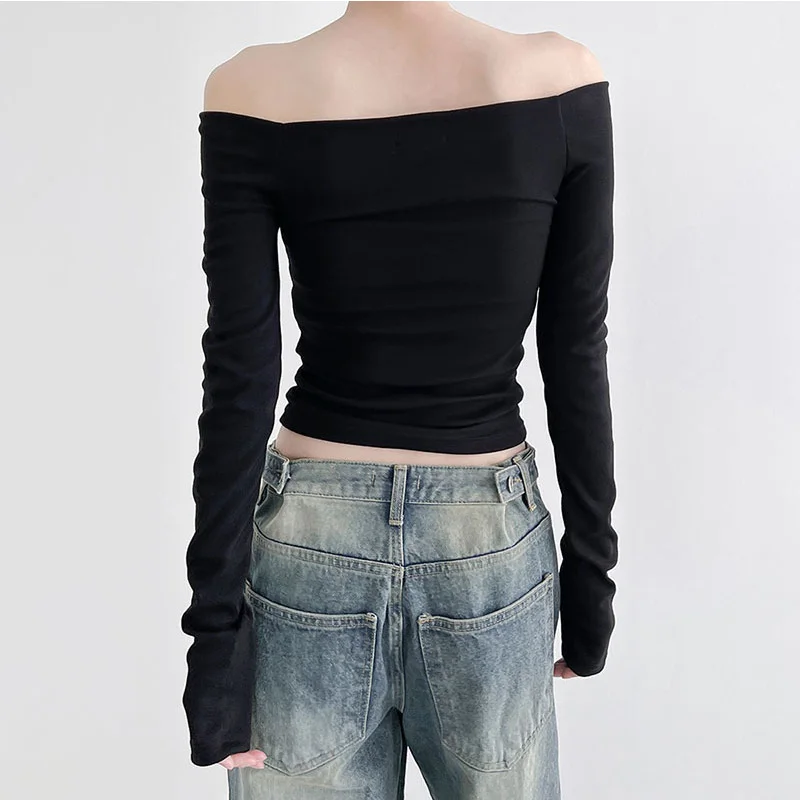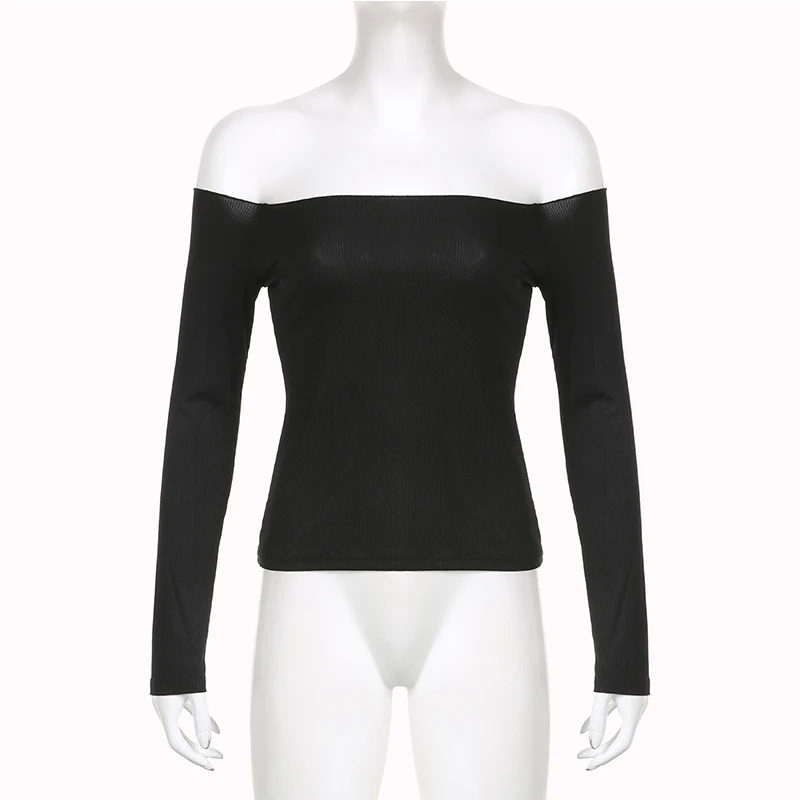 Black Solid Slash Neck Elegant Long Sleeve Tops Korean Fashion Slim Sexy Cropped T Shirt Women Fall Clothing