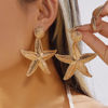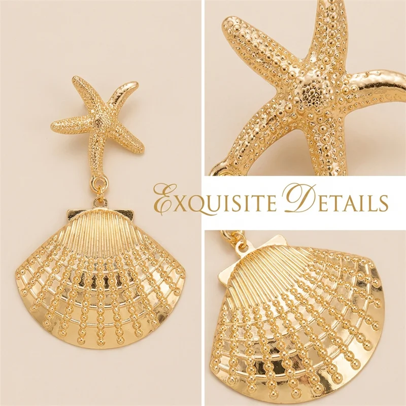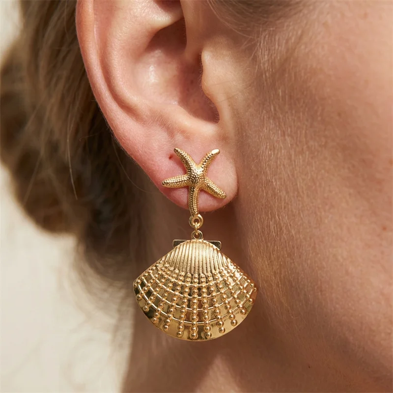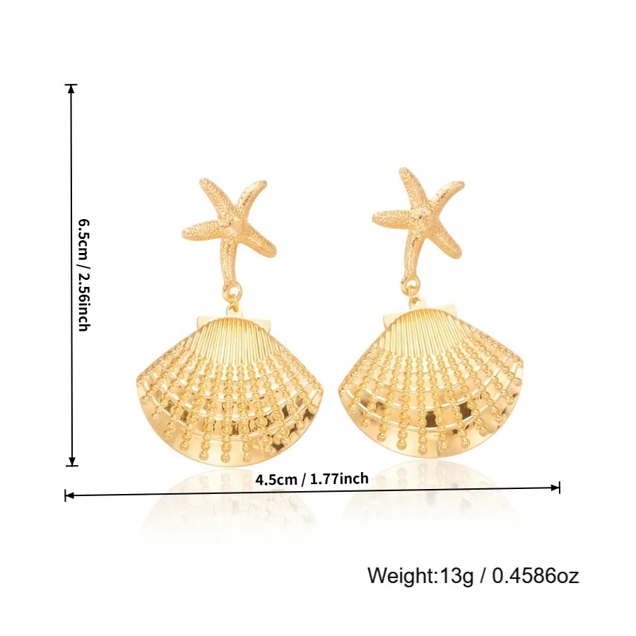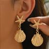 Boho Starfish Shell Pendant Earrings for Women Exaggerated Gold Color Metal Textured Scallop Drop Earrings Beach Jewelry Gift