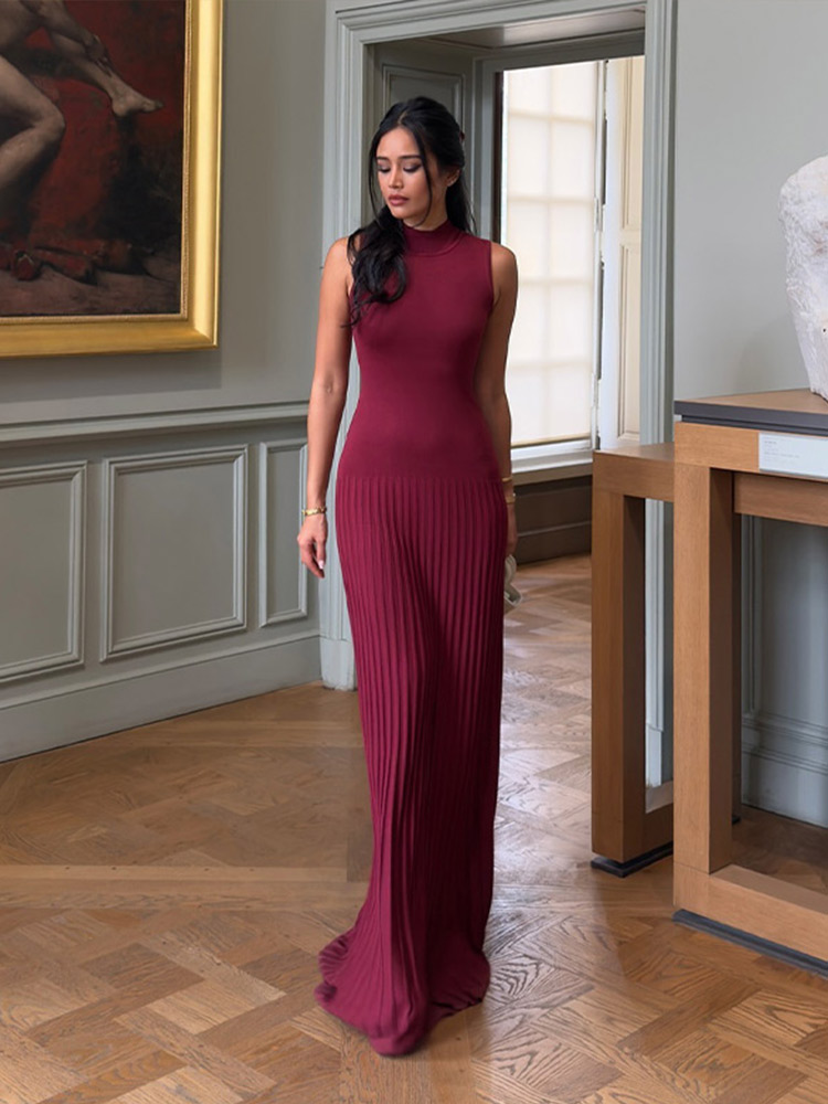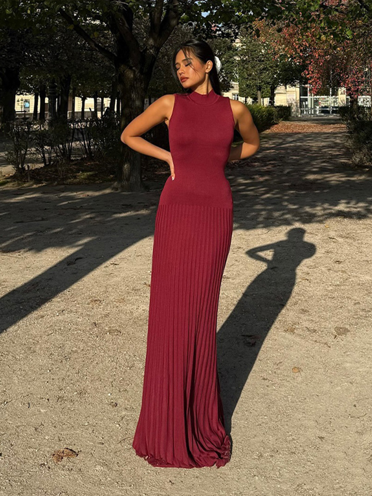 Burgundy Sleeveless Knitted Dress Women Slim Pleated Ribbed Half High Collar Solid Dresses 2025 Elegant Evening Lady Robes