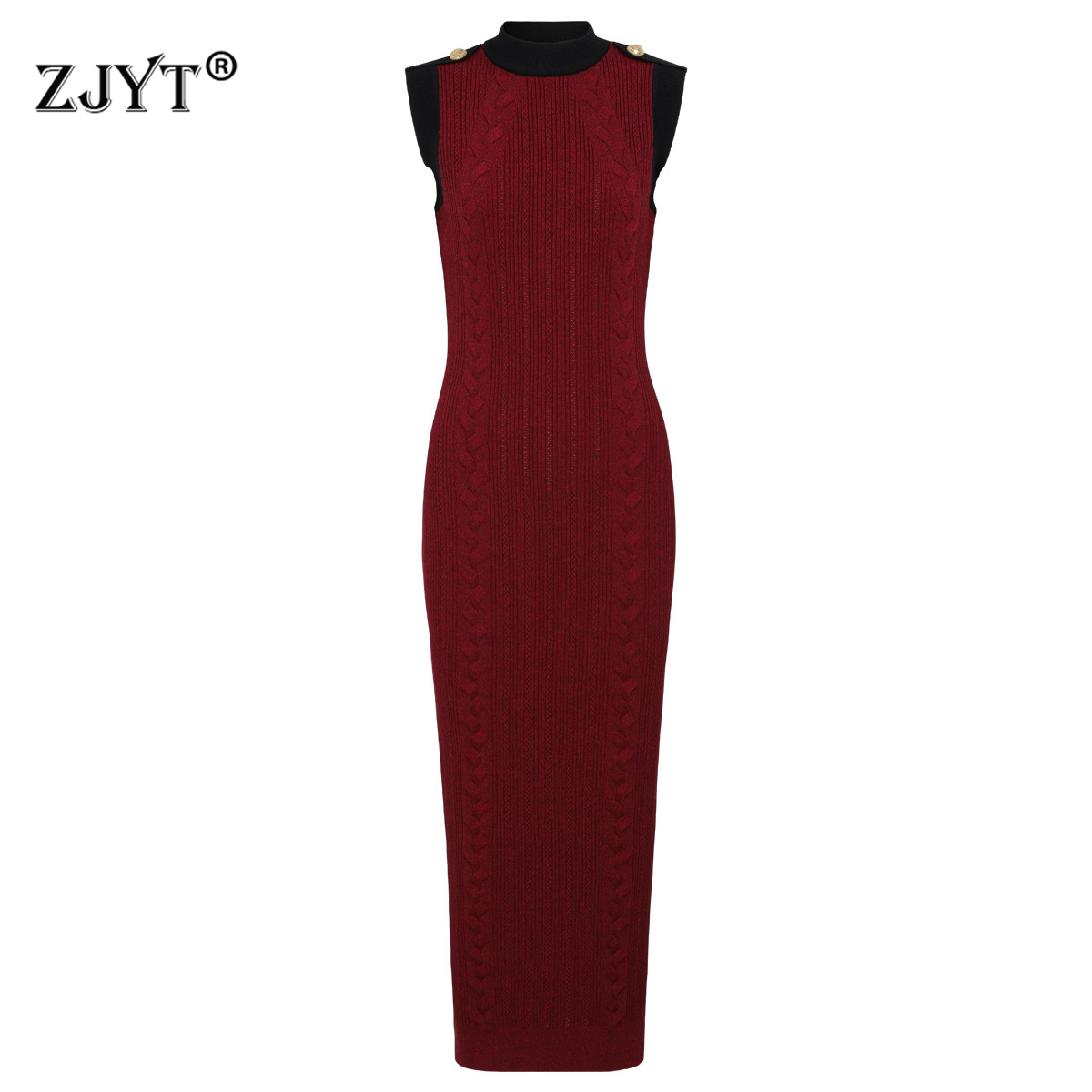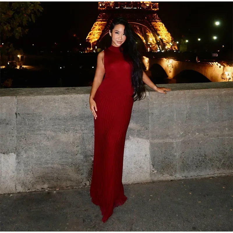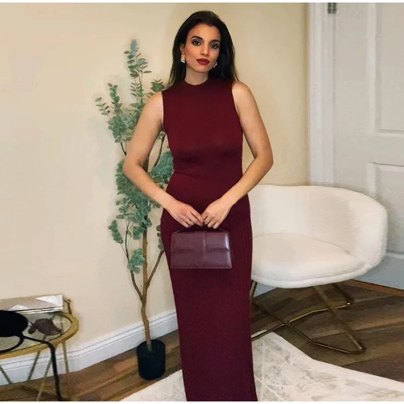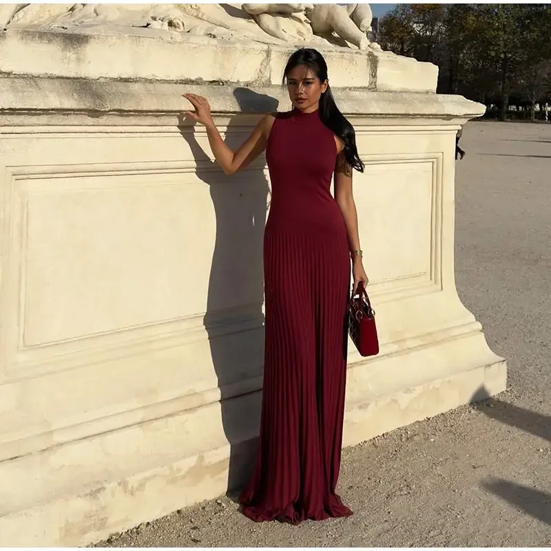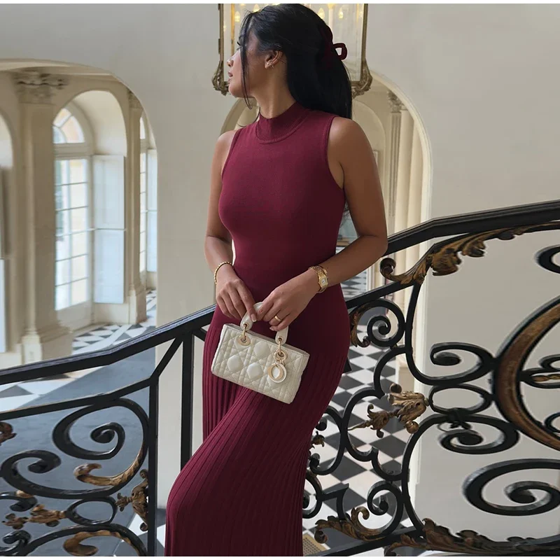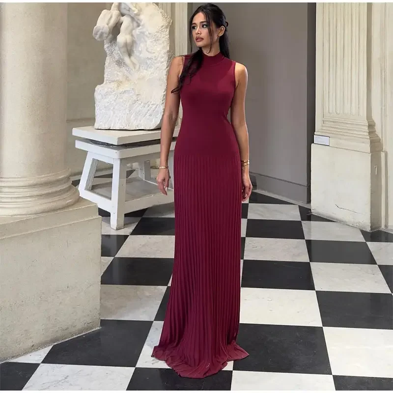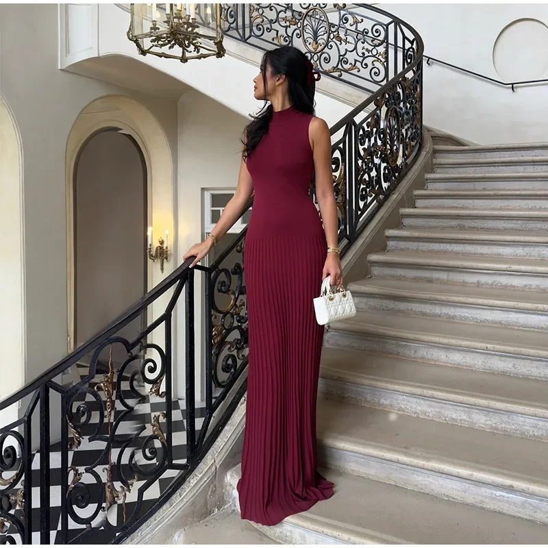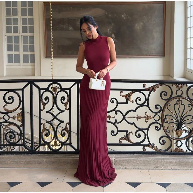 Burgundy Sleeveless Knitted Dress Women Slim Pleated Ribbed Half High Collar Solid Dresses 2025 Elegant Evening Lady Robes