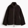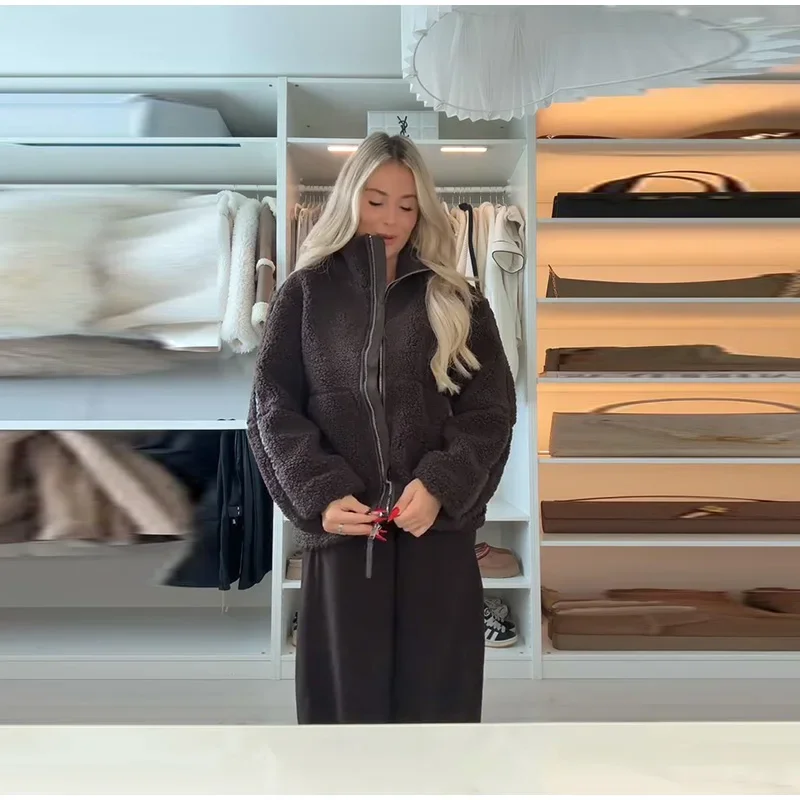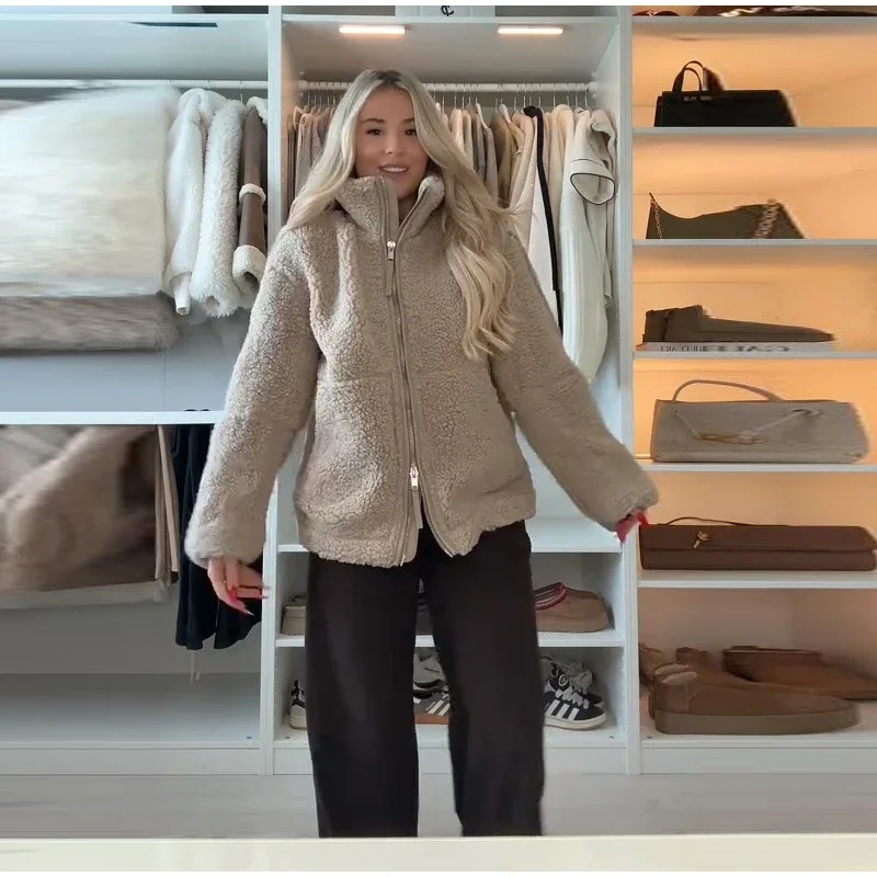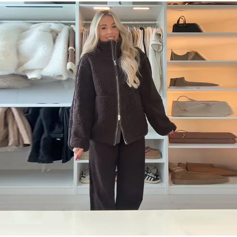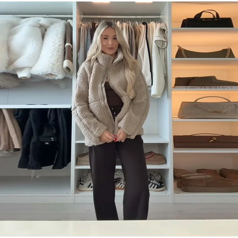 Casual Lamb Wool Zipper Jacket Women Solid Loose Full Sleeves Stand Collar Pockets Coats Female Autumn Winter Warm Lady Outwears