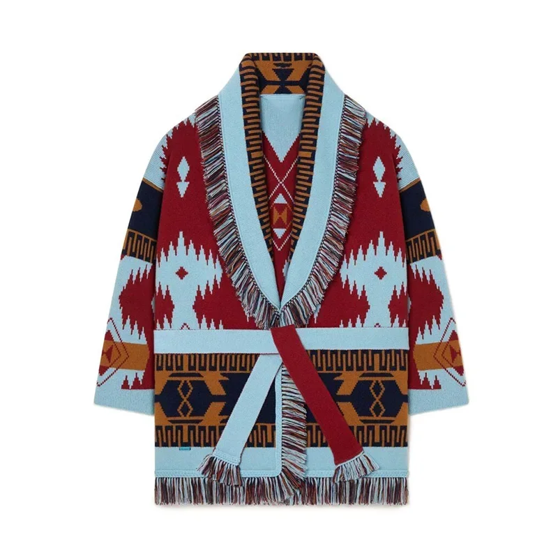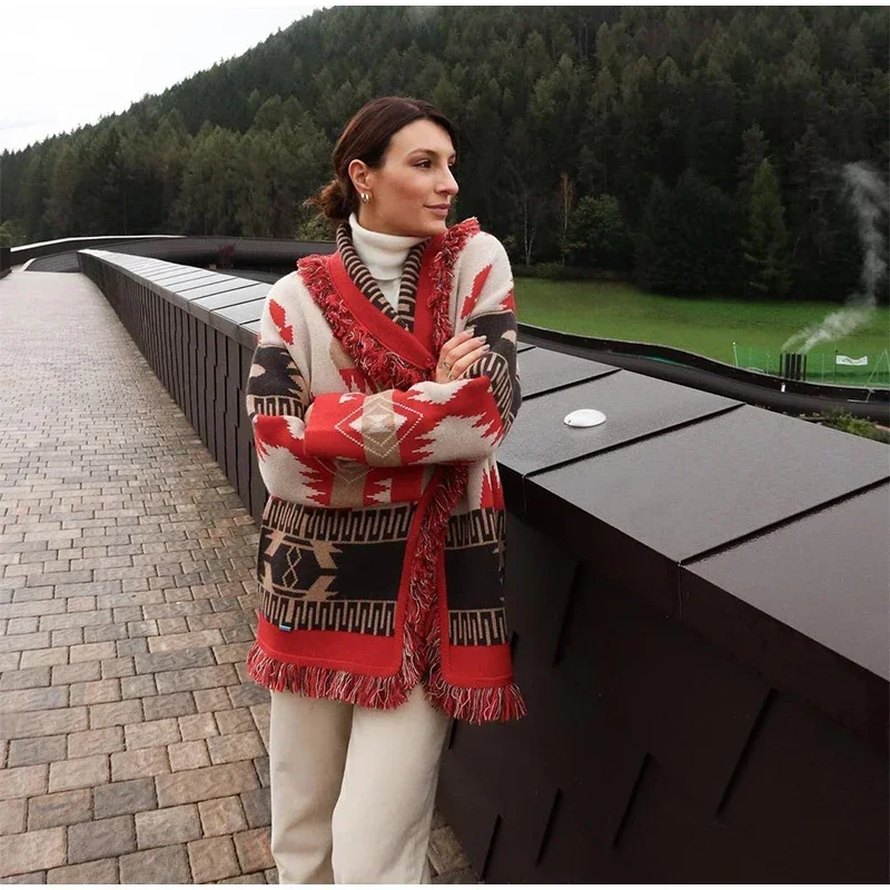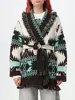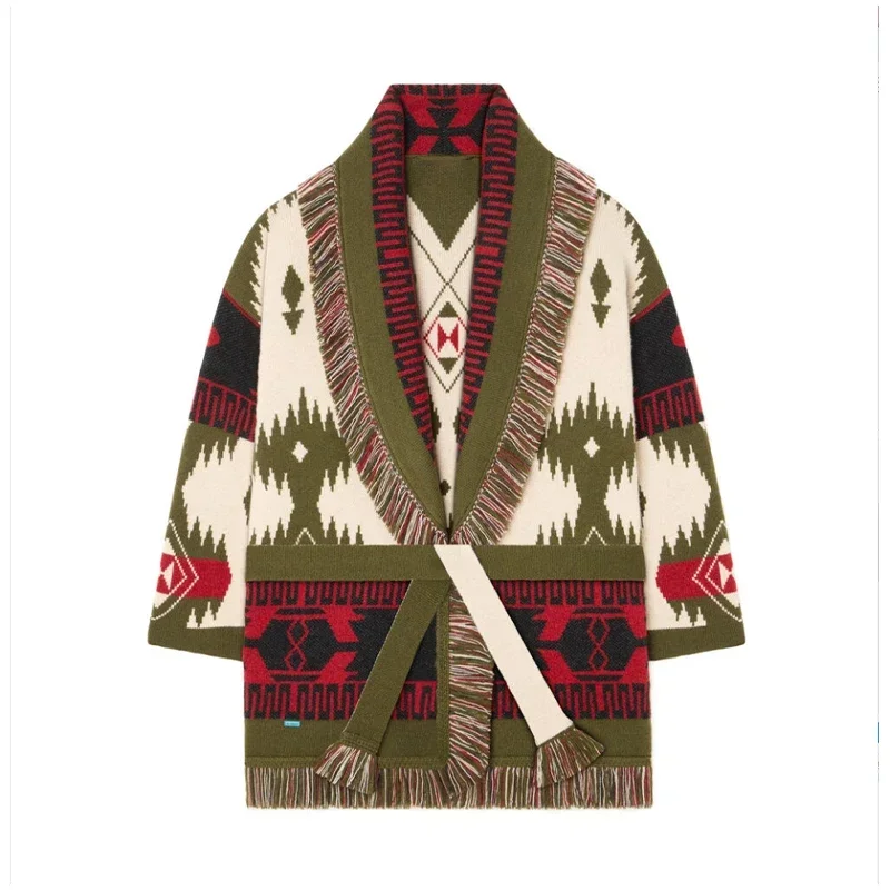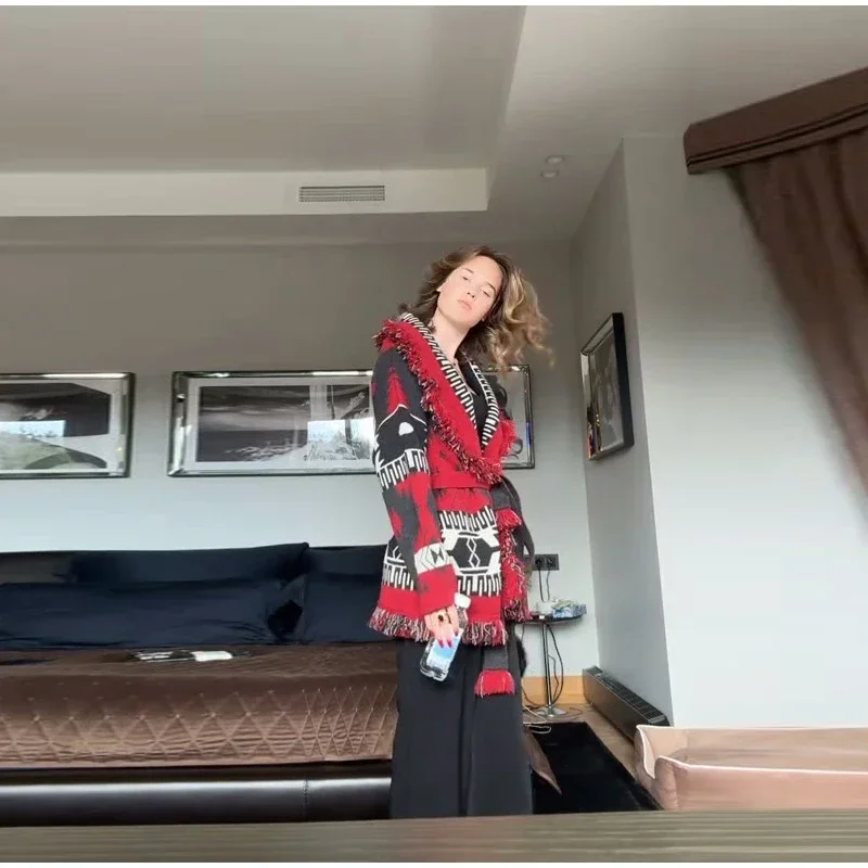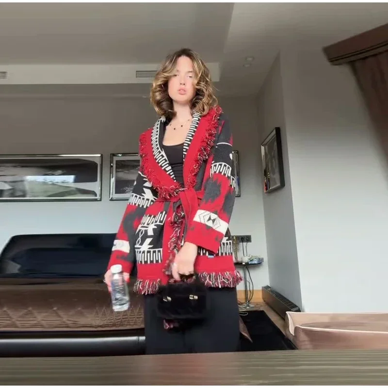 Casual Patterned Tassel Knitted Cardigan Women Chic Lace Up V-neck Full Sleeves Coats Female 2025 Autumn Fashion Lady Outwears