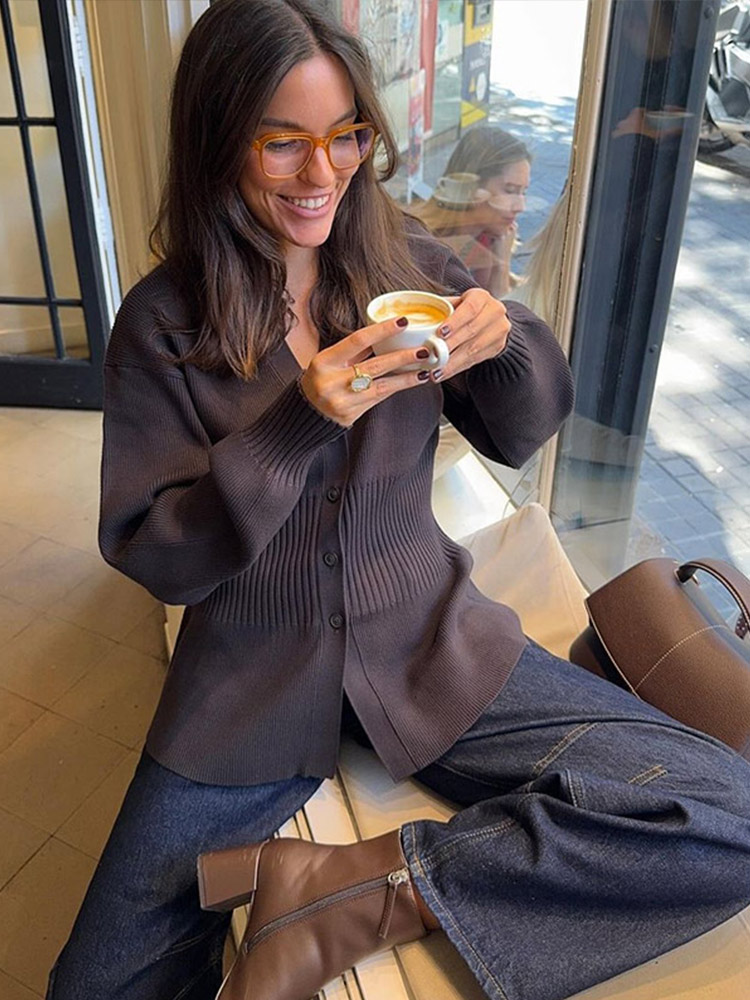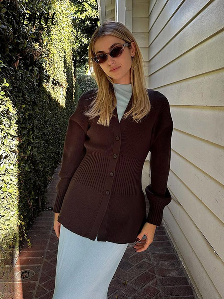 Casual Rib Knitted Brown Women’s Cardigans V-neck Long Sleeve Single-breasted Slim Waist Sweater 2025 Autumn Lady Knitwears