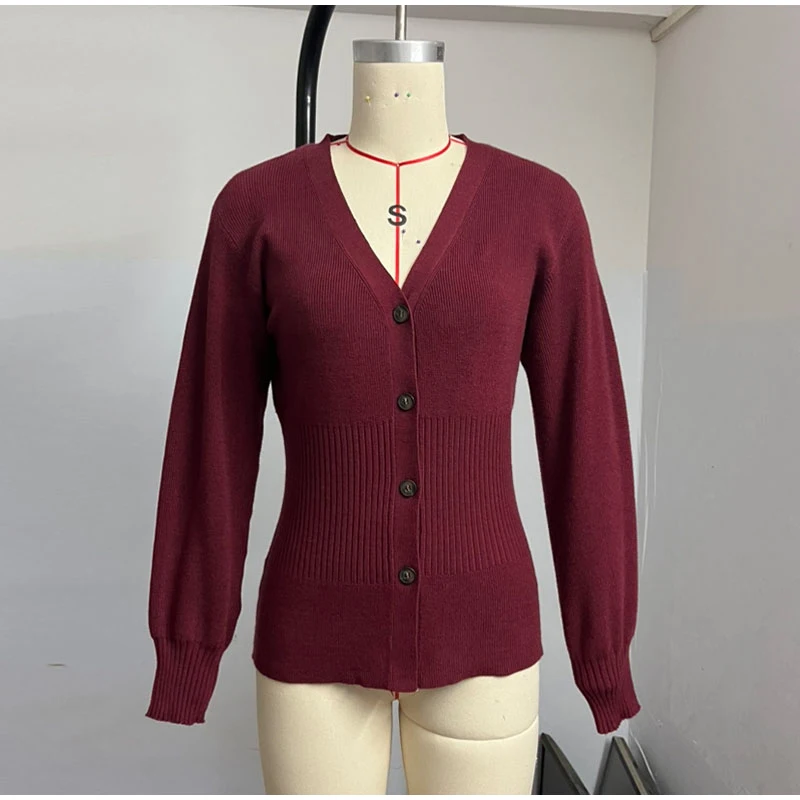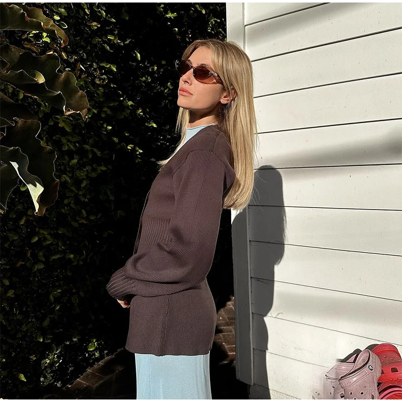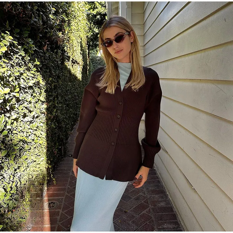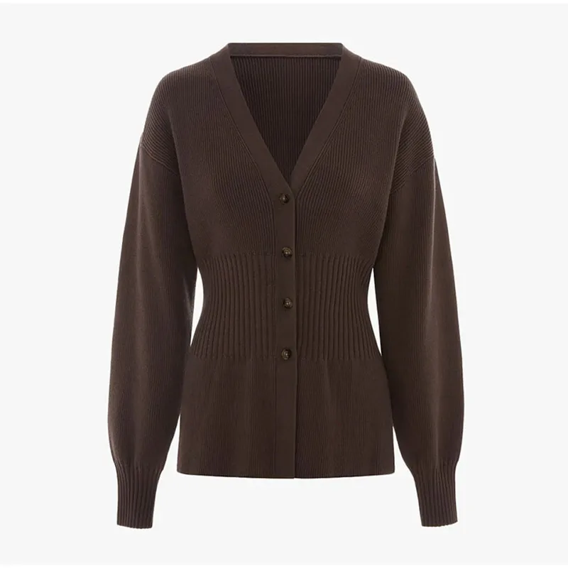 Casual Rib Knitted Brown Women’s Cardigans V-neck Long Sleeve Single-breasted Slim Waist Sweater 2025 Autumn Lady Knitwears