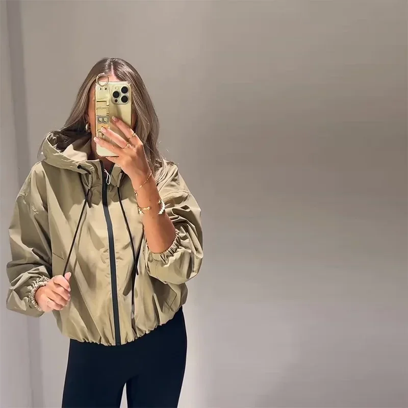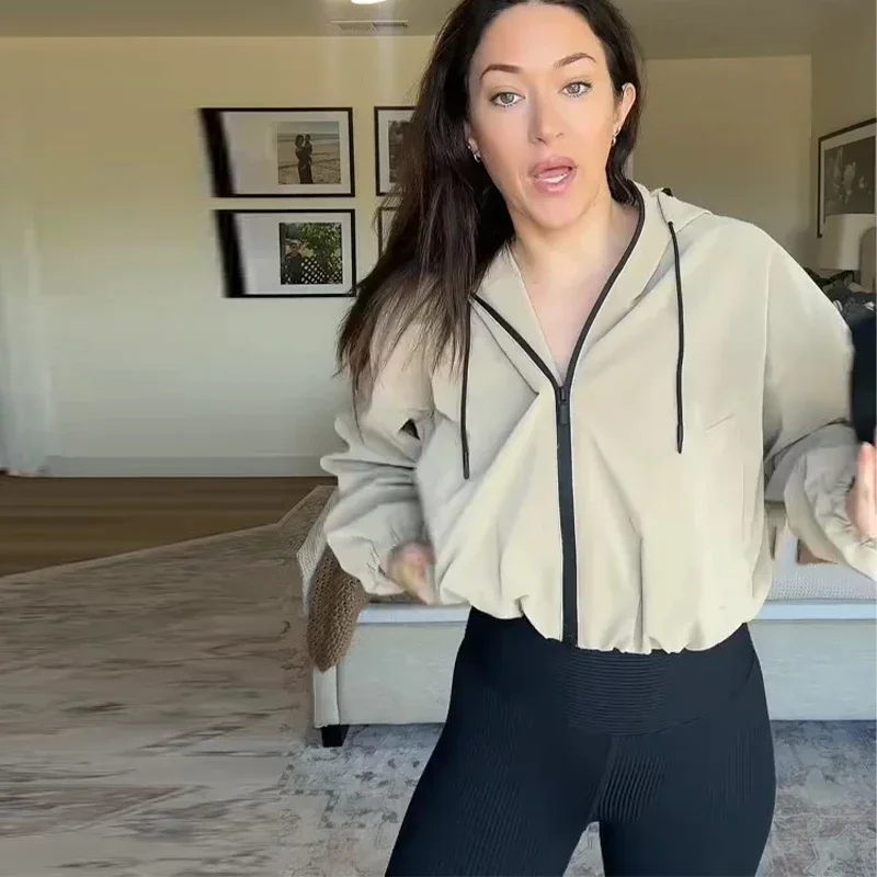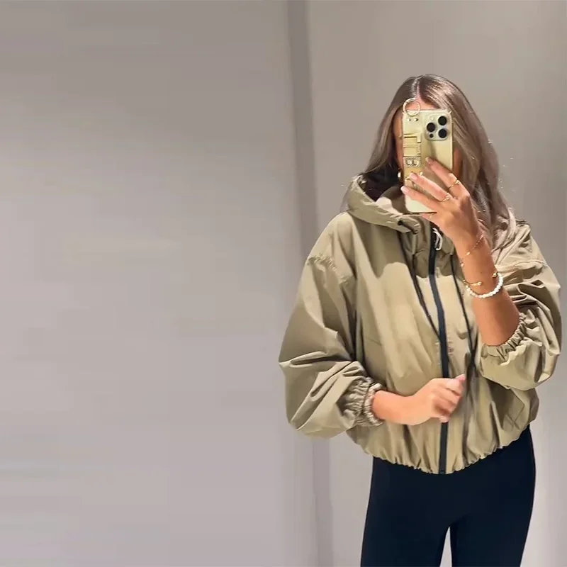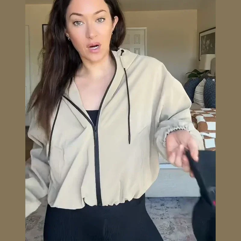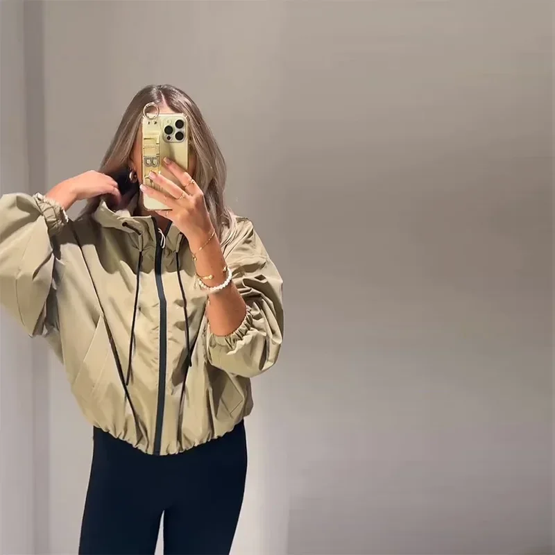 Casual Solid Hooded Women’s Cropped Jacket Drawstring Zipper Pockets Lady Coats Autumn Fashion Female Street Sporty Outwears New