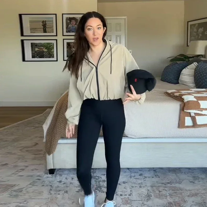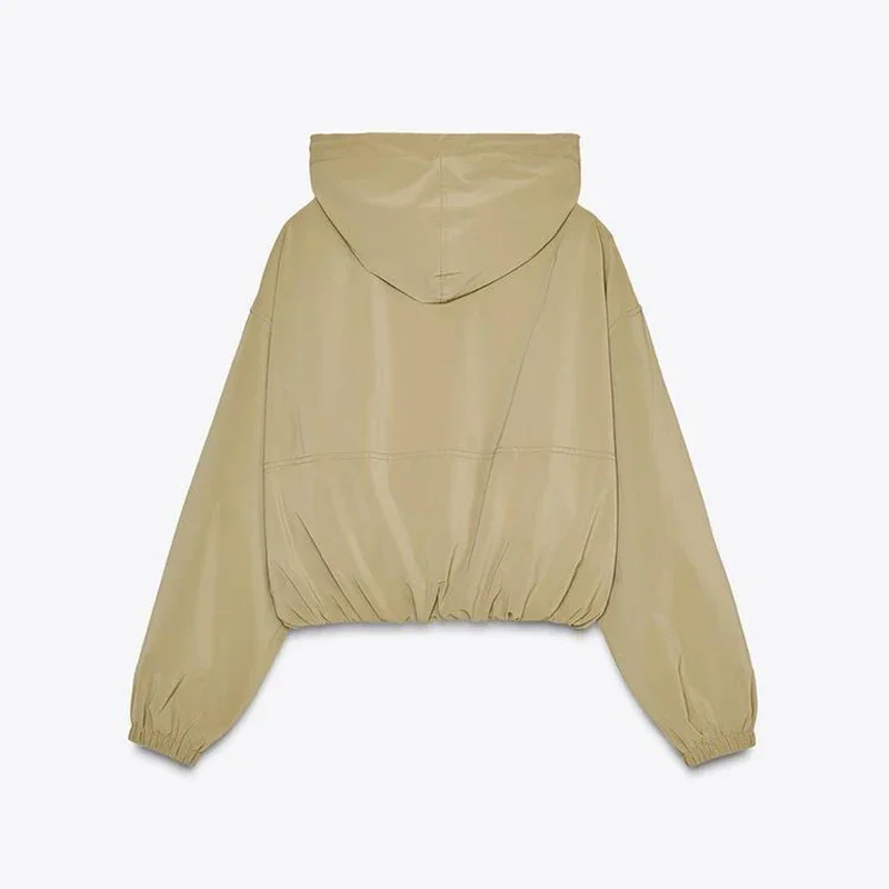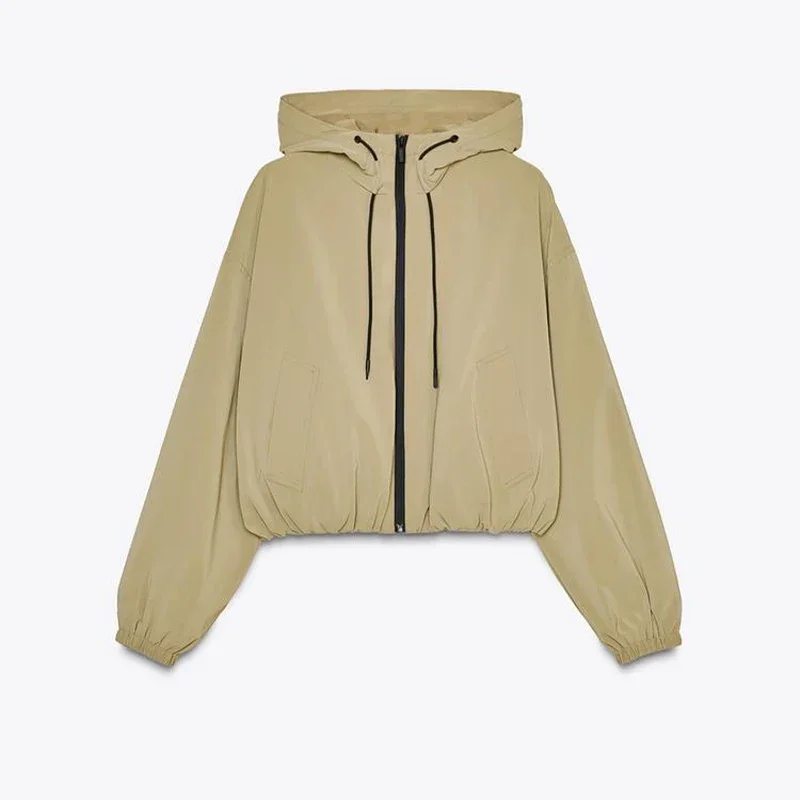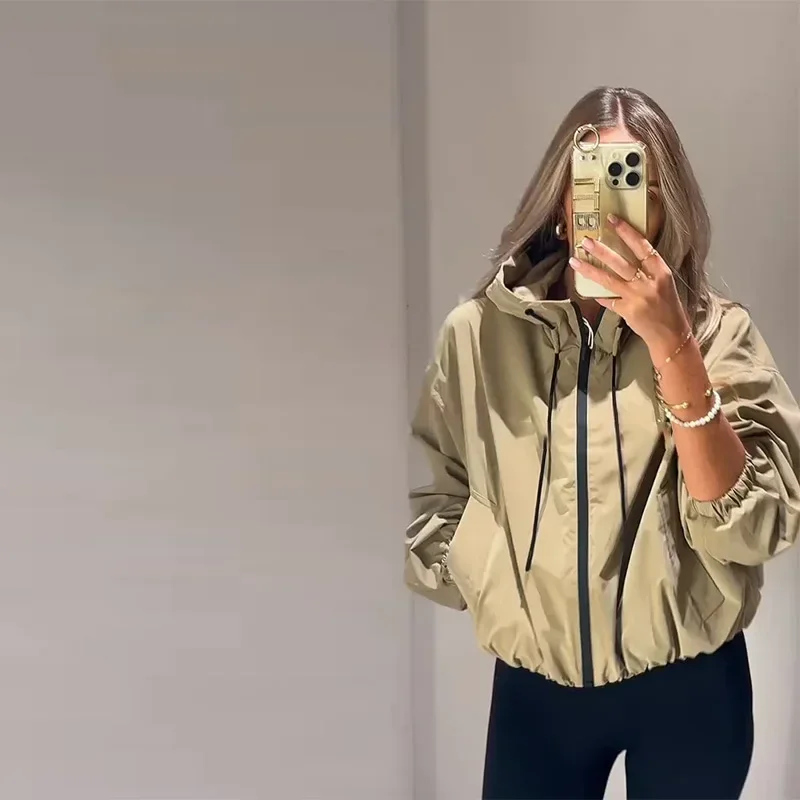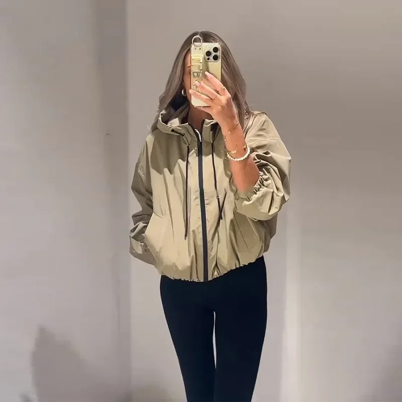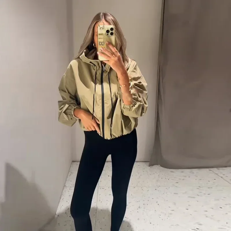 Casual Solid Hooded Women’s Cropped Jacket Drawstring Zipper Pockets Lady Coats Autumn Fashion Female Street Sporty Outwears New