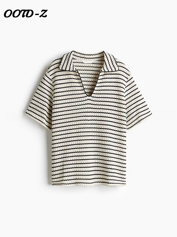 Casual Women’s Knit Striped Pullover Pants Set 2025 Loose Polo Collar Short Sleeve T-shirt Drawstring Wide Leg Pant Lady Outfit