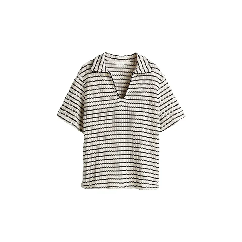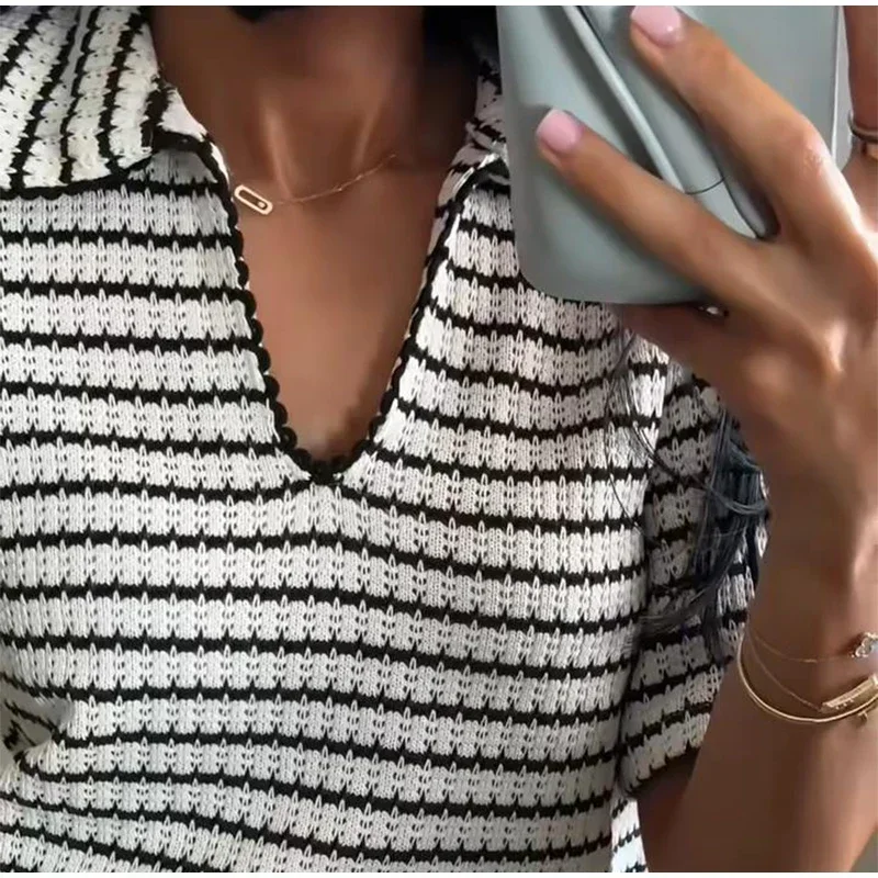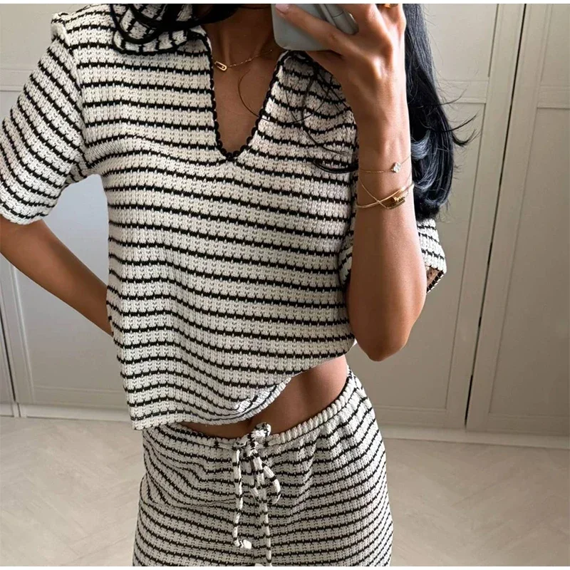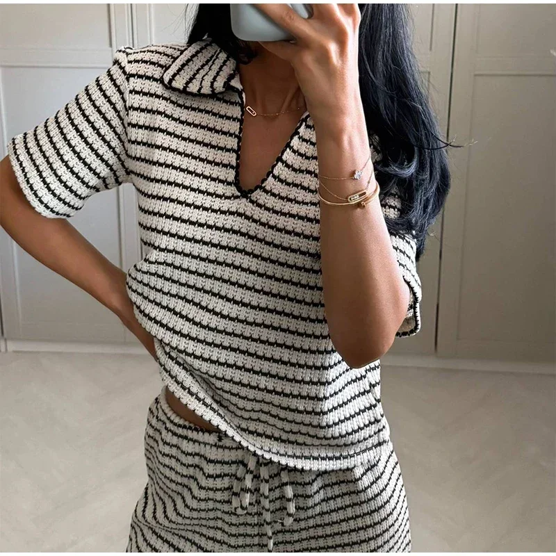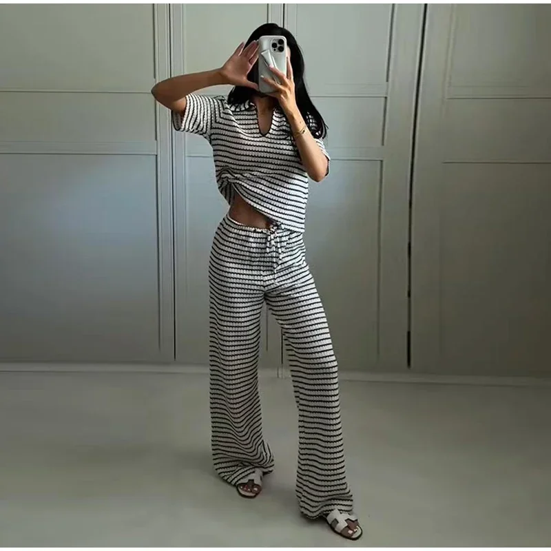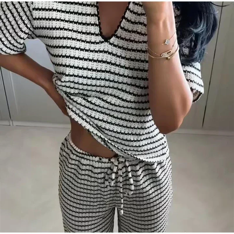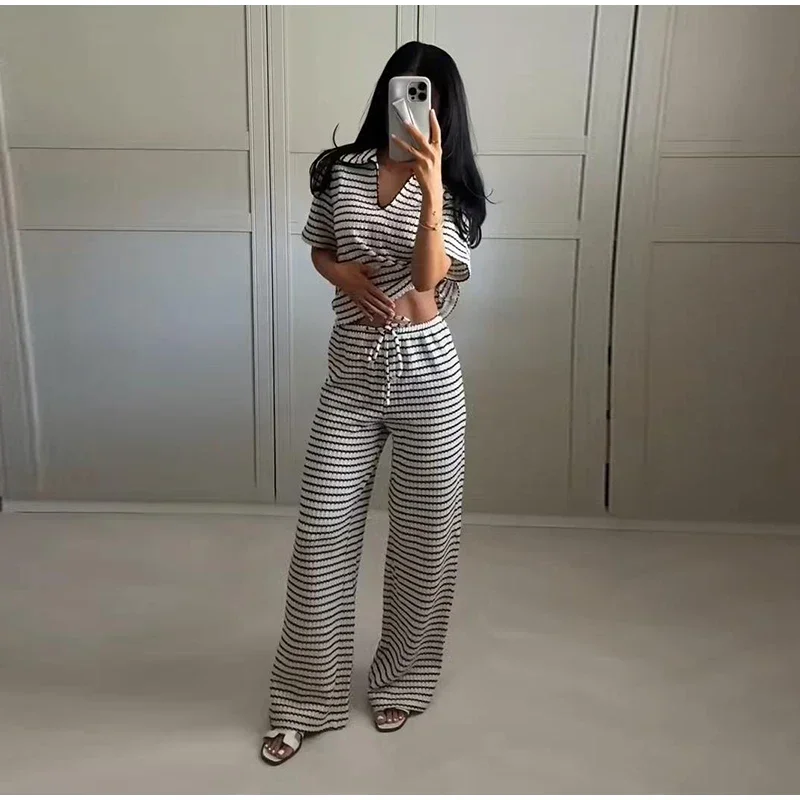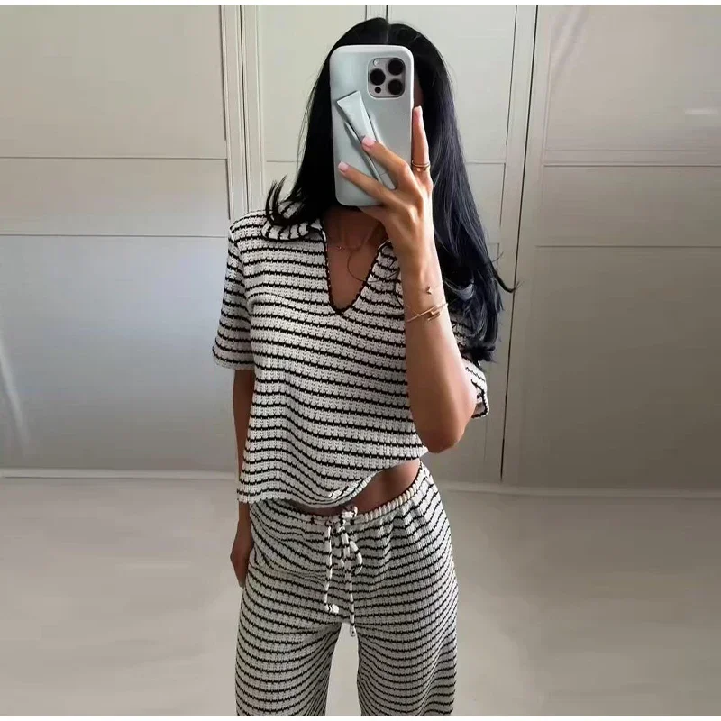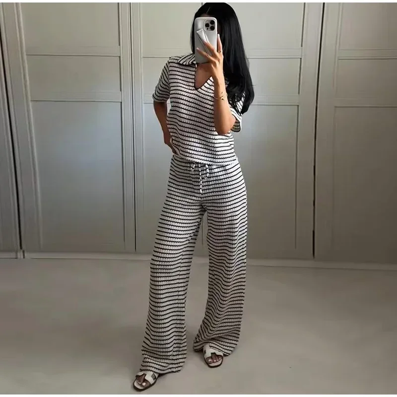 Casual Women’s Knit Striped Pullover Pants Set 2025 Loose Polo Collar Short Sleeve T-shirt Drawstring Wide Leg Pant Lady Outfit