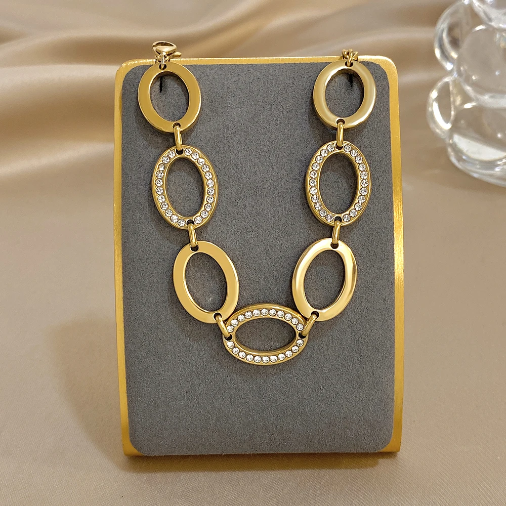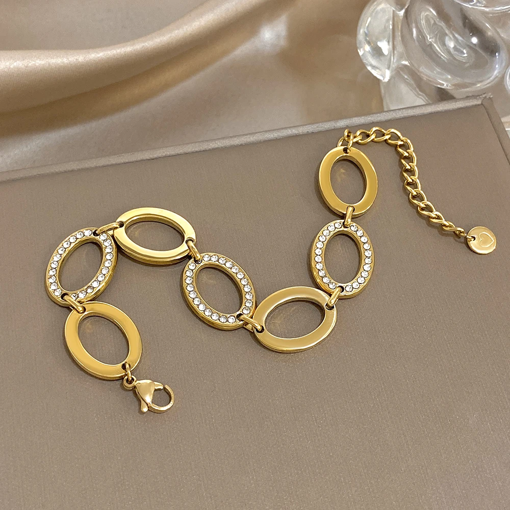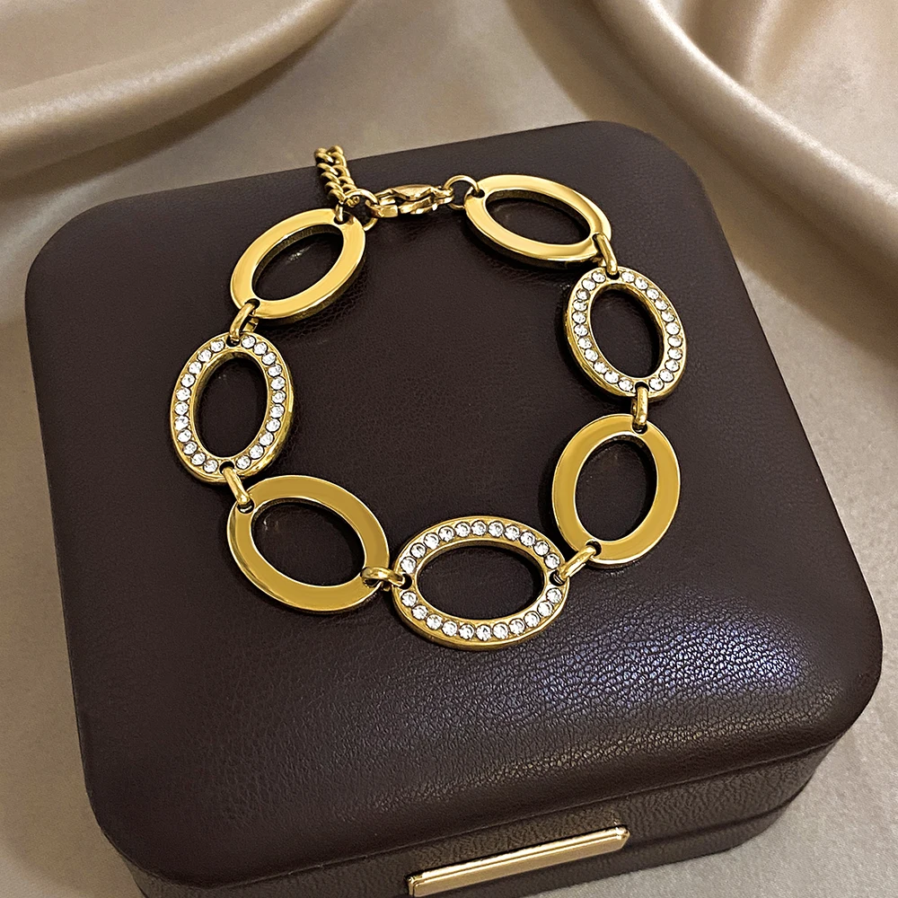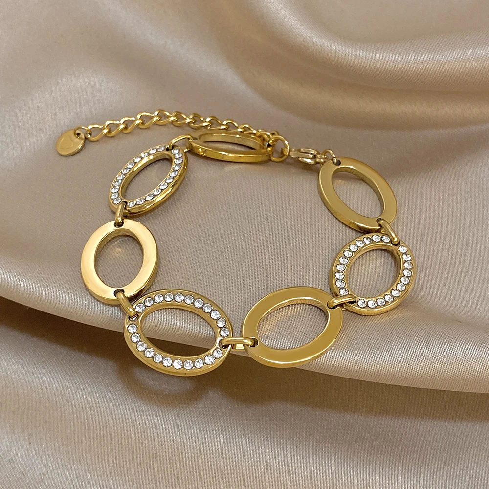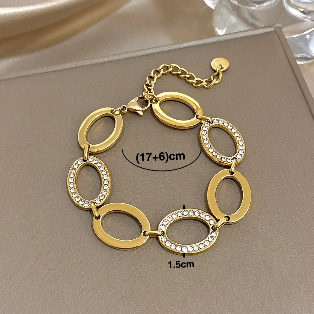 Chic Hollow Geometric Circle Rhinestone Bracelet for Women Elegant Gold Plated Stainless Steel Chunky Bracelets Jewelry Gifts