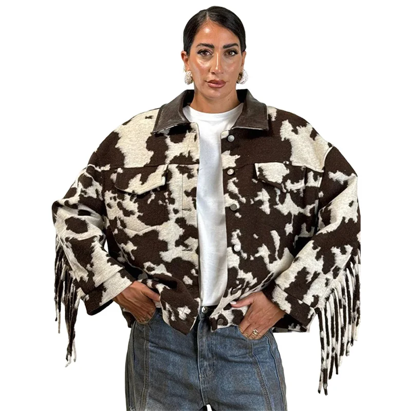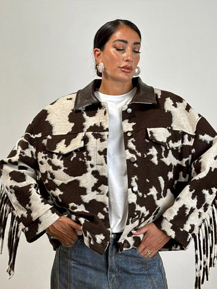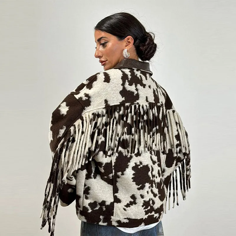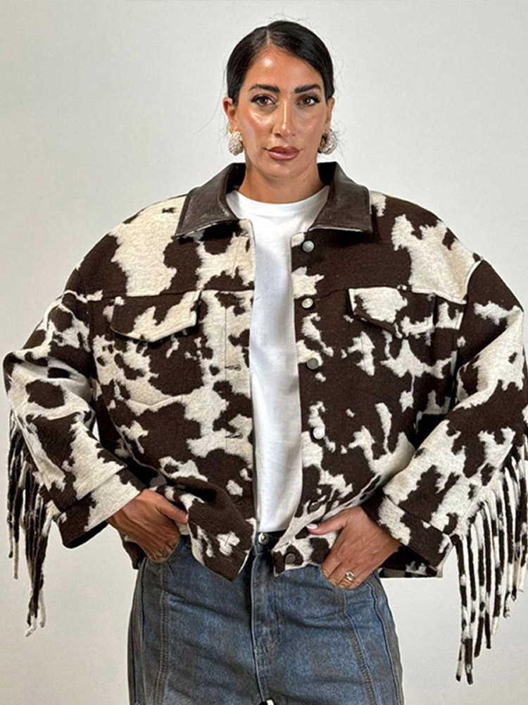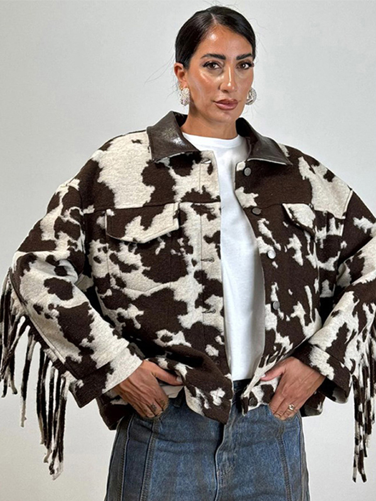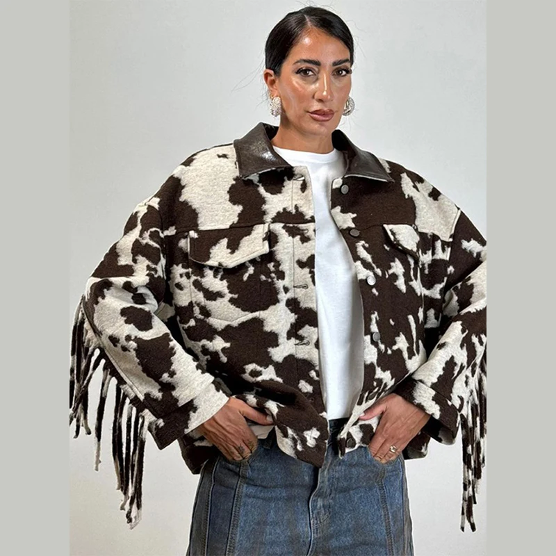 Chic Tassel Print Jackets Women Loose Contrast Lapel Zipper Full Sleeves Coats Female 2025 Autumn Winter Fashion Lady Outwears