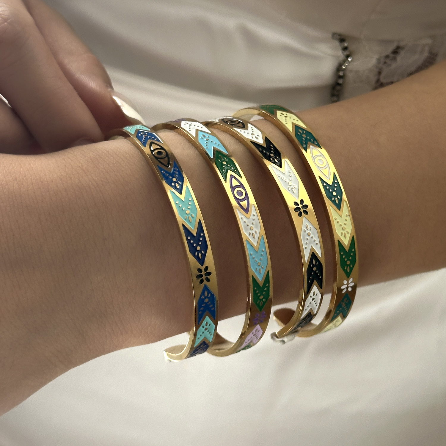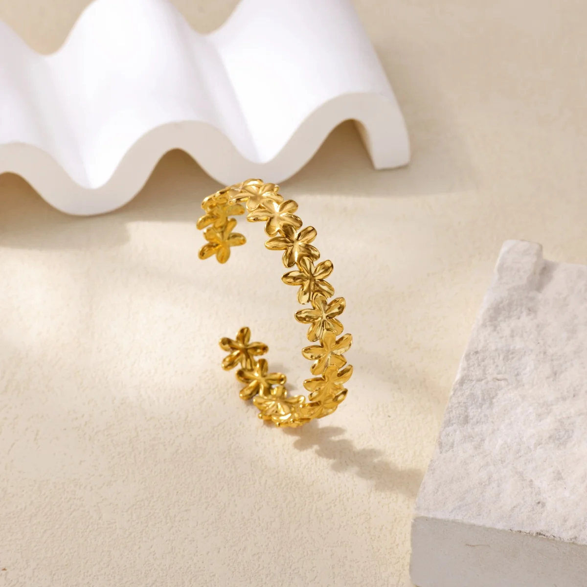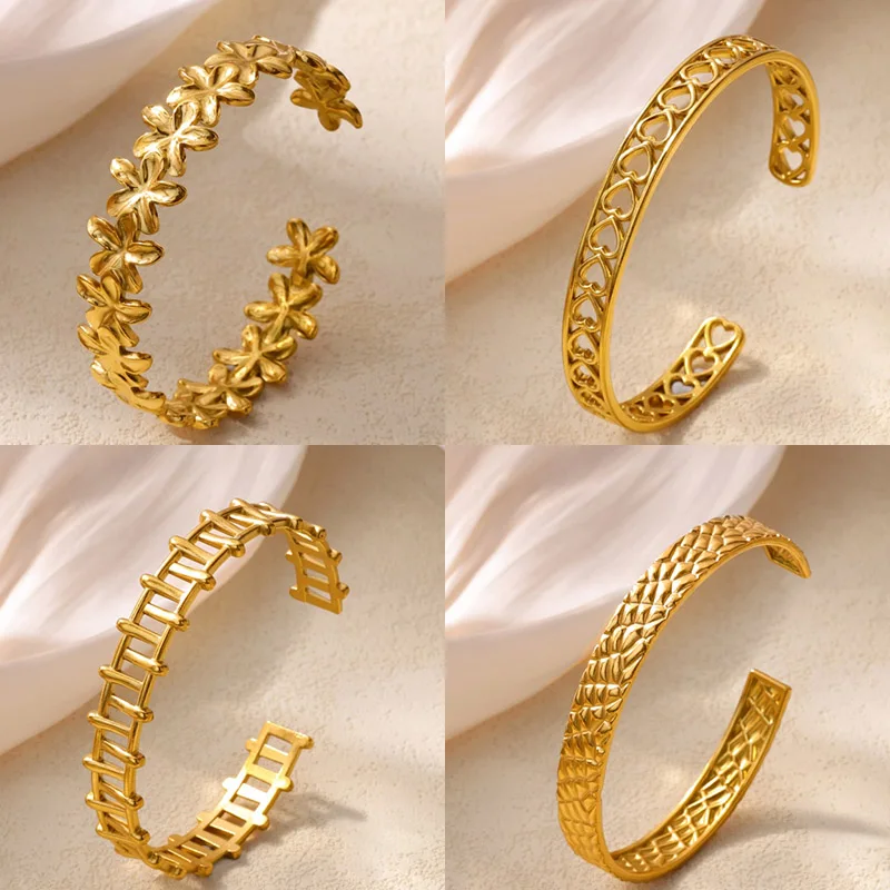 Classic Elegant Flowers Patchwork Cuff Bracelet Gold Color Stainless Steel Delicate Adjustable Open Geometric Bracelet Jewelry Gift