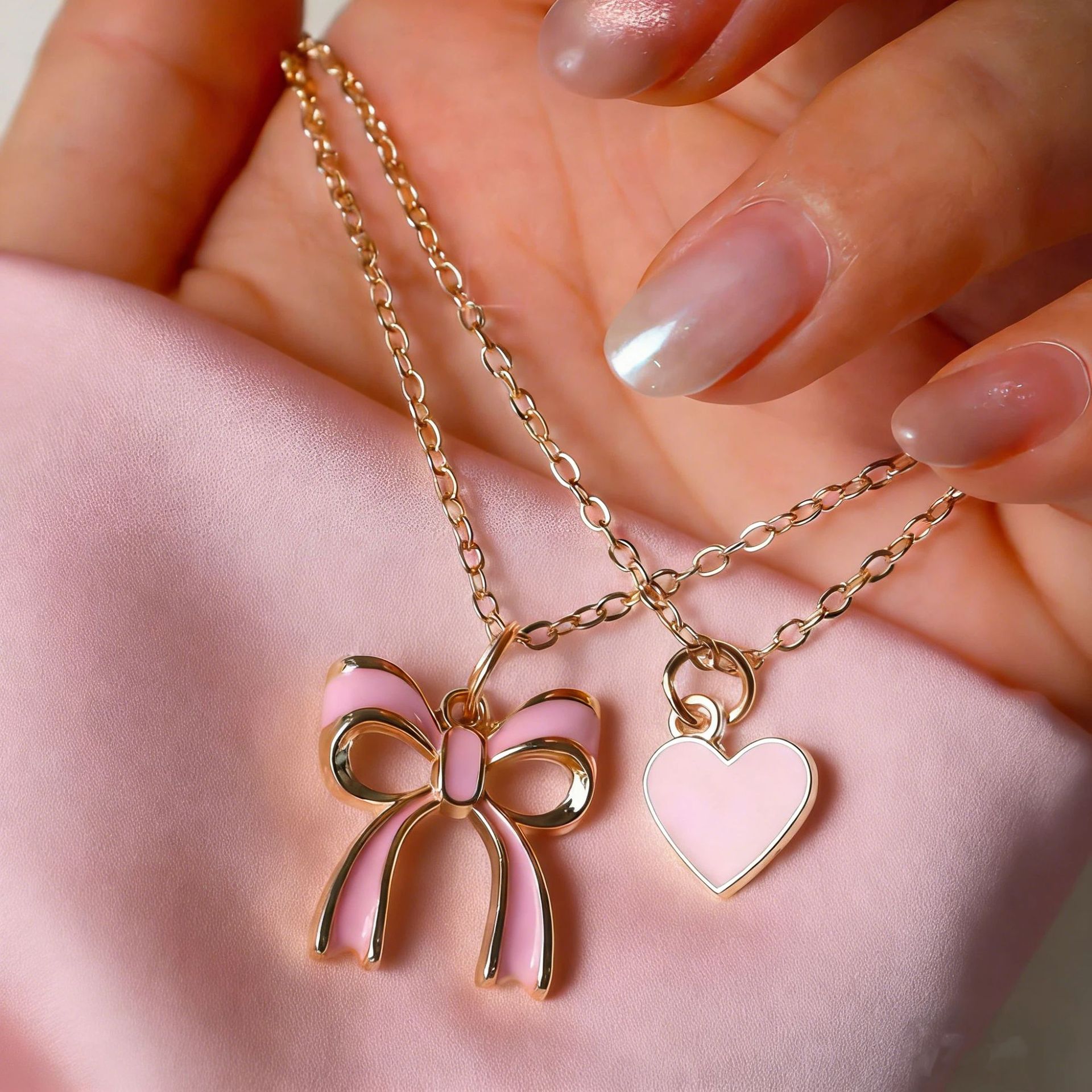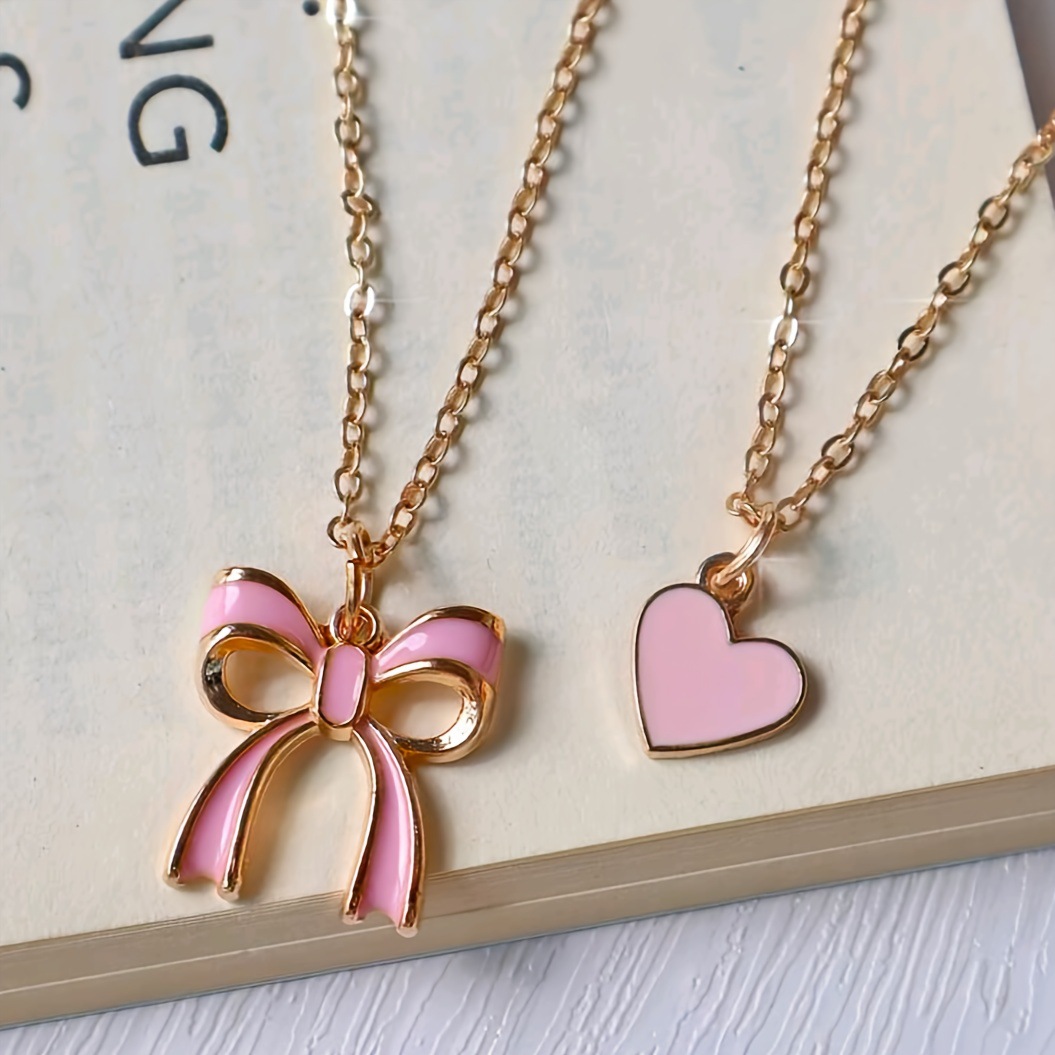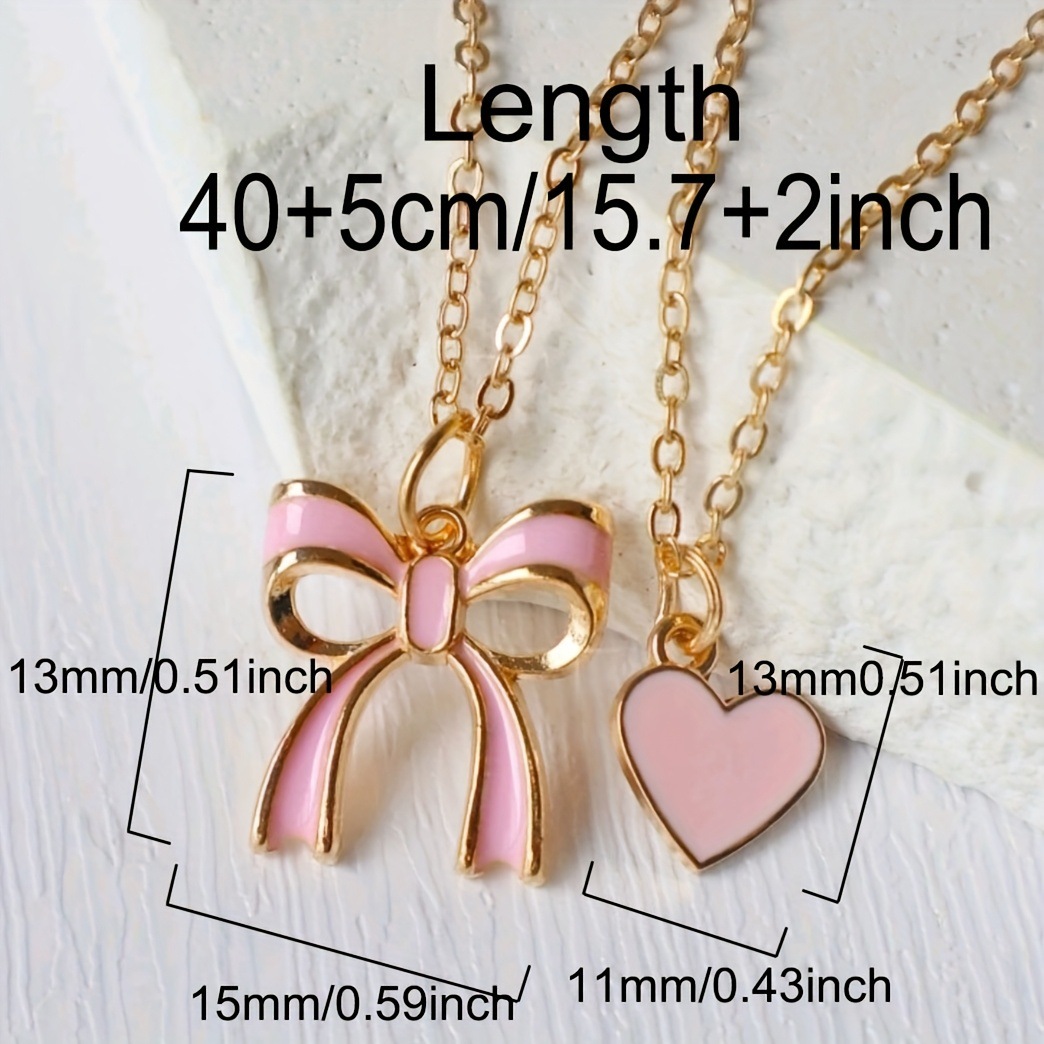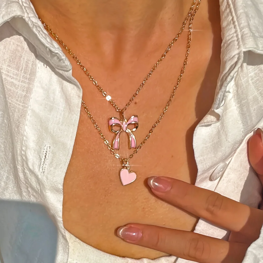 Cute Sweet Bow Pink Heart-Shaped Pendant Double-Layer Necklace for Women’s Girls Jewelry Valentine’s Day Gift Daily Wear