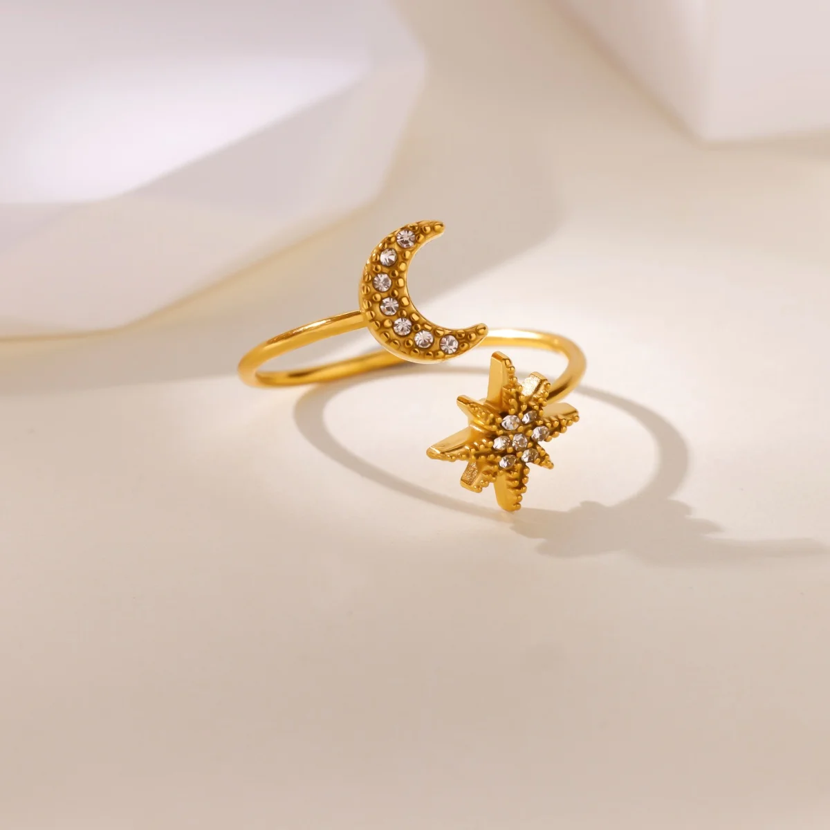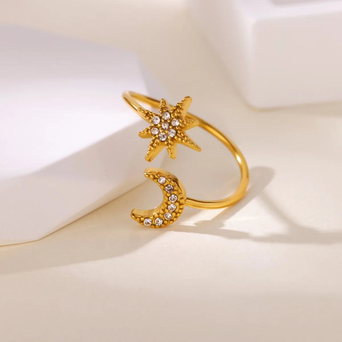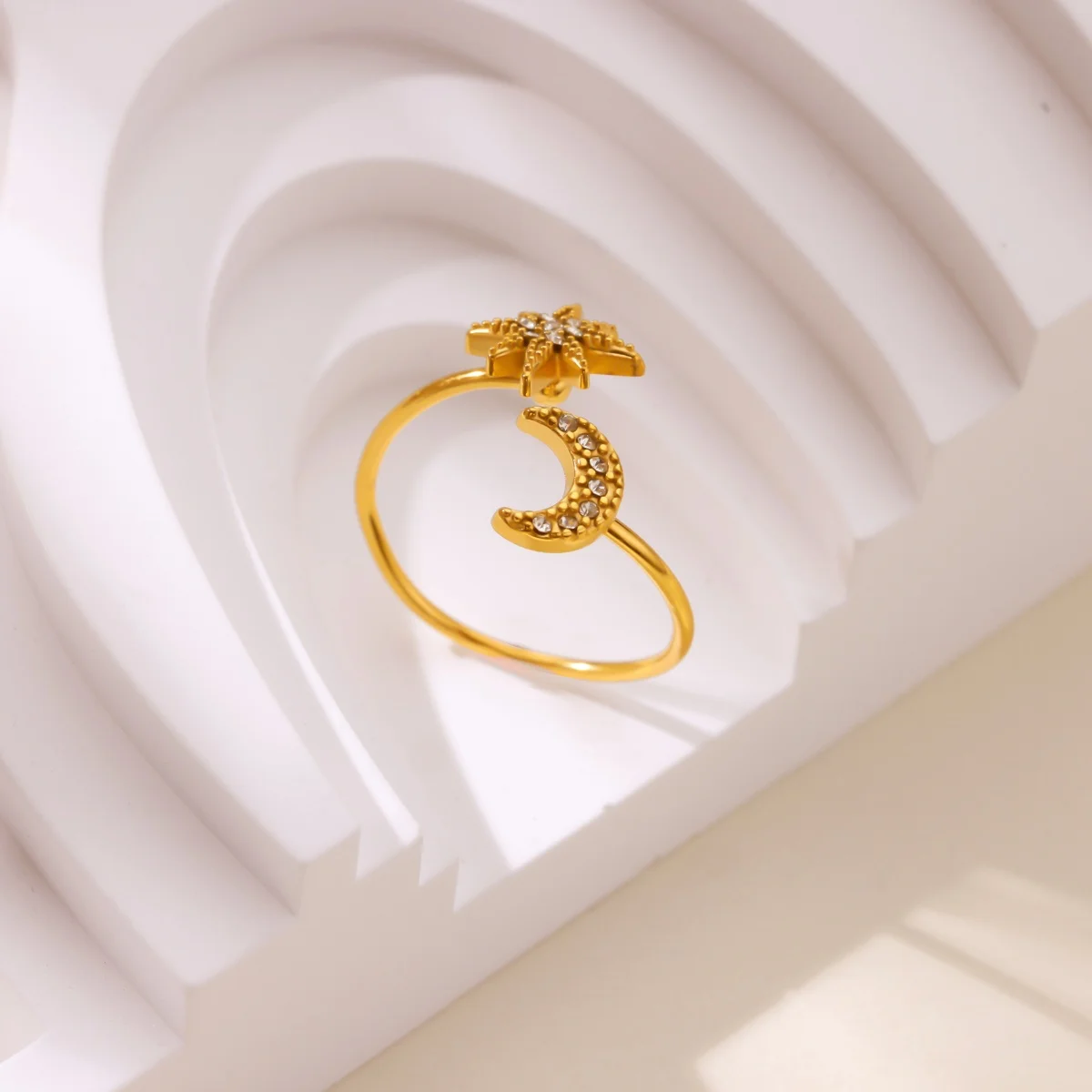 Dainty Zircon Stars Crescent Moon Rings for Women Stainless Steel Gold Color Geometric Wedding Ring Aesthetic Wedding Jewelry