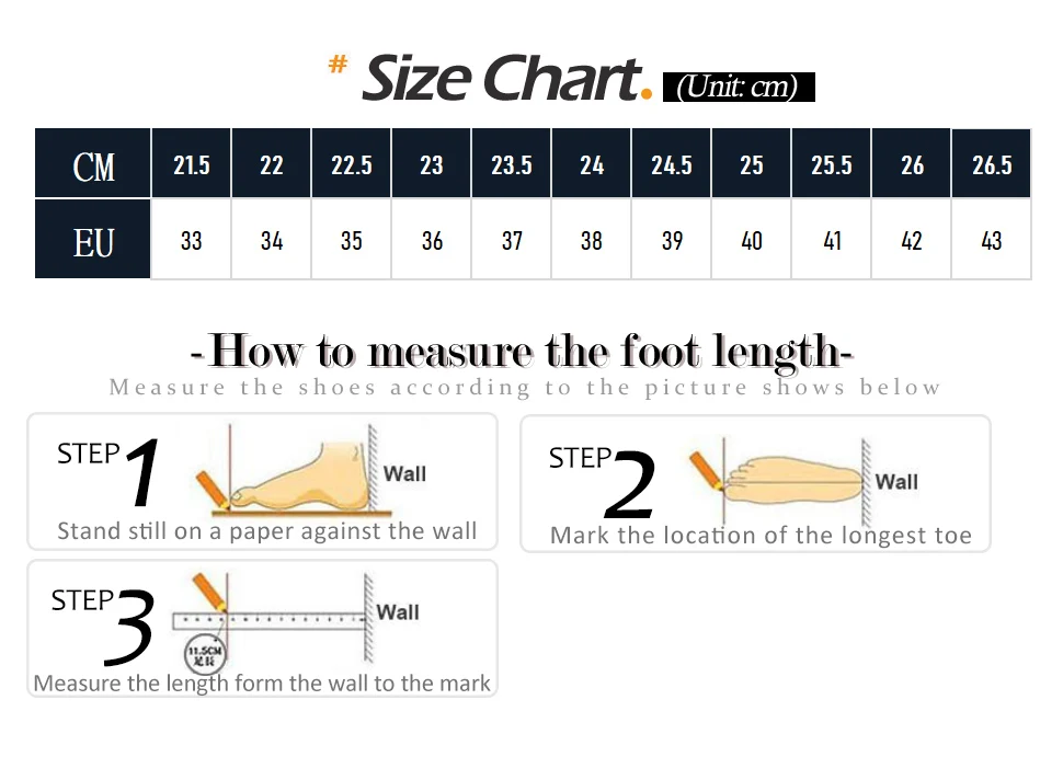 Size Tip:Please Measure your feet length before place the order, then refer to the size chart to choose the size according to your feet length.