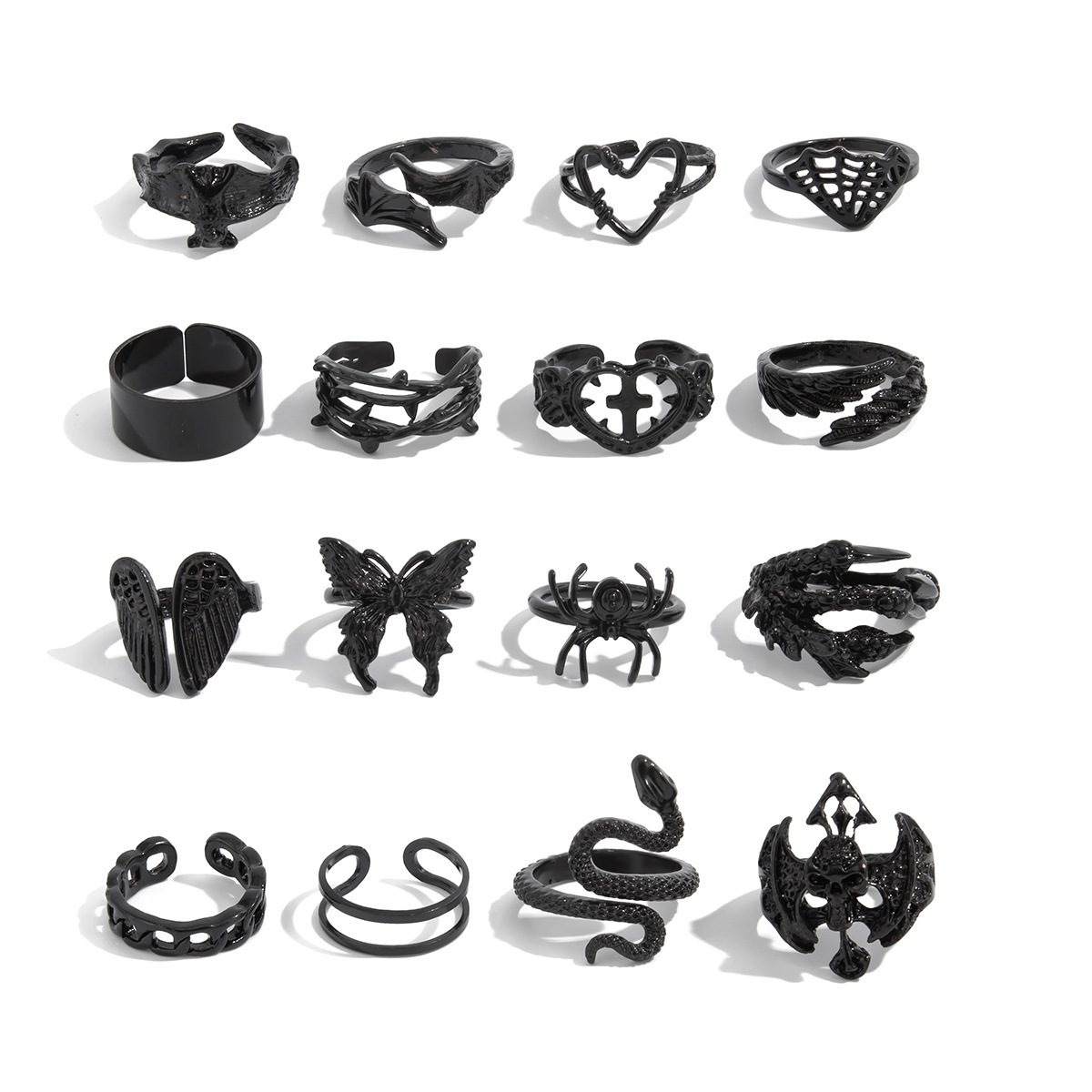 DIEZI 16pcs/set Gothic Vintage Black Finger Rings For Women Men Punk Spider Bat Geometric Knuckle Joint Ring Halloween Jewelry