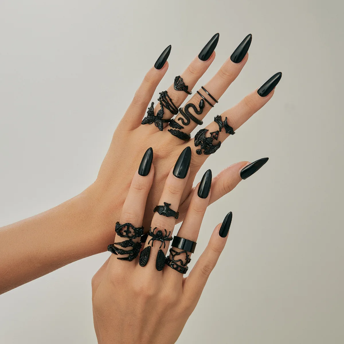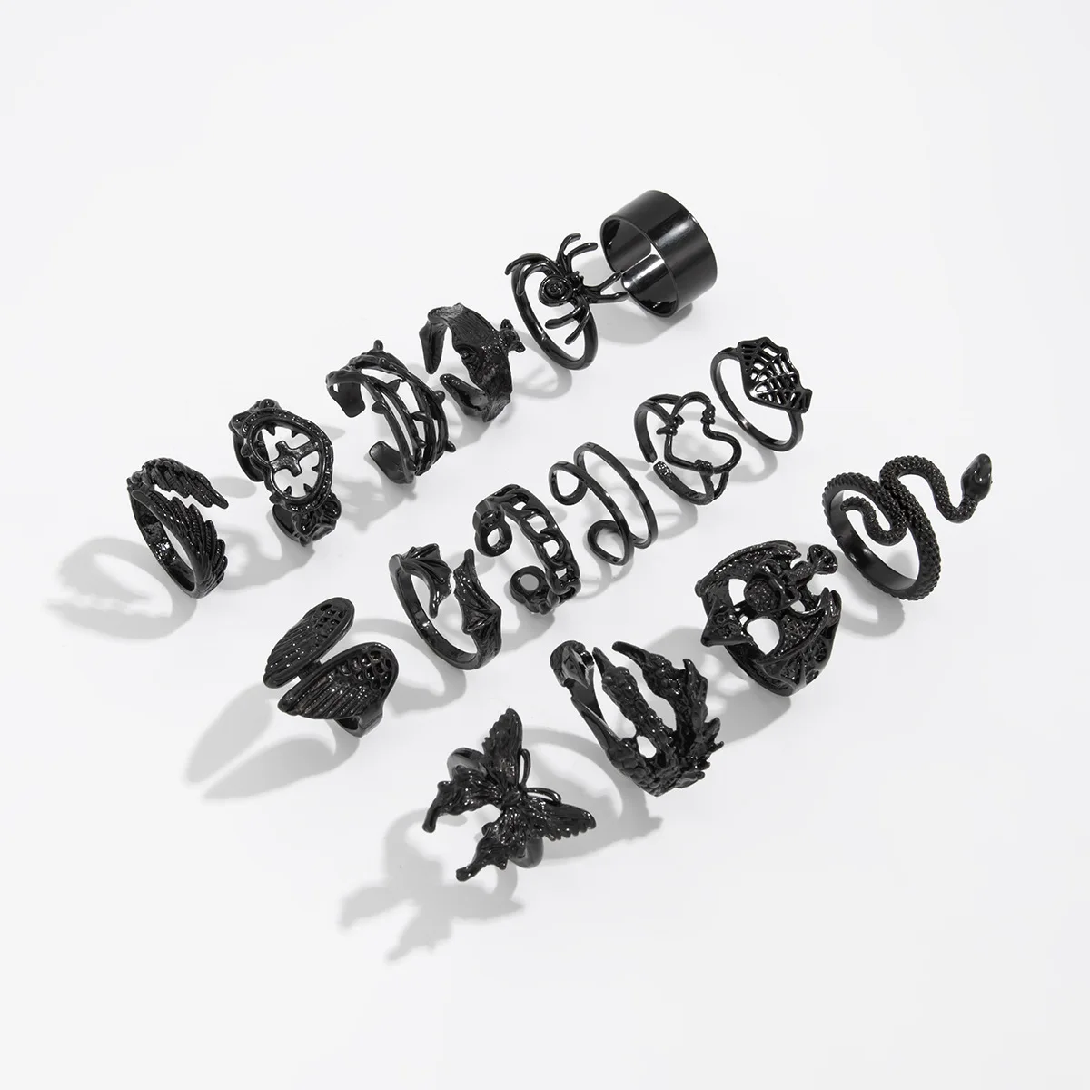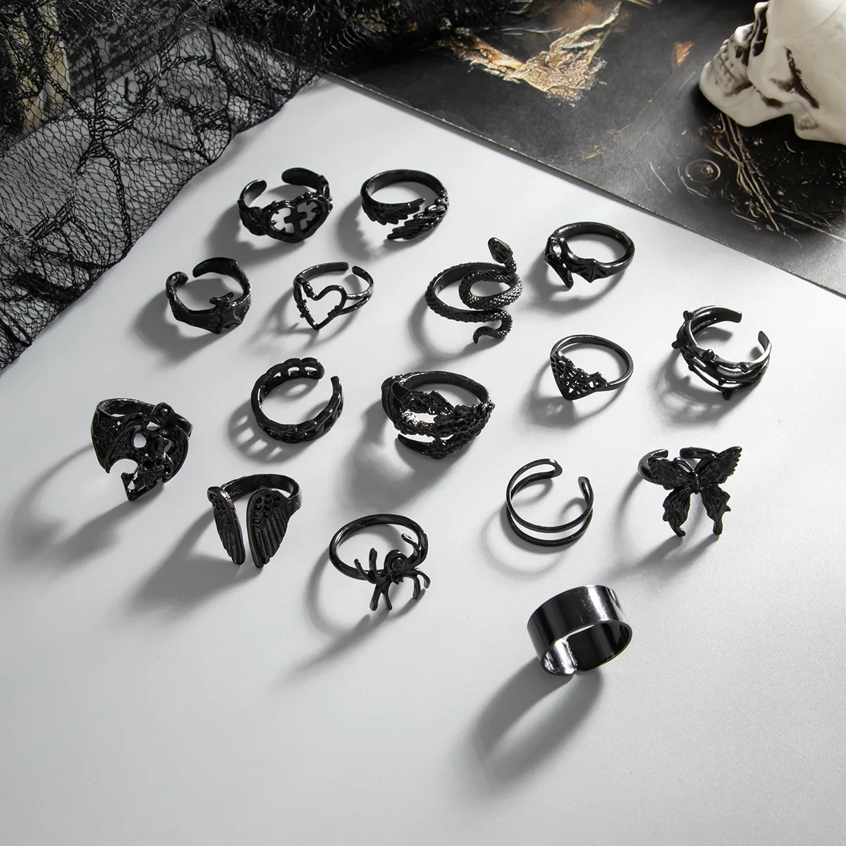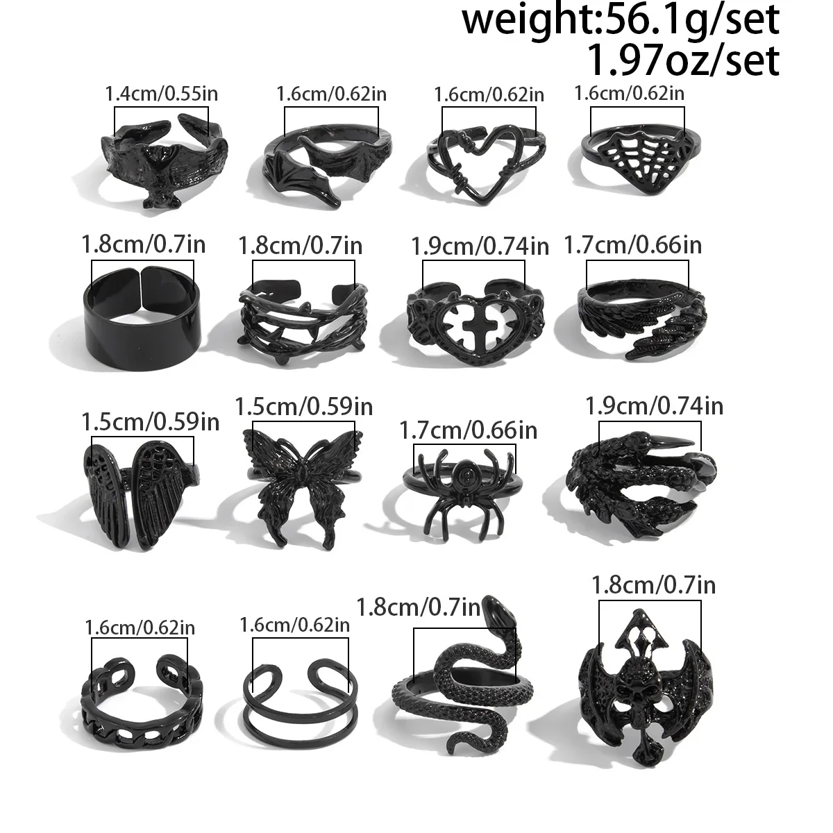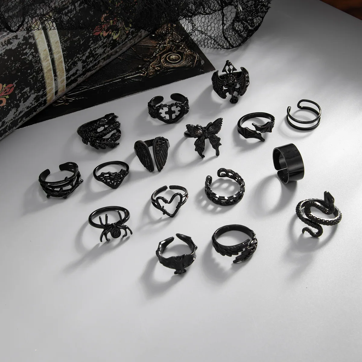 DIEZI 16pcs/set Gothic Vintage Black Finger Rings For Women Men Punk Spider Bat Geometric Knuckle Joint Ring Halloween Jewelry