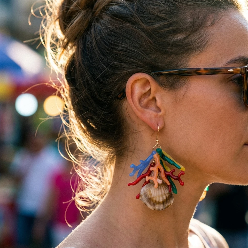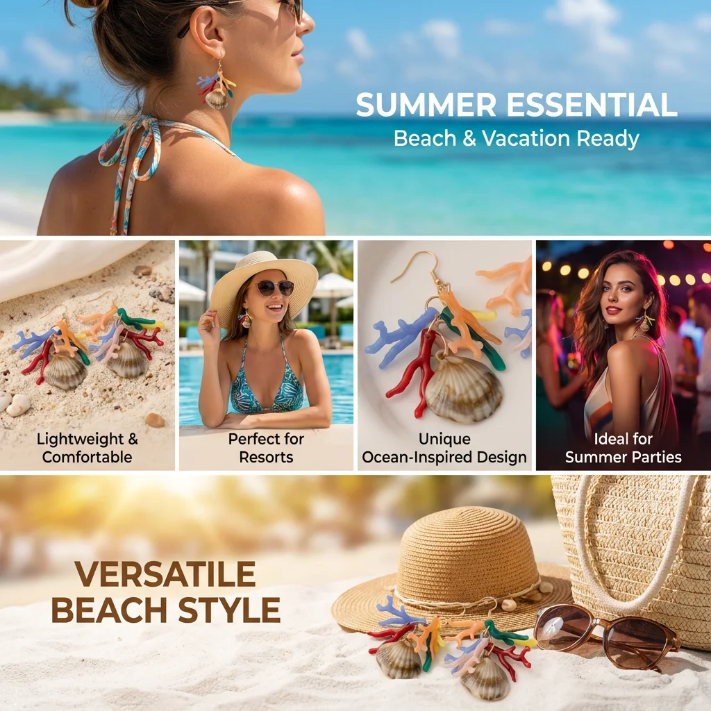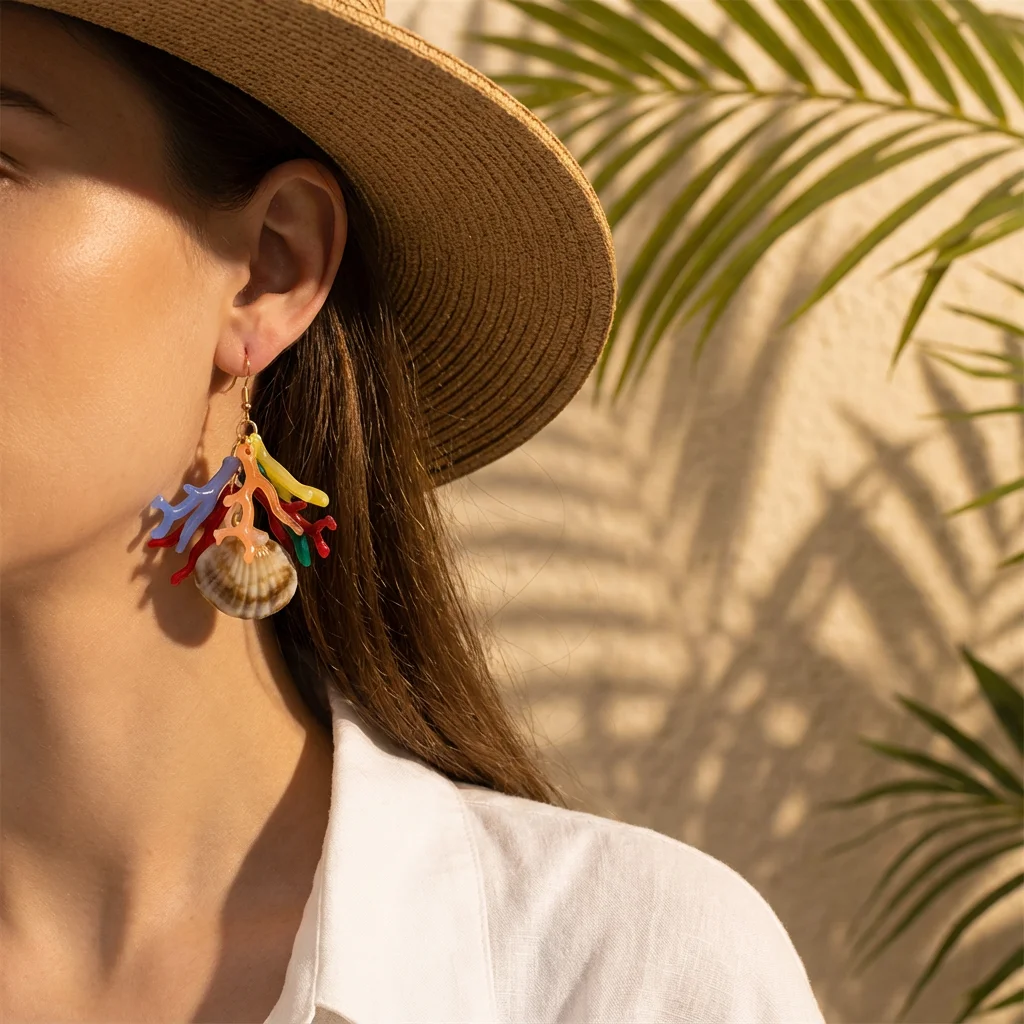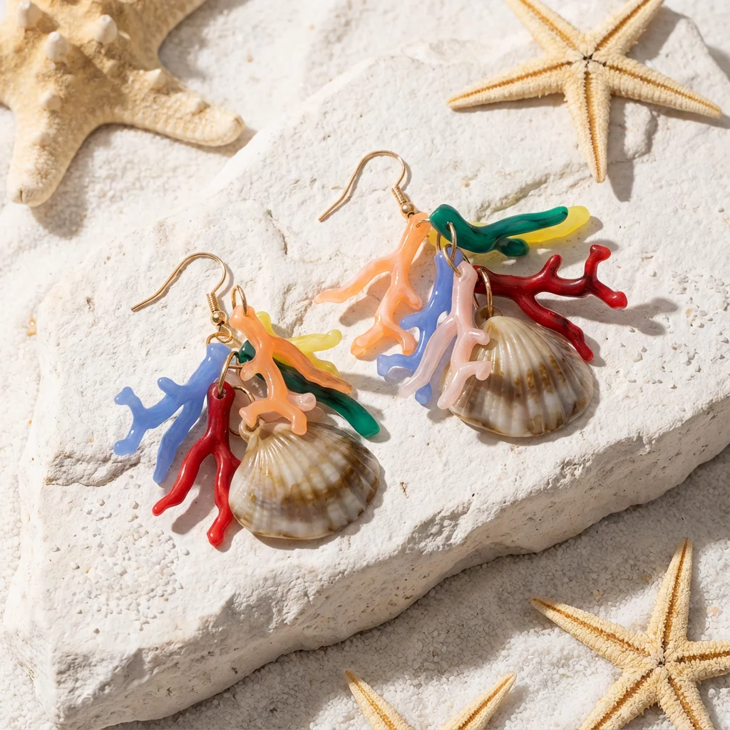 The earrings feature vibrant acrylic corals, adding a pop of color to any outfit and evoking the essence of summer beach vibes.