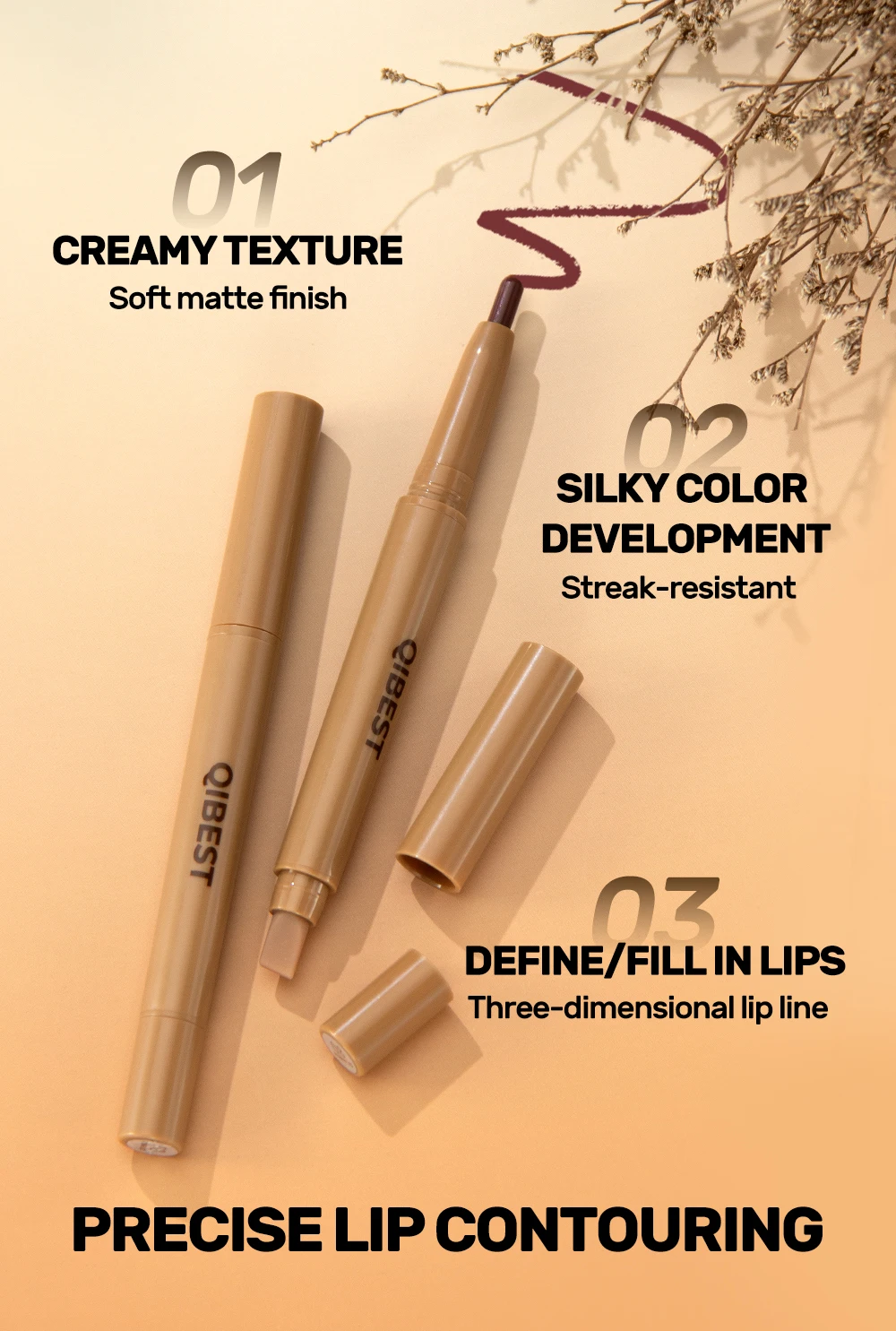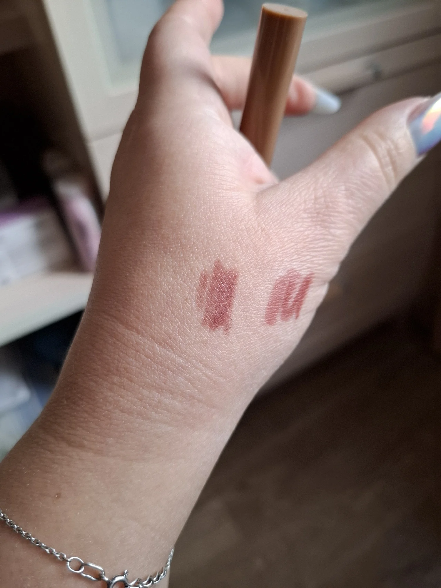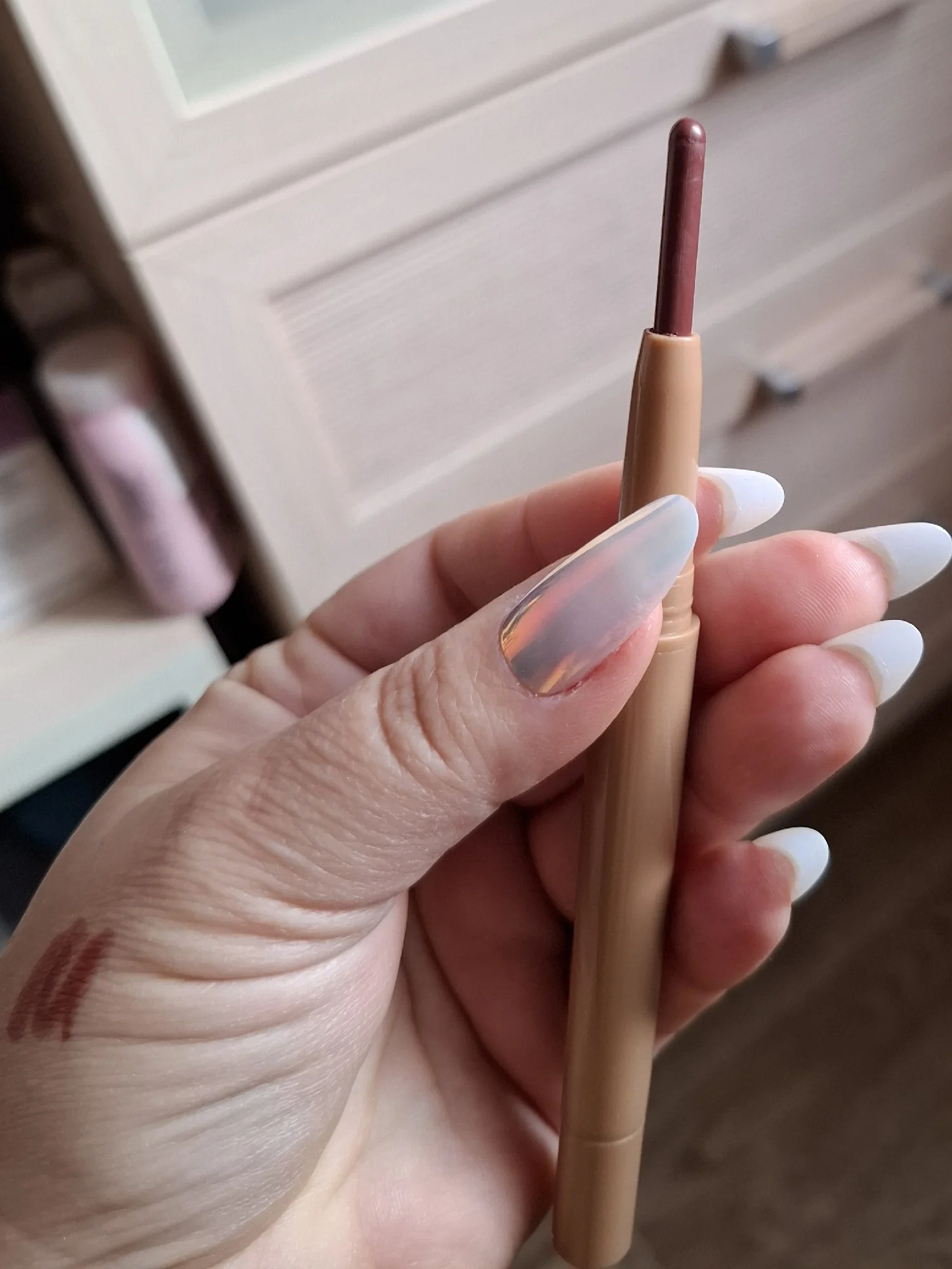 Thick and soft pencil. The color is beautiful. There's very little of it (I turned it to maximum in the photo), but the price is also very low. I didn't like the blending tail; I couldn't get used to it.
