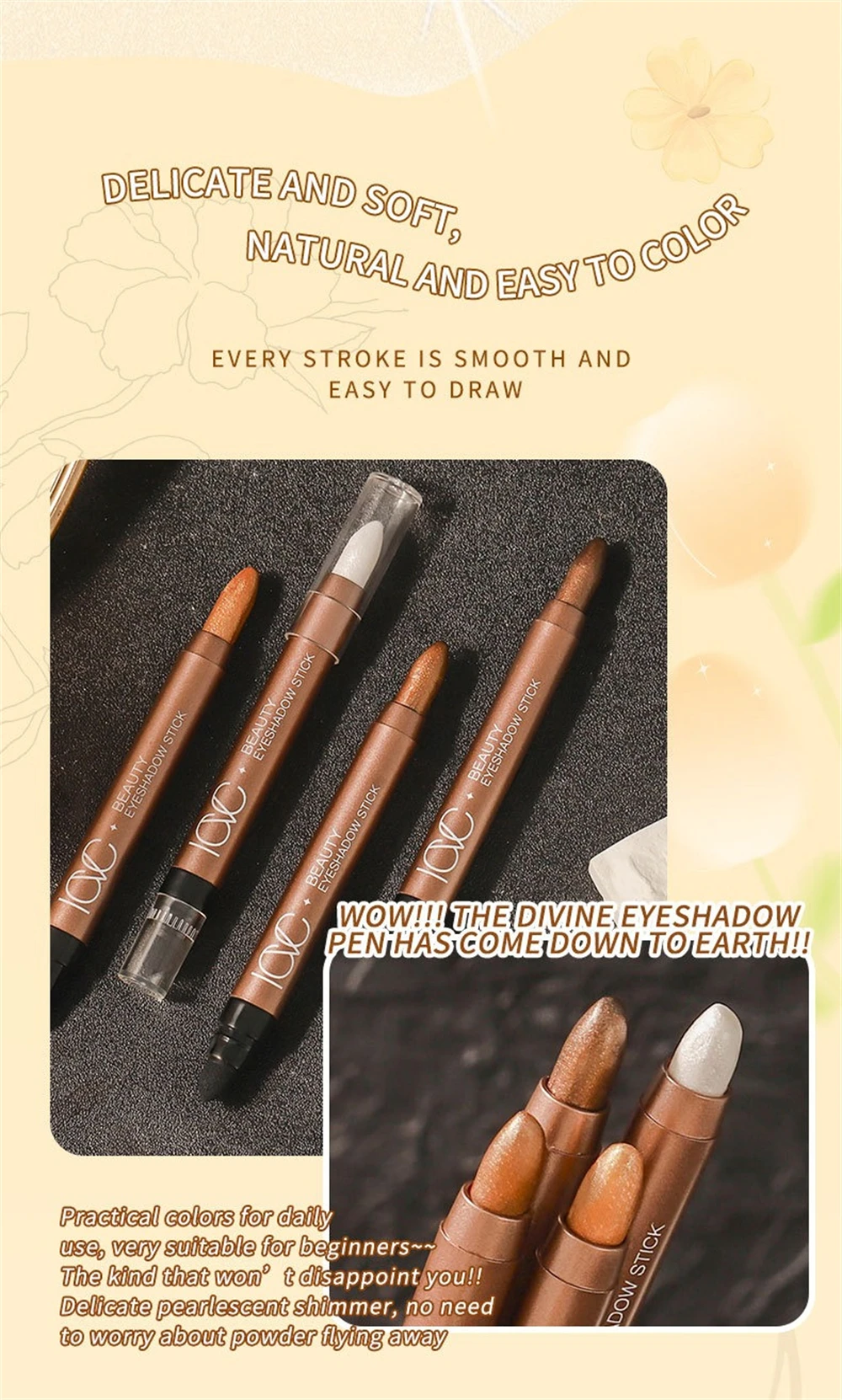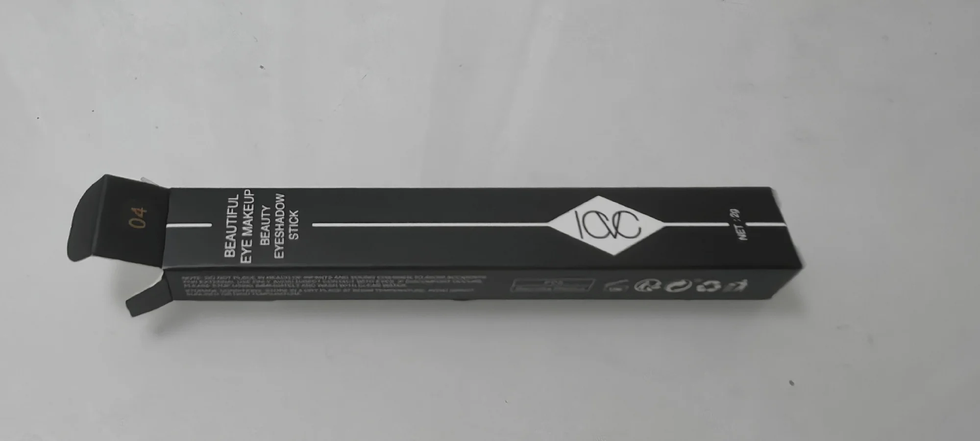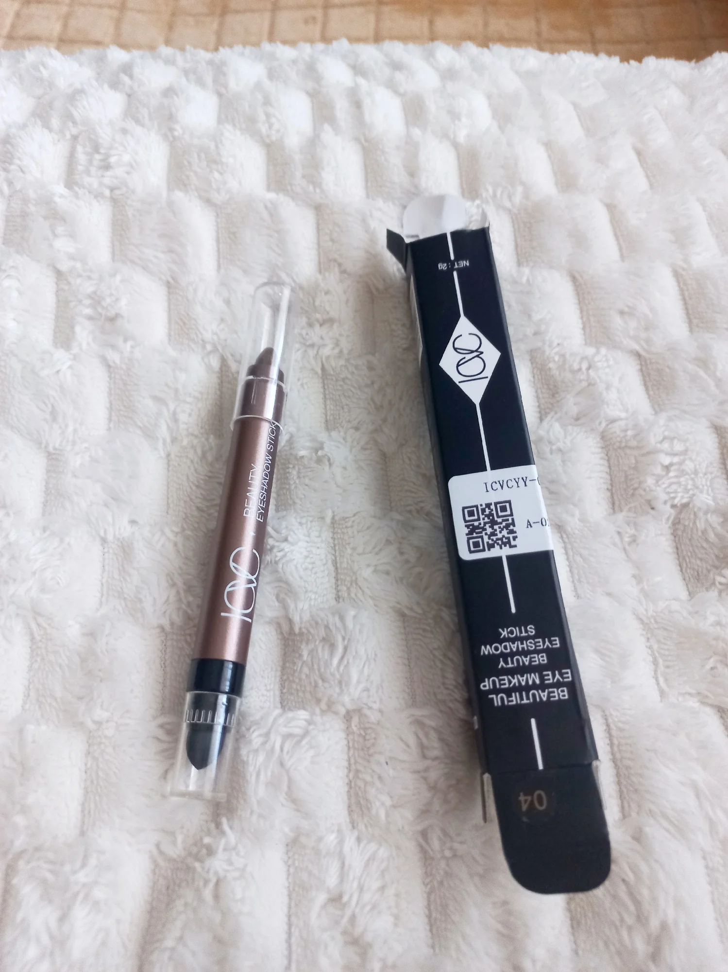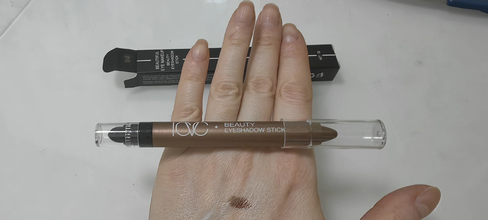 Good eyeshadow, smudges a bit. The photos show silver glitter, but in reality it's yellow. There's a sponge for blending the eyeshadow. Also includes expiration date and manufacturing date.