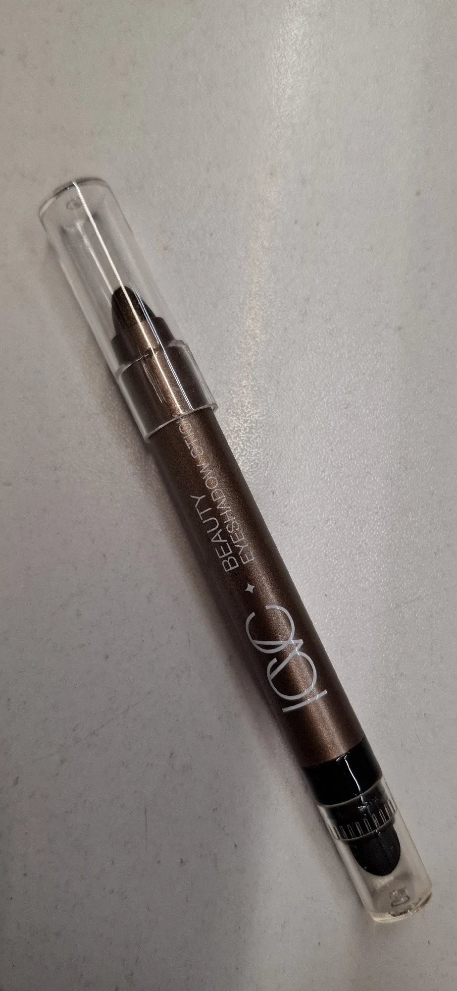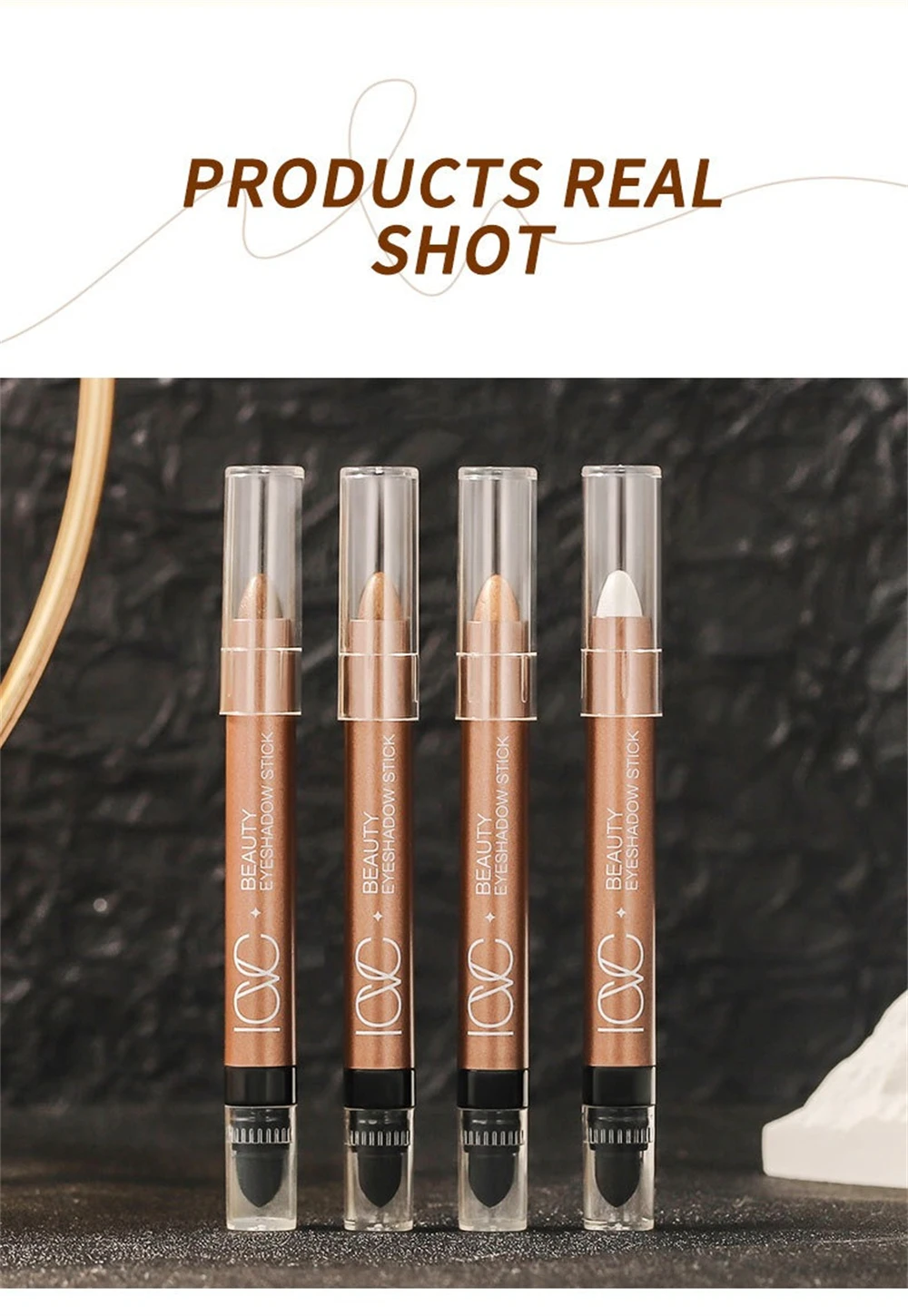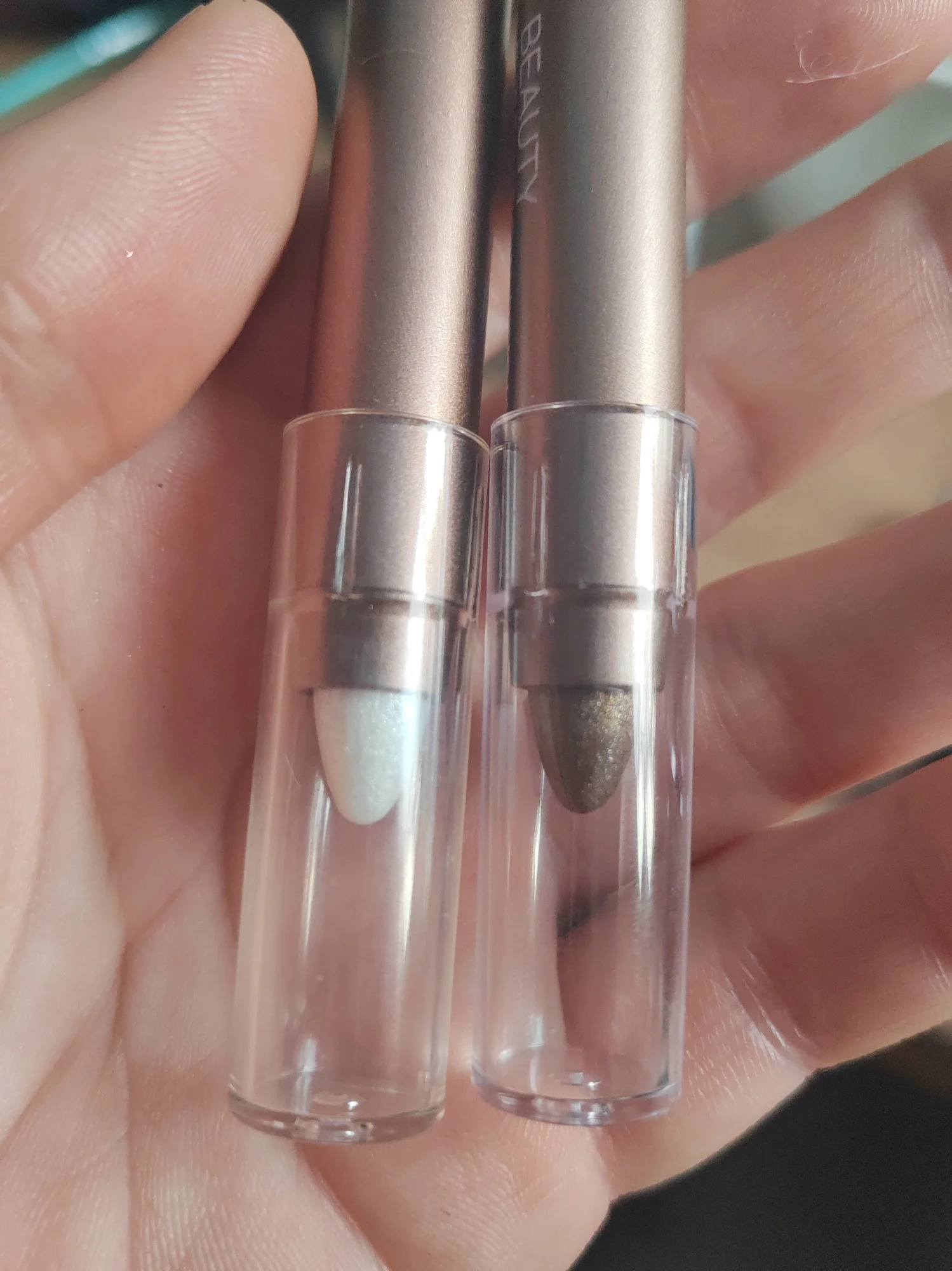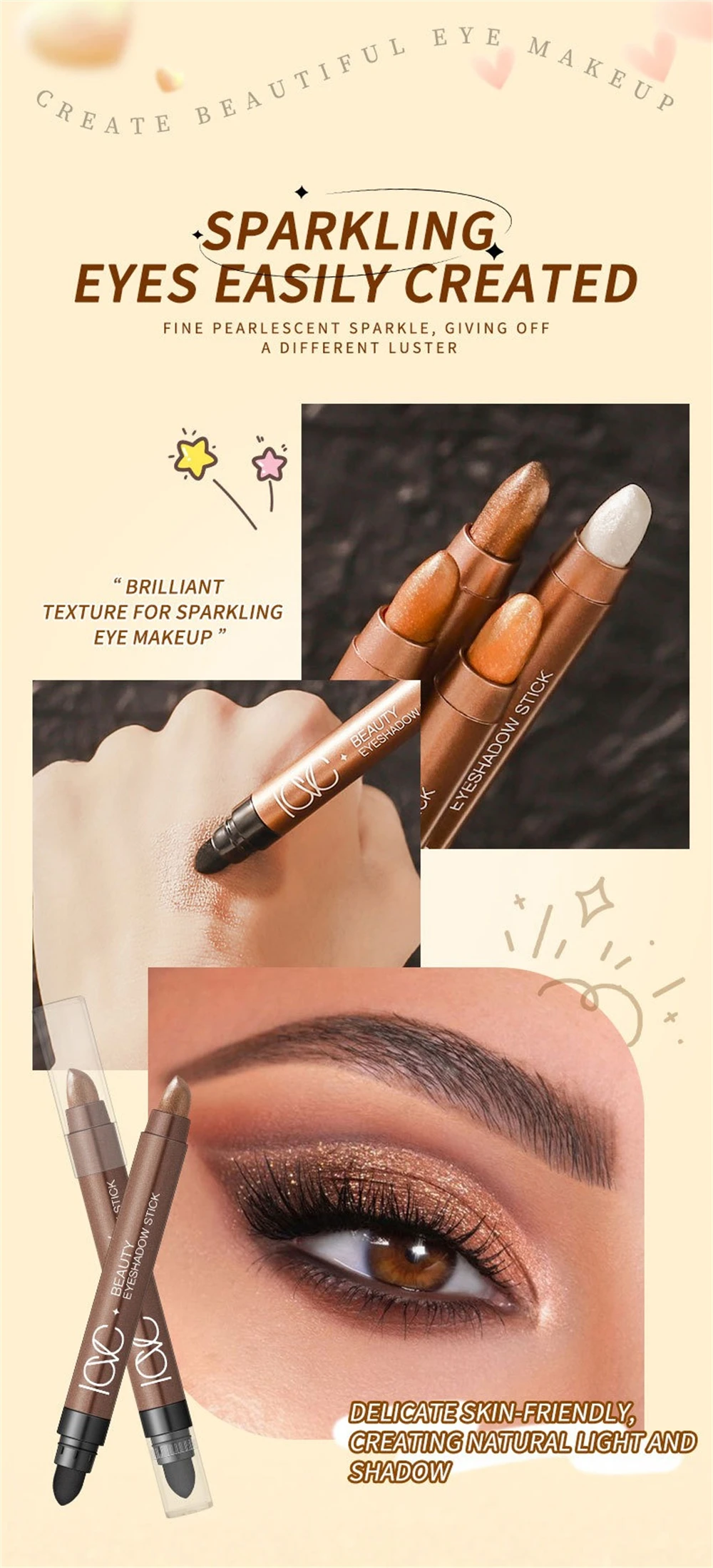 Good eyeshadow, smudges a bit. The photos show silver glitter, but in reality it's yellow. There's a sponge for blending the eyeshadow. Also includes expiration date and manufacturing date.