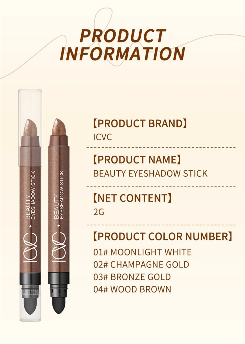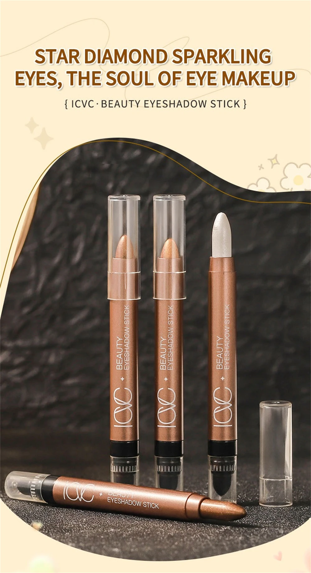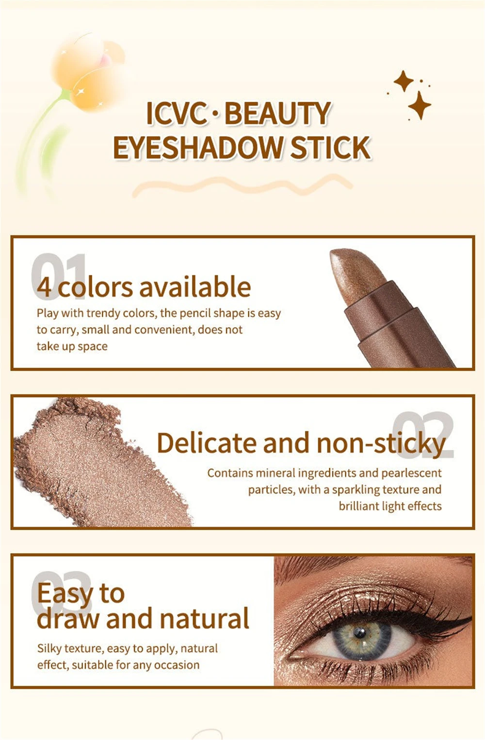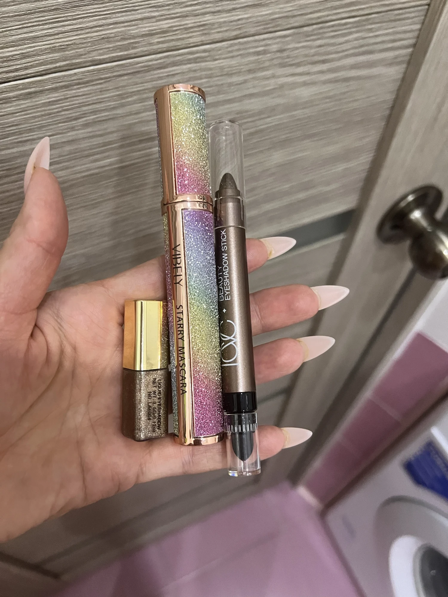 Good eyeshadow, smudges a bit. The photos show silver glitter, but in reality it's yellow. There's a sponge for blending the eyeshadow. Also includes expiration date and manufacturing date.