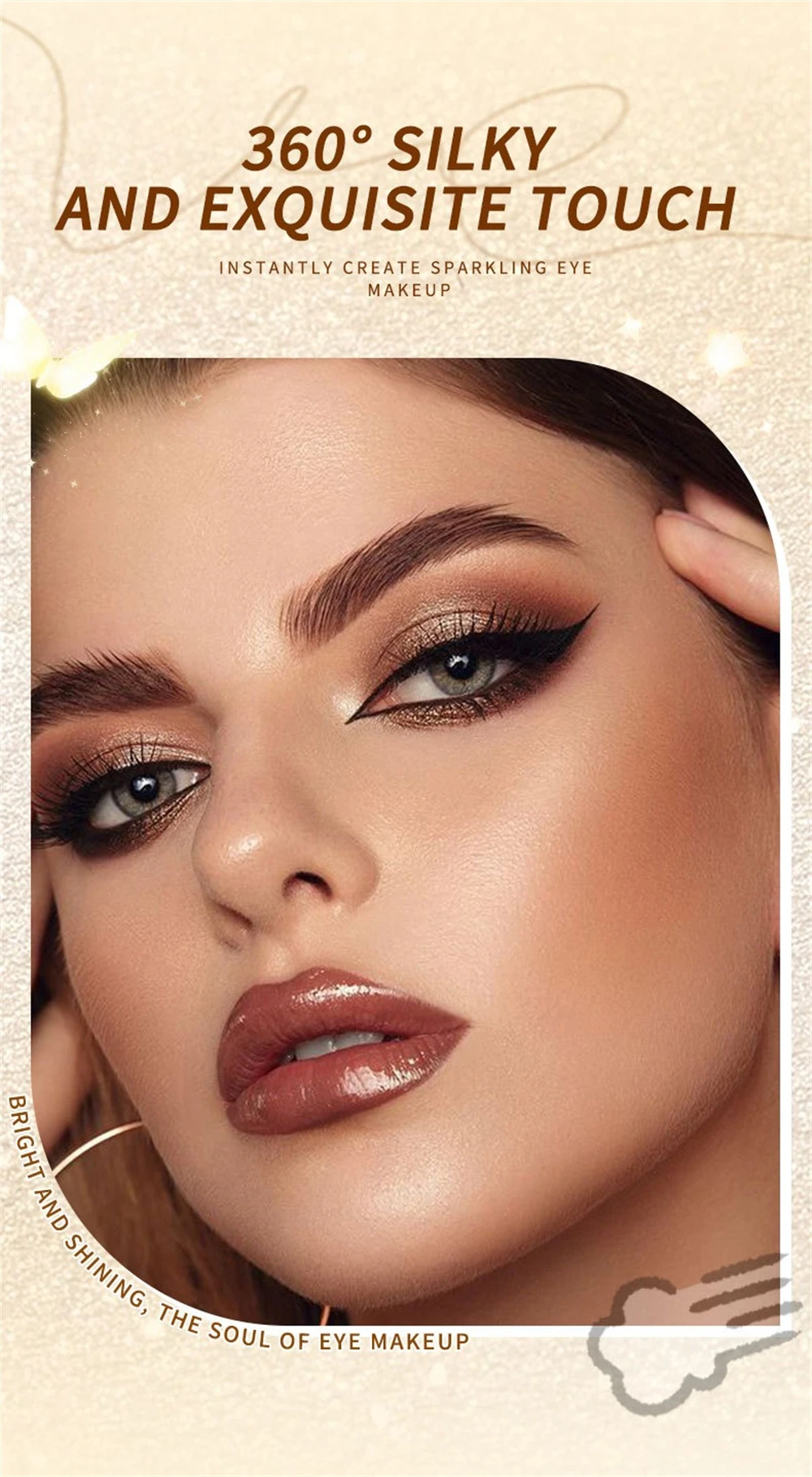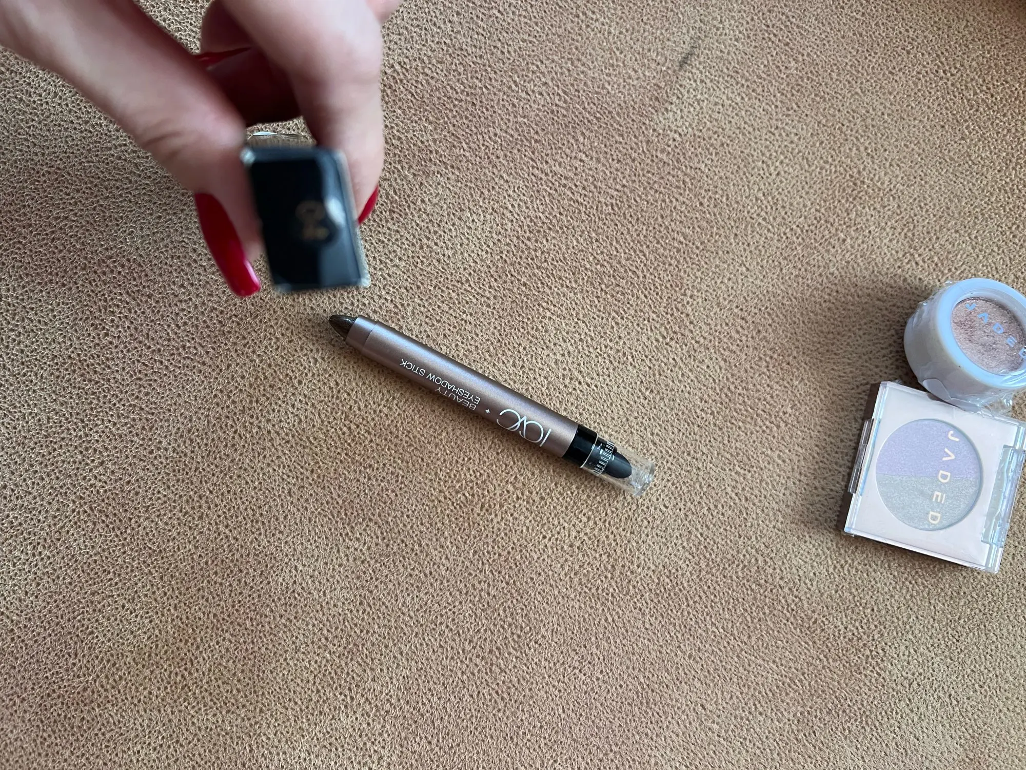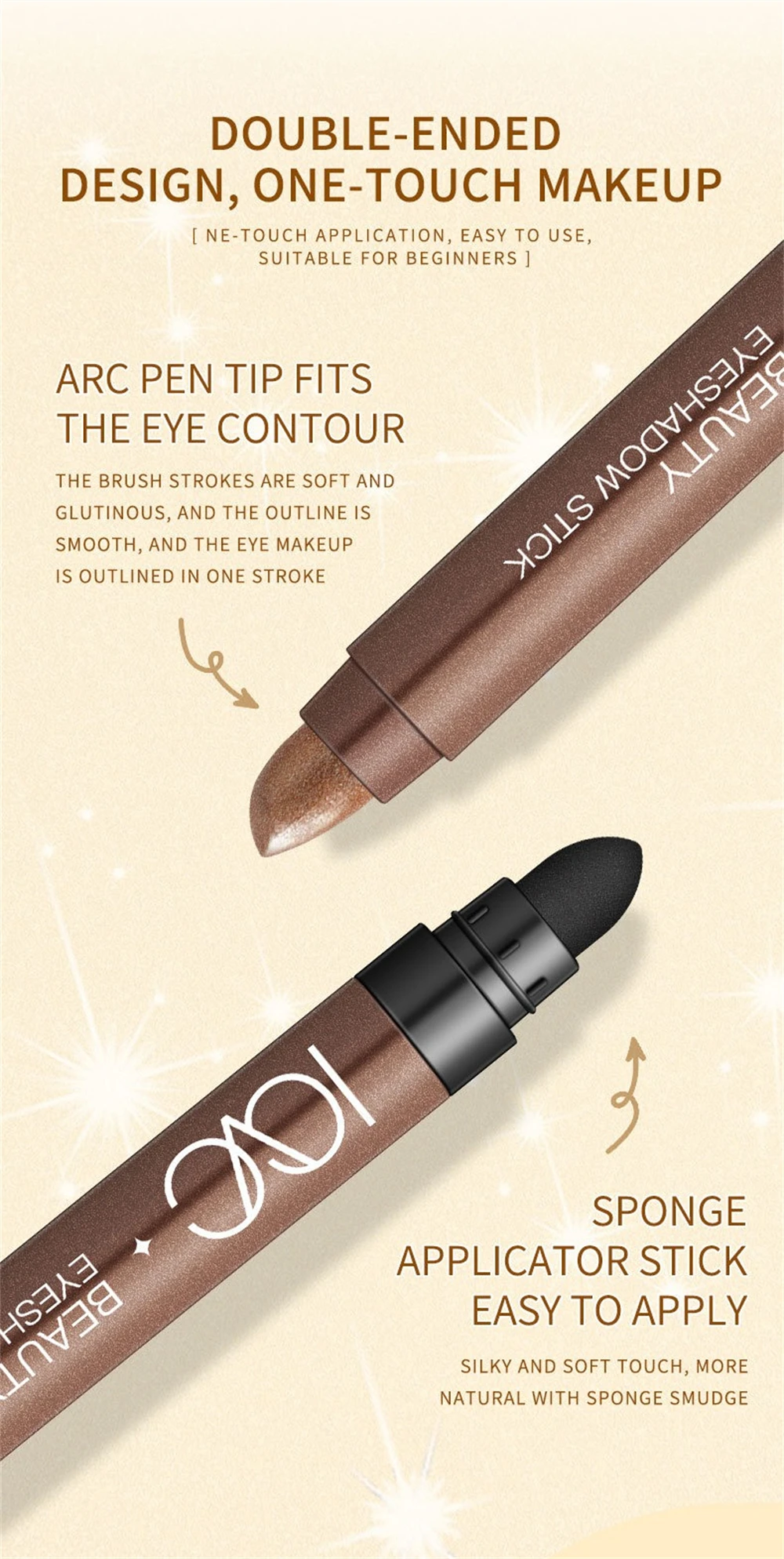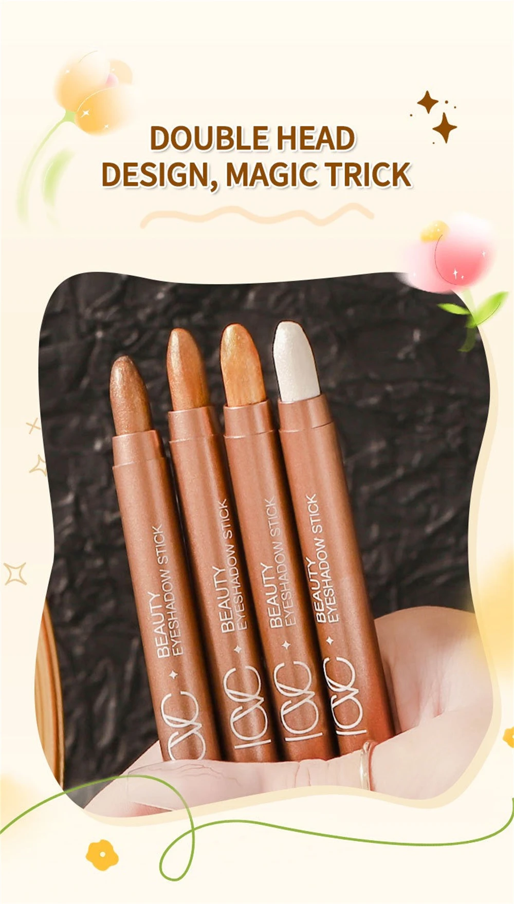 Good eyeshadow, smudges a bit. The photos show silver glitter, but in reality it's yellow. There's a sponge for blending the eyeshadow. Also includes expiration date and manufacturing date.