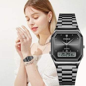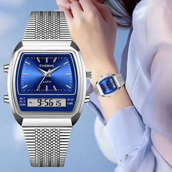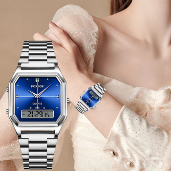 FOXBOX Elegant Fashion Electronic Wristwatch for Women Stainless Steel Dual Display Waterproof Sport Digital Quartz Woman Watch