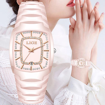 LIGE Fashion Square Quartz Woman Watches Ceramics Elegant Simple Diamond Auto Date Romantic Birthday Gift Leisure Wristwatch New