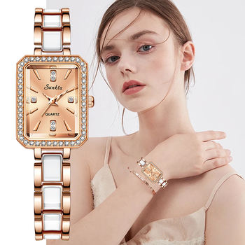 Sunkta Square Fashion Luxury Quartz Women Watch Vintage Elegant Simple Casual Diamond Ladies Wristwatches Bracelet Romantic Gift