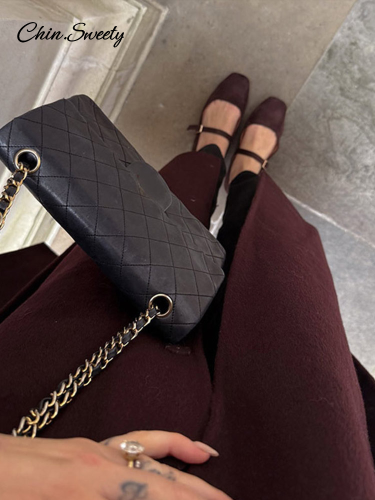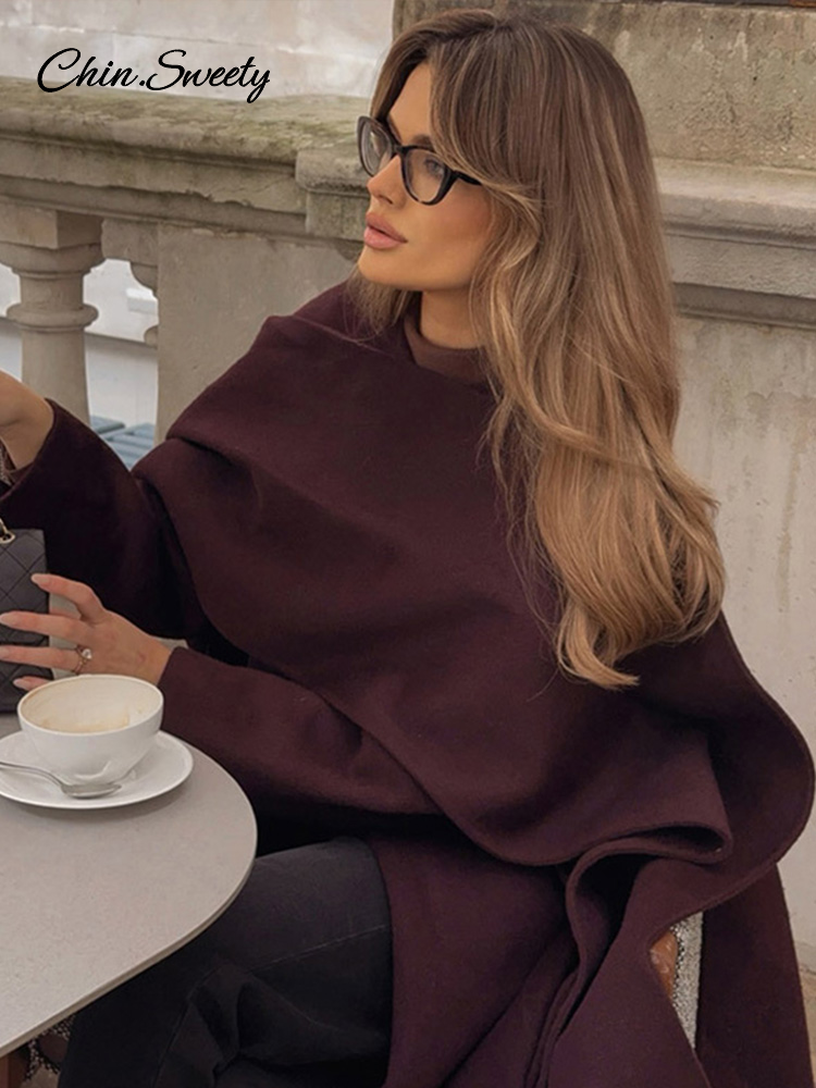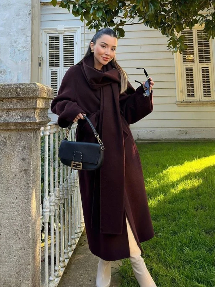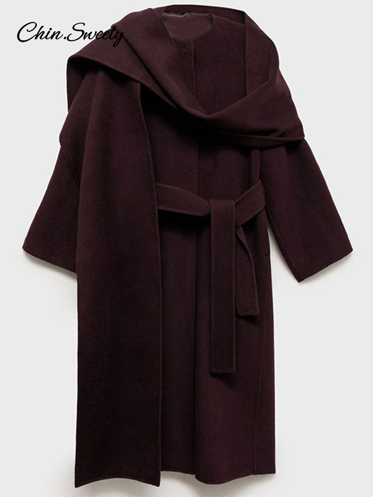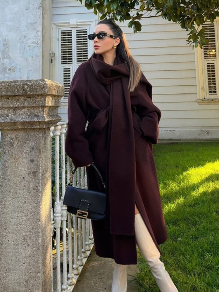 Elegant Burgundy Red Scarf Collar Coat Women Wool Lace Up Loose Long Sleeve Overcoat 2024 Autumn Winter Fashion Street Outwear