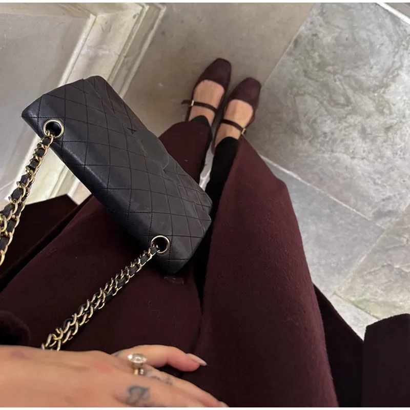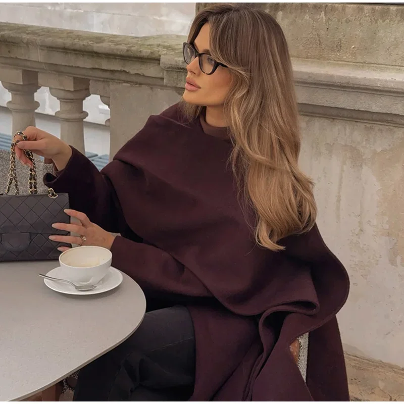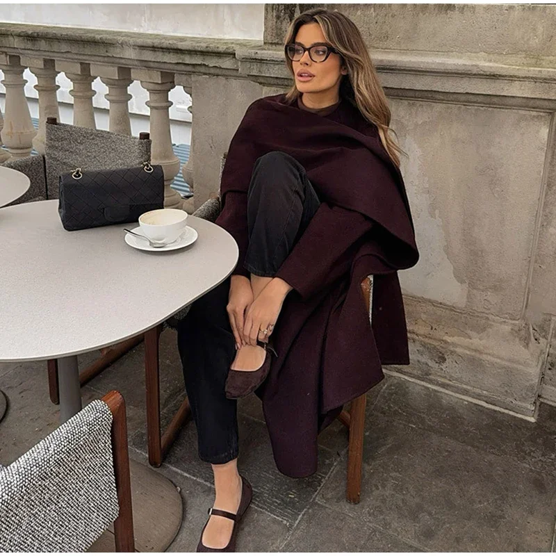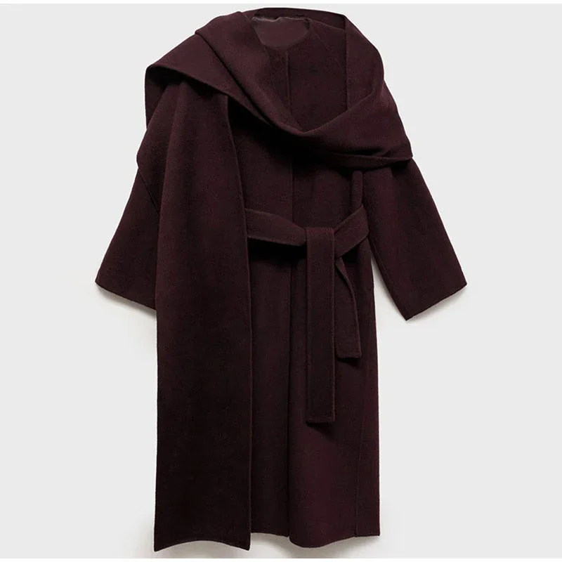 Elegant Burgundy Red Scarf Collar Coat Women Wool Lace Up Loose Long Sleeve Overcoat 2024 Autumn Winter Fashion Street Outwear