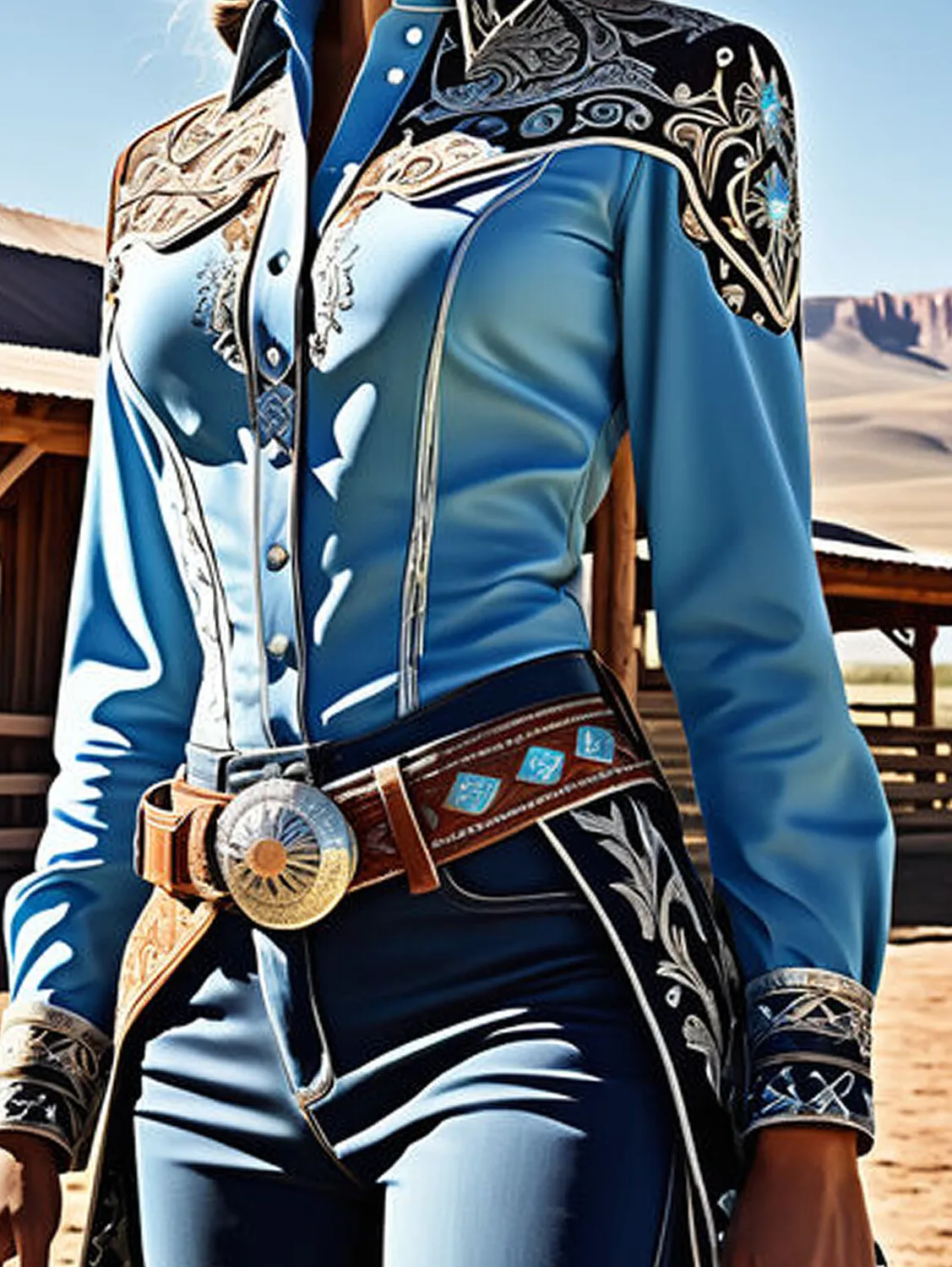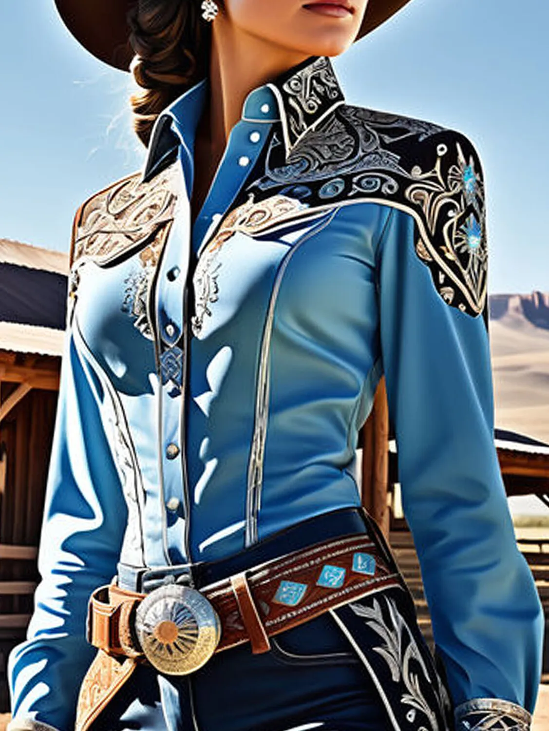 Elegant Chic Women Tops Western Print Button Turndown Collar Slim Waist Shirt Patchwork Long Sleeve Design Vintage Blouse