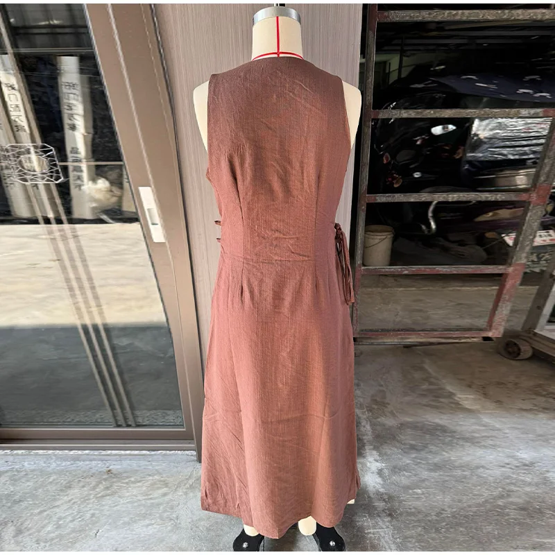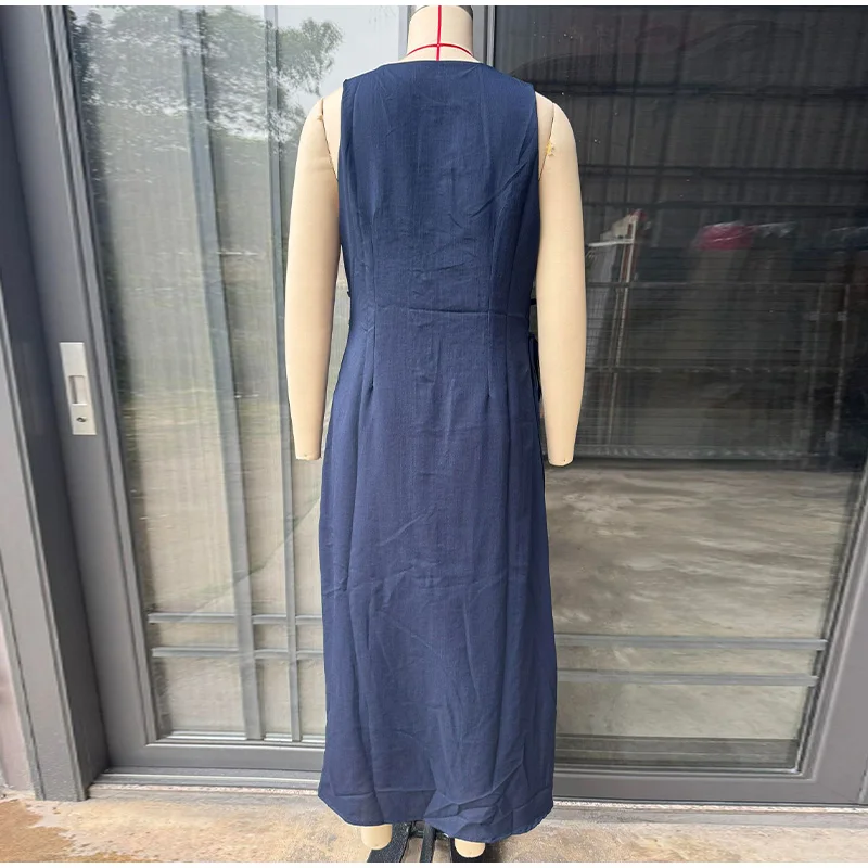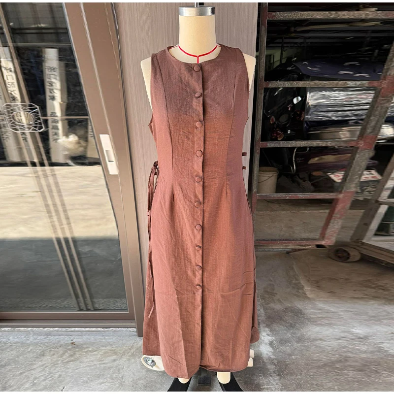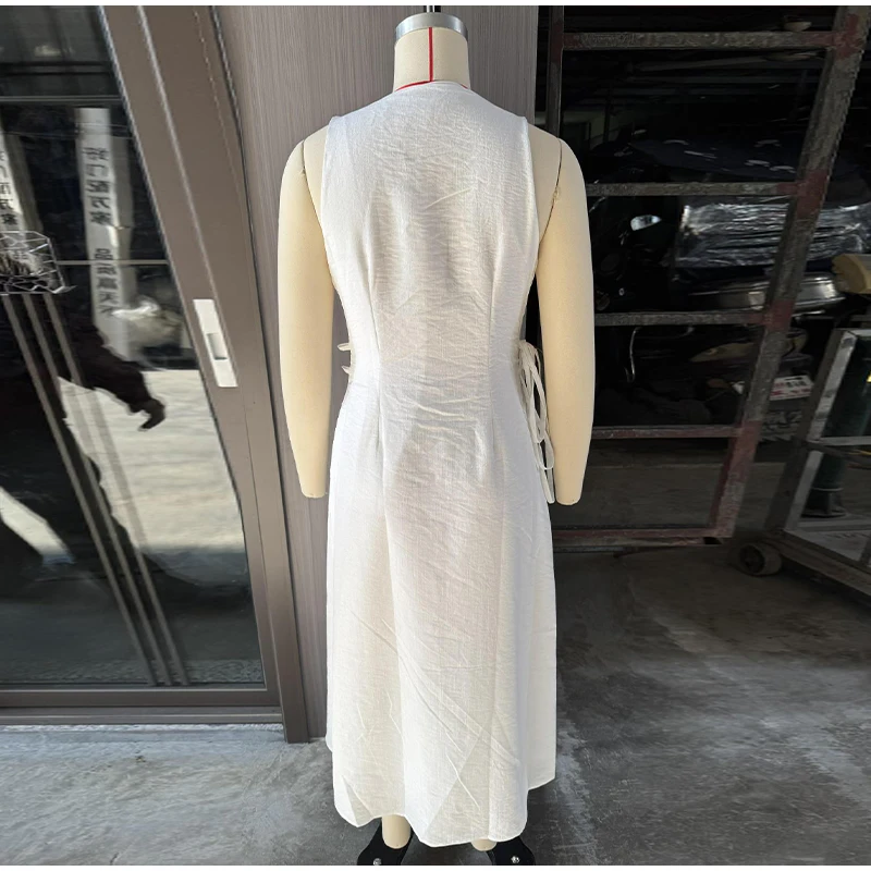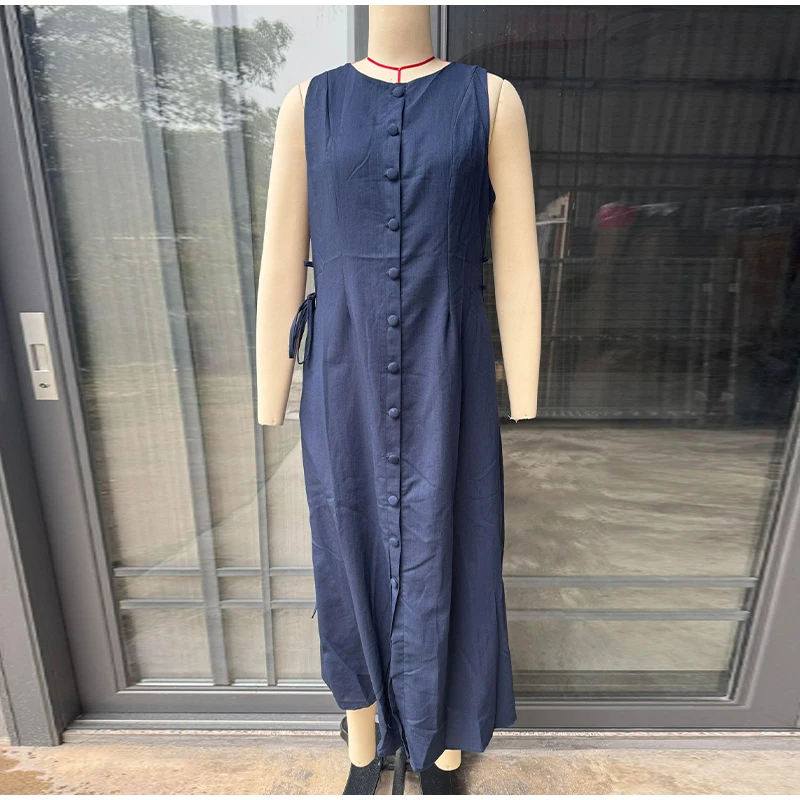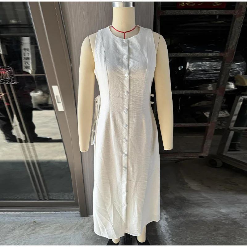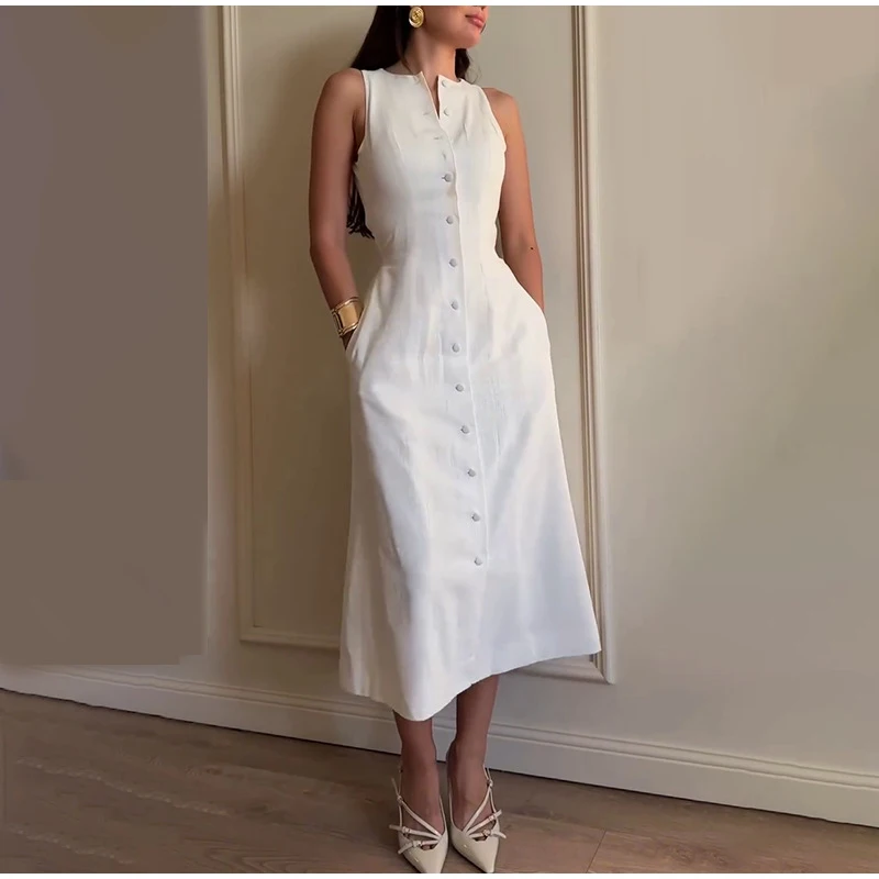 Elegant Cotton Linen Dress Women Loose O Neck Single Breasted Sleeveless Vestido Female 2025 Spring Summer Casual Lady Dress