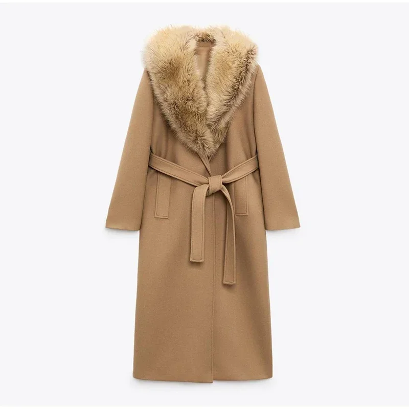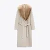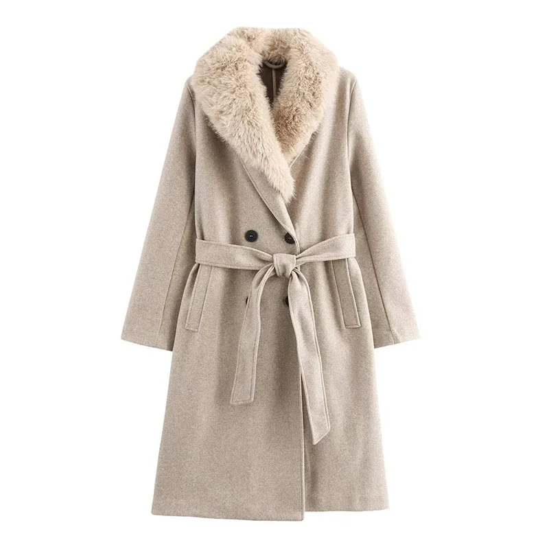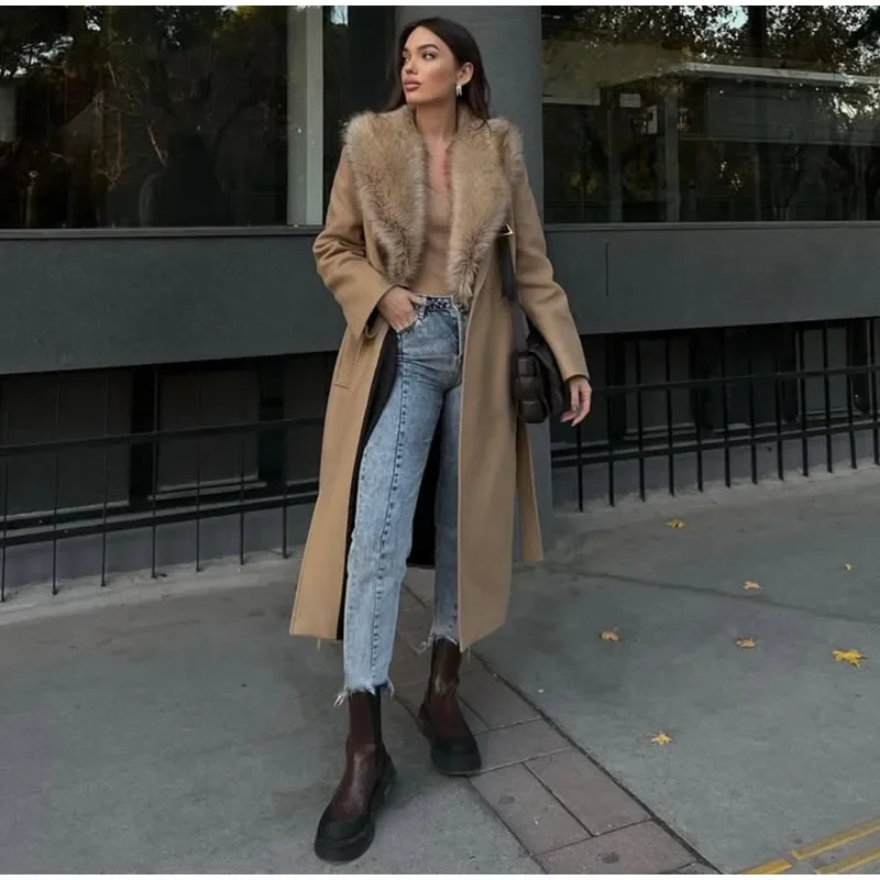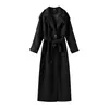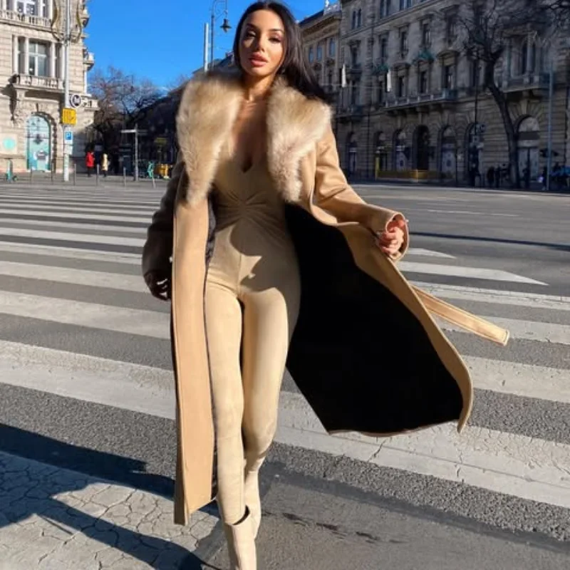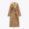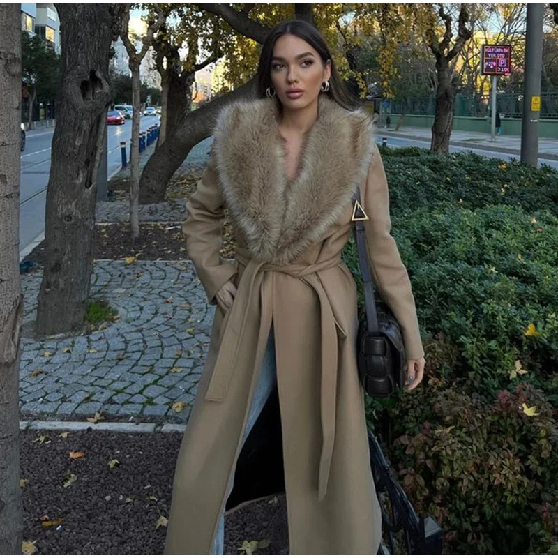 Elegant Fur Lapel Maxi Coats Women High Street Lace Up Full Sleeve Pocket Wool Long Overcoats 2024 Winter New Lady Outwear