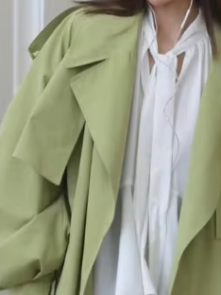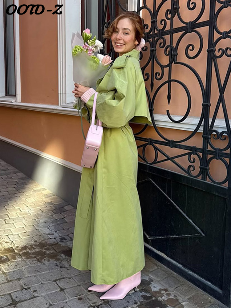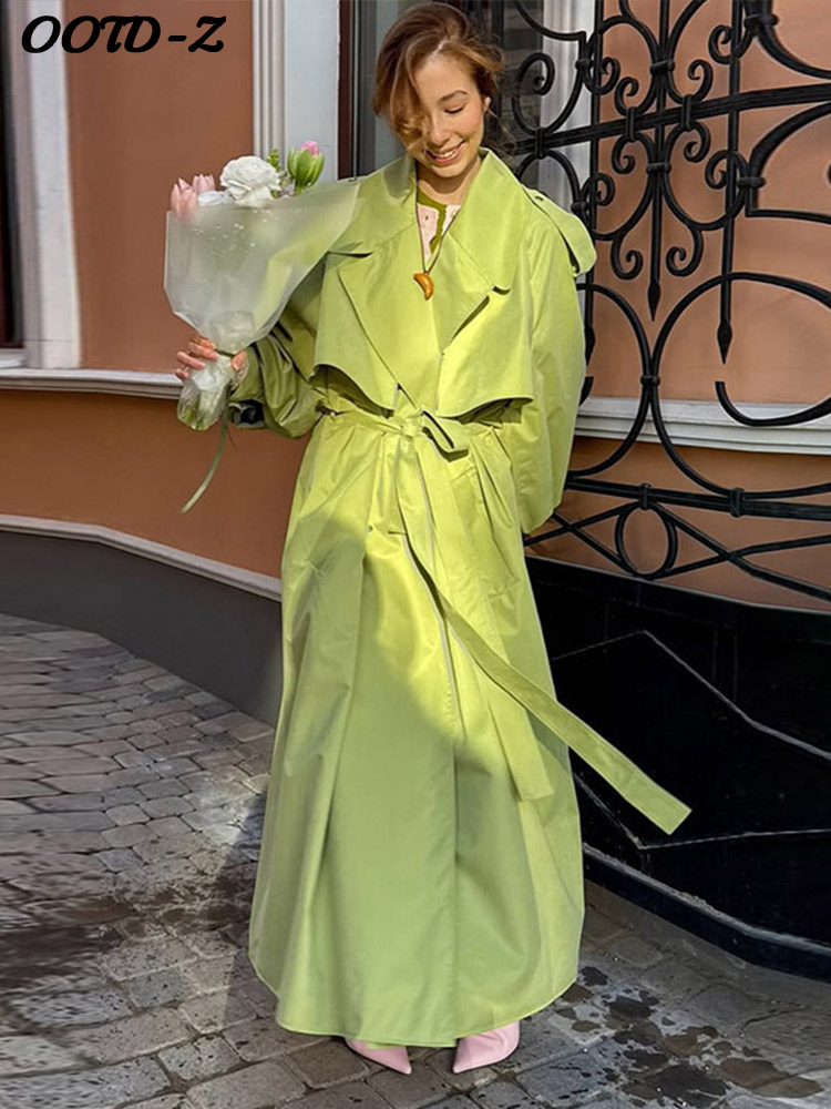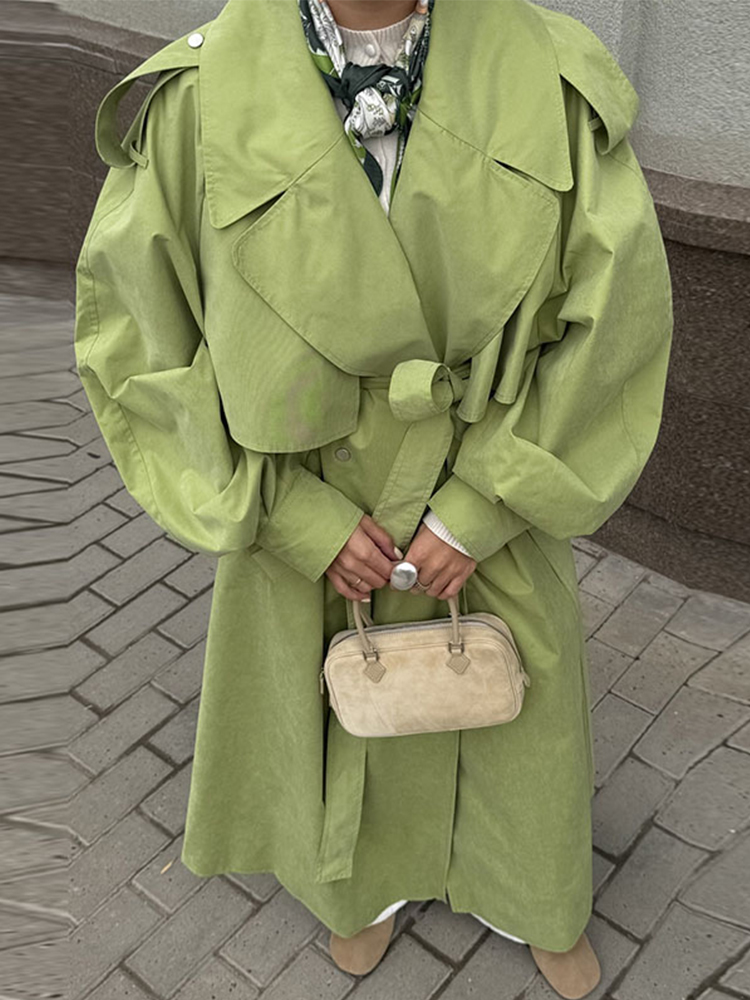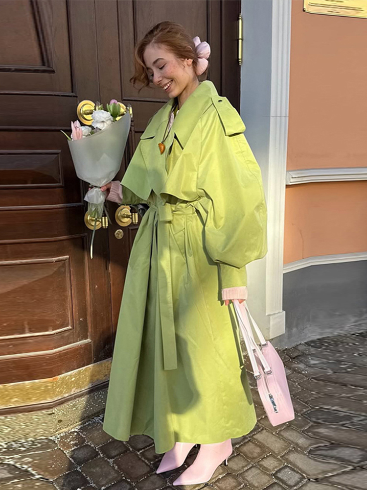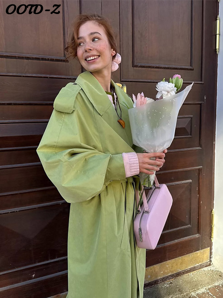 Elegant Green Trench Long Coats Women Loose Lapel Lace Up Buttons Full Sleeves Jackets Female 2025 Autumn Vibrant Lady Outwears